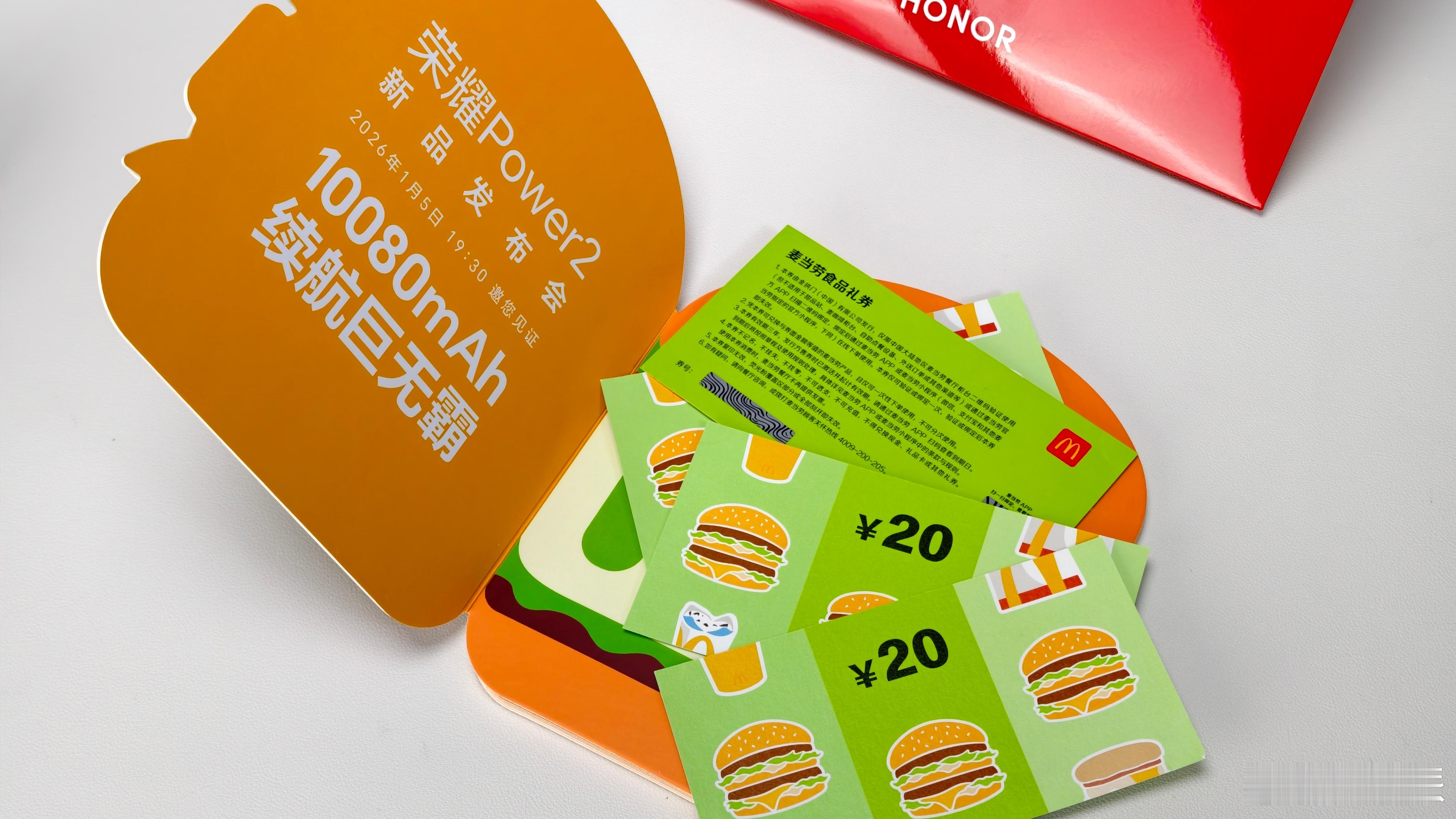收到明晚19:30荣耀Power2发布会邀请函了,一个内含4张麦当劳食品礼券的“巨无霸汉堡”。续航彻底革新,信号稳如基站,性能持续狂飙,防护无懈可击。作为户外轻旗舰,这一代,不止量大管饱,更重塑对户外体验的想象边界!荣耀Power2 发布会值得期待。一会儿评论区选几个要求的老铁,每人送一张20元的麦当劳食品礼券