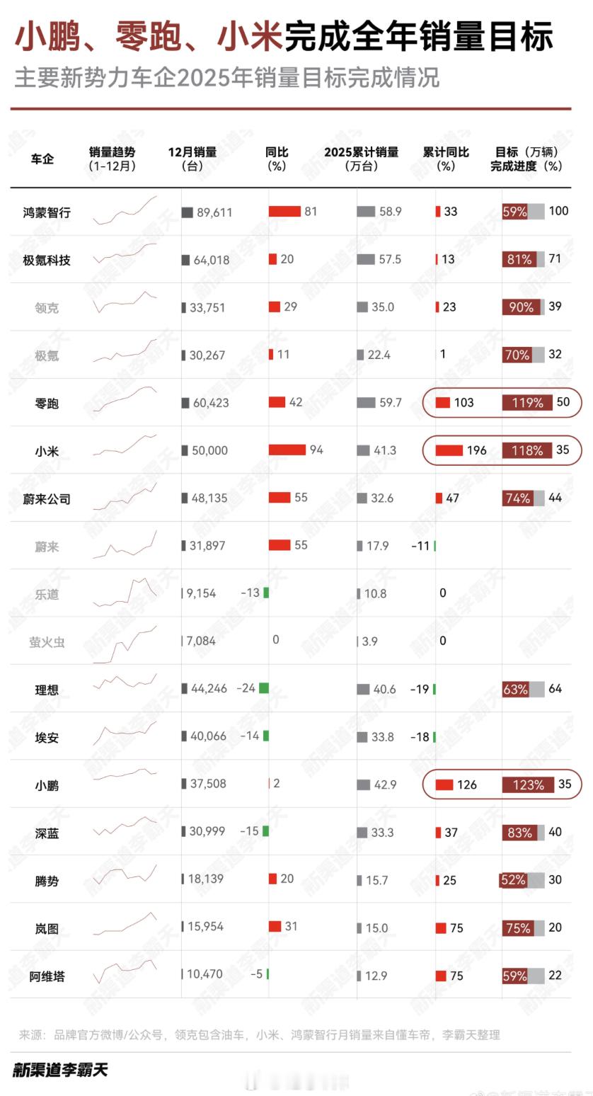 来自的 2025 年主要新势力车企销量目标完成表,看下来只有小鹏、零跑、小米成功了。26 年的竞争只会更激烈,你认为这一年完成销量目标的车企会更多吗?42how小鹏汽车零跑汽车小米汽车