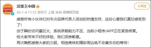11时12分,@汉堡王中国发文回应:“感谢所有小伙伴们对本次品牌代言人活动的热情支持,这份心意我们真切感受到了!由于瞬时访问量巨大,系统承载能力不足,当前小程序/APP正在紧急修复。给大家带来不好的体验,我们深表歉意。再次鞠躬感谢大家的力挺,相信美味和精彩周边绝不会辜负你的等待!”