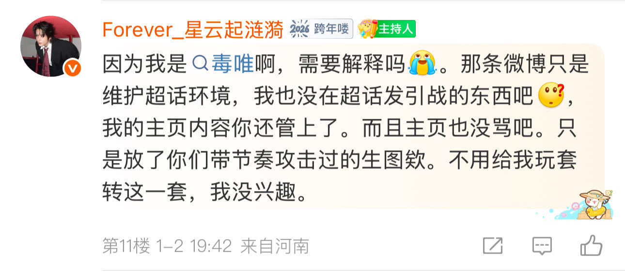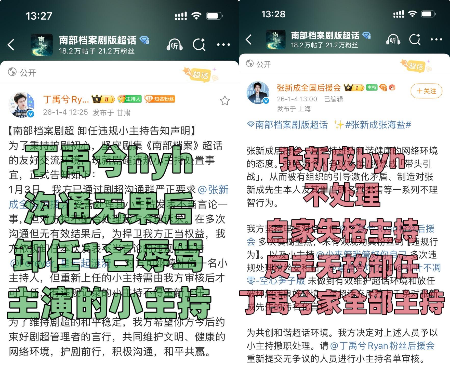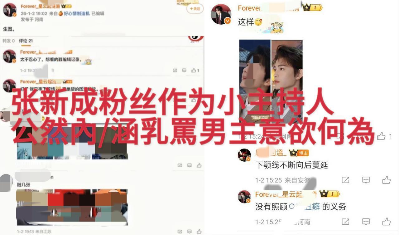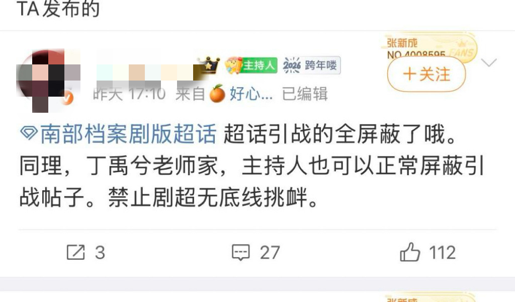 张新成方官超小主持罔顾基本职责,长期在官超内发布、纵容针对一番主演丁禹兮的污名化言论,恶意P图及辱骂内容累计高达上千条。更令人愤慨的是,张新成方主持利用管理权限,擅自屏蔽丁禹兮粉丝的大量正常安利帖,严重违背了维护官超和谐宣传环境的职责。在发现上述违规行为后,丁禹兮粉丝始终坚持先行沟通,但在沟通无果且对方持续作恶的情况下,才无奈动用管理权限卸任违规人员。然而,方大主持却无视客观证据,恶意卸任无辜管理人员,让丁禹兮及其粉丝遭受无妄之灾。对此,我们坚决支持丁禹兮后援会的理性决定,诉求公正处理,还剧宣环境一片清朗。