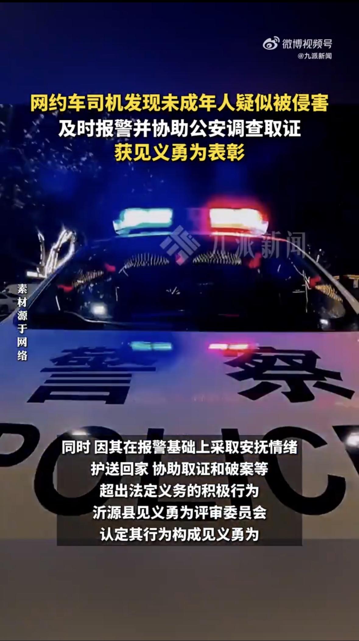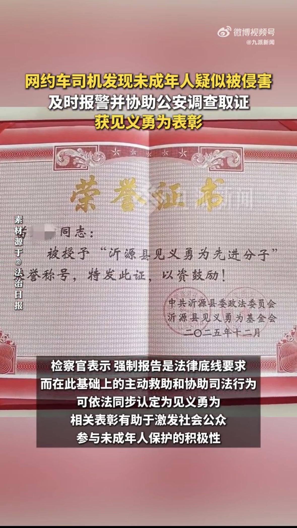 如果你是网约车司机,深夜接到一个眼神躲闪、浑身发抖的小女孩,你会留心多问一句吗?山东这位苗师傅,就因这“多管闲事”的一问,救了一个孩子。 小女孩从外地来见网友,却遭暴力侵犯。她吓得不敢说,是苗师傅察觉异样,耐心安抚她才吐露真相。她怕报警,怕报复,苗师傅二话没说,直接开车把她送回家,面对面向她父母讲明一切,又陪着女孩父亲去报案,全程配合调查,协助警察锁定嫌疑人,推动案件的侦破。 这事之后,苗师傅被评为了见义勇为先进分子。我觉得特别对!法律是冷的,但人心是热的。能在关键时候伸手拉一把,护住一个孩子的未来,这份勇气和价值,远不止那3000元奖金的分量。 希望更多行业的人都能像苗师傅这样,眼里有光,心里有担当。有时候,你的一句话,一次举手之劳,真的能改变别人的一生,甚至挽回一条生命。