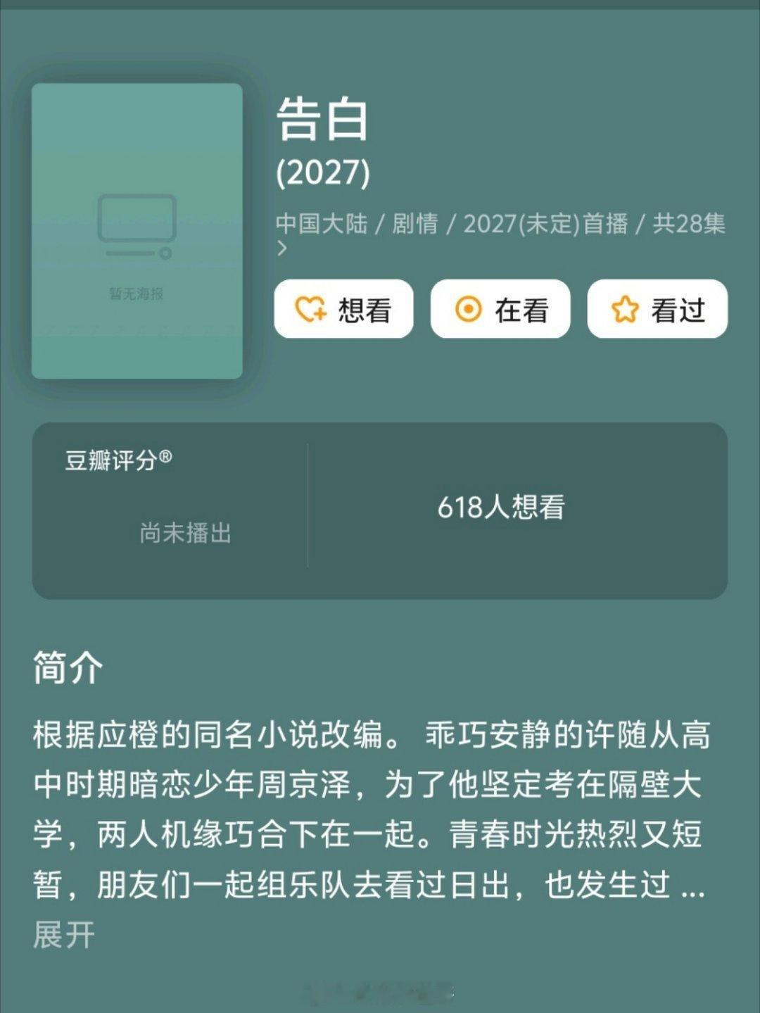 🥭新剧《告白》主演:王星越、邓恩熙、左叶、孙寈惠导演:张笑安(深情眼、暗格里的秘密)时间:1月中旬开机根据应橙的同名小说改编。 乖巧安静的许随从高中时期暗恋少年周京泽,为了他坚定考在隔壁大学,两人机缘巧合下在一起。青春时光热烈又短暂,朋友们一起组乐队去看过日出,也发生过因少年热血而打赌比赛的事。尽管相处时光美好,但两人因误会分开。重逢时,两人已是截然不同的人生,女生成为了优秀的外科医生,周京泽却遭人陷害困在了尘土飞扬的一方训练基地中。两人在试探相处中,周京泽步步紧逼,而许随退无可退,发现自己还是放不下他。周京泽发现了女生青春暗恋的秘密。最终两人一起突破重重困难走到一起,与此同时,好朋友胡茜西因为心脏病告别了这个世界,留下盛南洲一个人。周京泽重拾梦想,加入了中国空中救援队,许随也随之加入了医疗救护队,青春里的暗恋最后有了一个好的结尾。