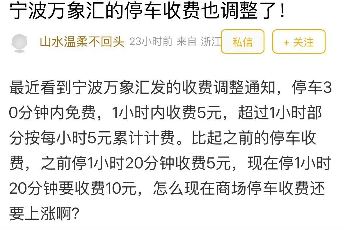 宁波商场停车费涨声一片引消费者吐槽 消费5000块才能抵扣20块的停车费!宁波商场停车费“涨”声一片,消费者直呼:吃相越来越难看!宁波网友“最爱啃玉米”就分享了自己的遭遇,在万象城吃饭,排队时间久了点,等吃完准备离开时,看到停车费的积分抵扣规则,简直惊掉了下巴。无独有偶,宁波万象汇最近也发布了停车收费调整通知,这一调整,可让消费者们炸开了锅。根据新的收费标准,停车30分钟内免费,1小时内收费5元,超过1小时部分按每小时5元累计计费。之前在万象汇停车1小时20分钟,收费只要5元;可按照新的收费标准,同样停1小时20分钟,却要收费10元。怎么现在商场停车收费还要上涨啊?来源:东方热线