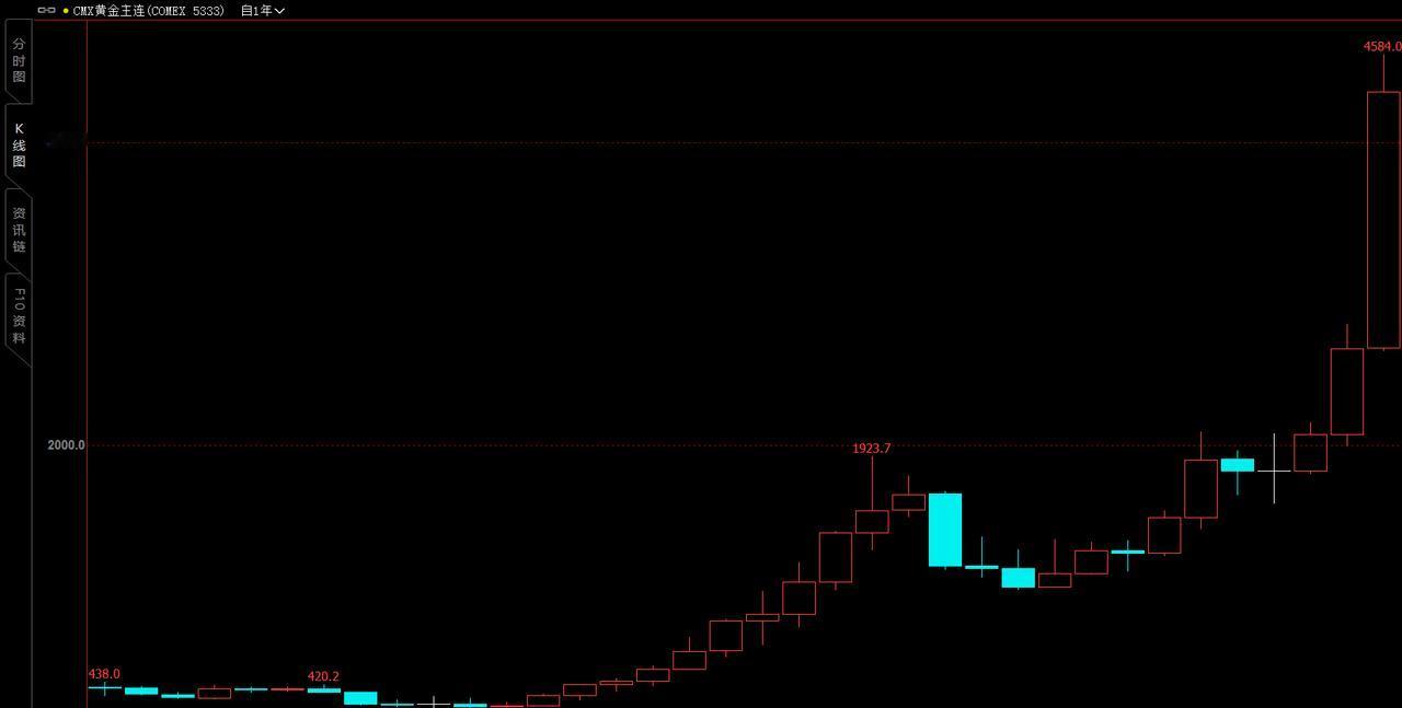 从国际金价(纽约黄金期货) 走势图形中,可以明显看出: 黄金处于牛市中, 近几年持续飙升。 刚刚过去一年, 更是豪横上涨, 最高升至4584美元,再创历史新高。 不但是连续第三年上涨, 年度涨幅也创下历史之最。 面对豪横上涨的金价, 期货小褚建议大家观望为主!