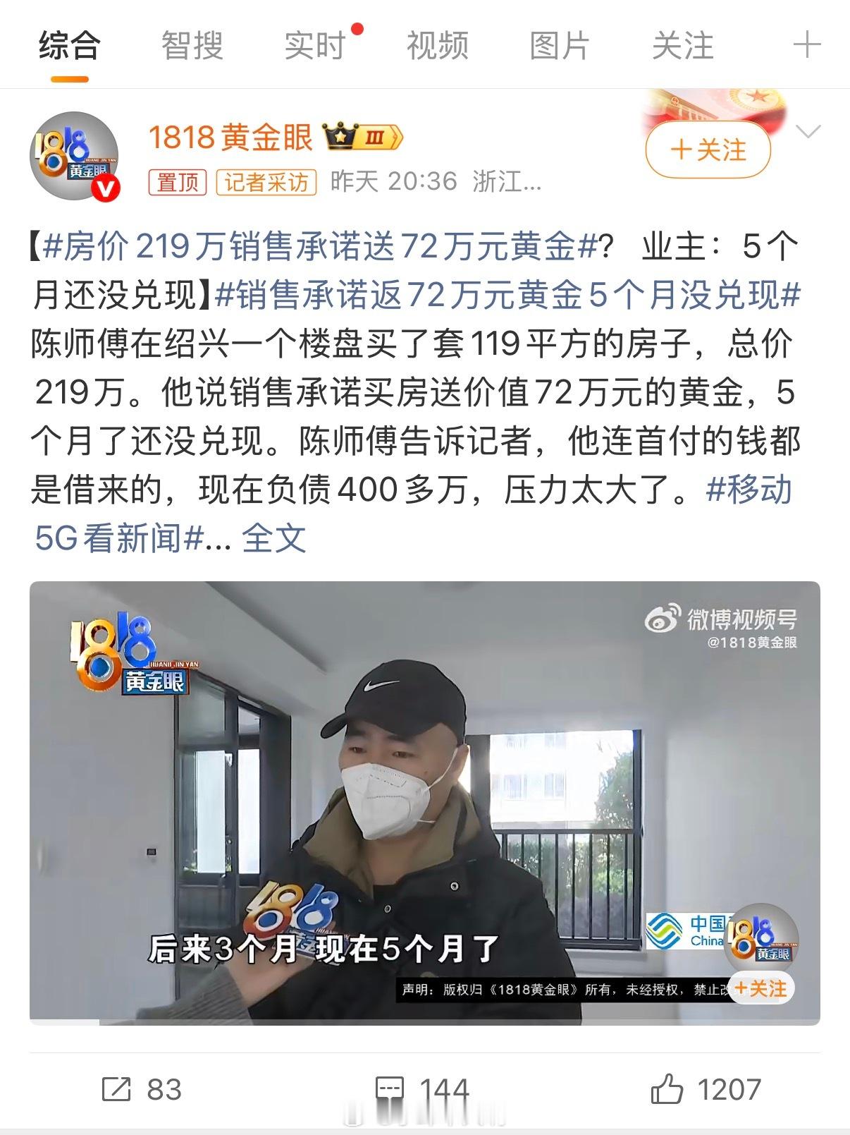 花219万买房,销售承诺送72万元黄金? 绍兴的陈师傅信了,结果5个月过去,黄金没见着,自己却背上了400多万的债务。他买的是当地一个楼盘119平米的房子,首付都是借来的。当时销售信誓旦旦说“买房就送价值72万的黄金”,让他觉得捡了个大便宜。可如今交房在即,承诺的黄金迟迟没兑现,连个明确说法都没有。更让人揪心的是,陈师傅现在每月要还高额贷款,压力大到喘不过气。他说:“我连首付都是东拼西凑借的,现在每天都在为这笔债发愁。”其实,“买房送黄金”这类促销,在不少地方都出现过。表面看是福利,实则暗藏风险。业内人士提醒:所有优惠,必须白纸黑字写进购房合同或补充协议,否则维权难度极大。房子是用来住的,不是用来赌“天上掉黄金”的。面对过于诱人的促销,多一分冷静,或许就能少一分日后的心碎。