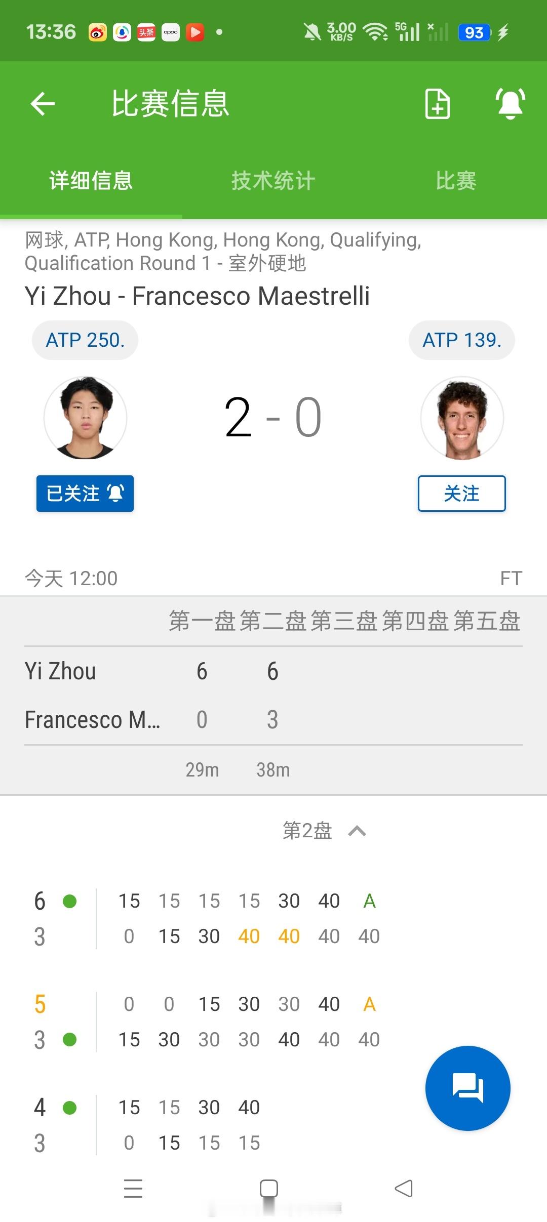 小花小草资讯【ATP250🇭🇰香港】男单资格赛第一轮[WC]🇨🇳周意6-06-3横扫 🇮🇹球员马埃斯特雷利晋级资格赛决胜轮周意收获 7分