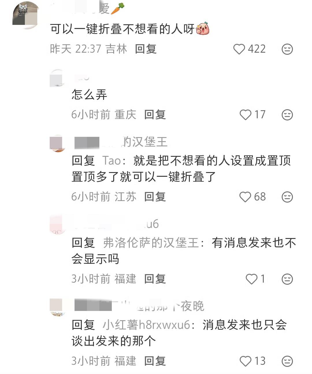 爸爸2000个微信置顶火了!年轻人反向操作绝了:置顶的全是“不重要” 最近“爸爸微信有两千个置顶”直接冲上热议,网友笑称这是“把微信用成了通讯录百科”——长辈们总觉得置顶能防错过,结果工作群、广场舞队、远房亲戚全挤在顶上,真正要找的家人消息反而被淹没,堪称“全置顶等于没置顶”! 直到被我闺蜜的反向操作点开窍:原来置顶的终极用法是“藏”不是“显”!她把所有不常聊但又不能删的工作群、通知群全置顶,然后一键折叠,置顶栏瞬间变成“消息收纳盒”,下面露出来的全是爸妈、闺蜜、饭搭子这些常联系的人,打开微信1秒就能找到要聊的人,简直是信息爆炸时代的续命操作! 现在年轻人的社交多精明啊:“搭子式社交”要精准,微信置顶也要高效。不用纠结该置顶谁,把那些“食之无味弃之可惜”的群聊全塞进置顶折叠区,既不耽误看通知,又能让真正重要的人留在显眼位置——这才是“置顶那些不是置顶,不置顶那些才是置顶”的精髓! 想起有网友吐槽,帮爸爸取消几百个置顶手都酸了,跨设备同步还不同步,原来不是置顶没用,是没找对方法。安卓长按折叠、苹果设置里开启功能,再给置顶群备注“周三交方案”“物业通知”,既不遗漏重要事,又能保持列表清爽! 你微信置顶了多少个?是跟爸爸一样的“全置顶选手”,还是和我闺蜜同款“折叠高手”?有没有更绝的微信整理技巧?评论区分享下,让大家抄抄作业!