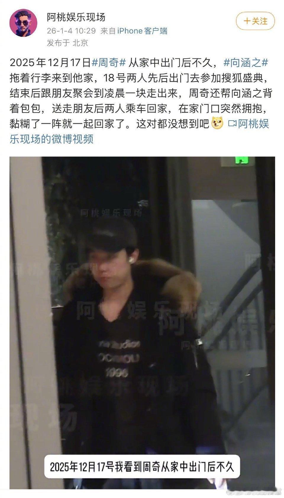 向涵之被曝和周奇的恋情后发文,应该是“包跑的”意思。周奇向涵之一起回家周奇站姐脱粉爆料