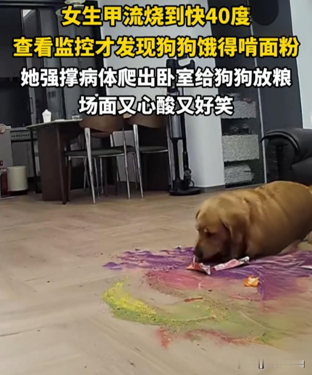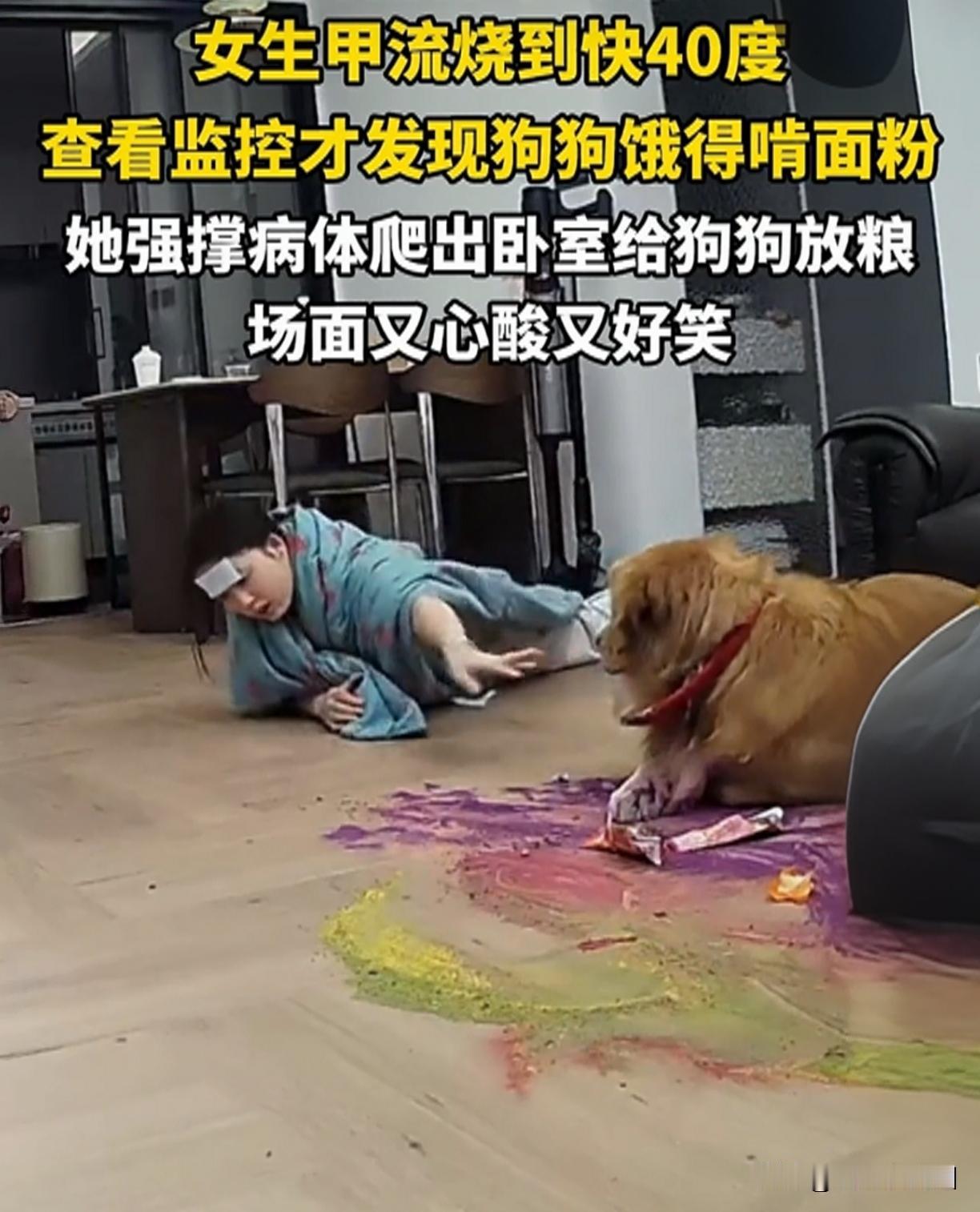 高烧40度爬着喂狗,医生骂我疯子!可监控里那一幕,谁扛得住? 哎哟,你们敢信吗?昨天我甲流烧到快40度,人都快糊了,浑身疼得下不了床,结果硬是爬着去给狗放了粮!要不是点开监控看到那一幕,我这辈子都想不到自己能这么“疯”…… 当时真的,烧得眼睛都花了,骨头像被拆过一样。我瘫在卧室,连喝水都得喘半天。迷迷糊糊想起来,狗子好像还没吃饭,就挣扎着摸手机打开客厅监控——瞬间眼泪就冲出来了! 我家那傻狗,平时乖得连沙发都不碰,居然扒开了厨房的面粉袋,一头扎进去啃得满脸白乎乎。它一边啃还一边抬头往卧室门看,那个眼神…我真的心揪着疼。 其实都怪我,前一天突然高烧,完全忘了添粮。它饿得受不了,又不吵不闹,自己默默找吃的。看着它小心翼翼的样子,我真是又心疼又愧疚——这小生命可是全心全意依赖着我啊。 就那一瞬间,也不知道哪来的力气,我抓着床头柜晃起来,腿软得直接跪在地上。爬吧!爬也得爬出去!头晕得天旋地转,我就真的一步一挪,从卧室蹭到客厅,手心蹭得发红,终于够到狗粮袋。 它看见我,也没扑过来,就蹲在旁边安静等着,尾巴轻轻摇。我倒粮的时候,它用鼻子碰了碰我的手,凉凉的,湿湿的。那一刻我真的破防了:它哪里只是宠物,它是家人啊。 事后朋友骂我:“你不要命了?爬出来摔了怎么办!”医生更说高烧乱动很危险。可我不后悔。如果我们倒下时,还有一个生命在默默等着你、信任你,那种被需要的感觉,反而成了撑住自己的力量。 后来我常想:到底是我们养了宠物,还是宠物用它们的一生,教会了我们什么是责任与爱? 养狗的姐妹一定懂吧…你们家那个“毛孩子”,有没有哪个瞬间让你觉得,再难也得为它撑住? 评论区等你,每一条我都会看。 甲流 宠物感人瞬间 狗狗的忠诚 高烧 破防了 养狗人才懂的痛 人与宠物