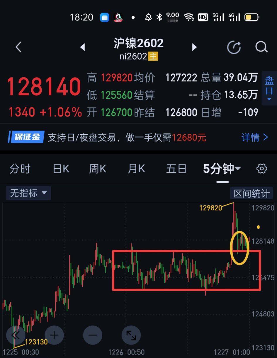沪镍,上午忘说了一个关键点,一分钟中枢形成后,125560~129820的离开段回调过程并没有形成中枢的三买。如三买形成可期待挑战130880高点。三买点没形成,只能等待走势完成中枢震荡,选择方向后再对应股票进行操作。