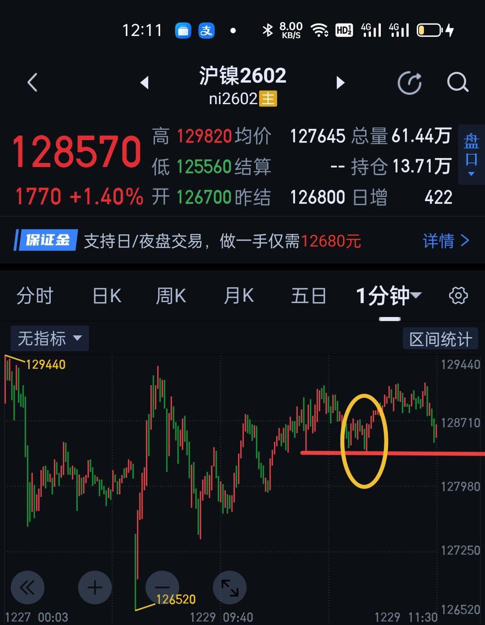 沪镍下午盘128330是不能有效跌破的,否则走势仍会向一分钟中枢去寻找支撑,短期仍不能明确方向。