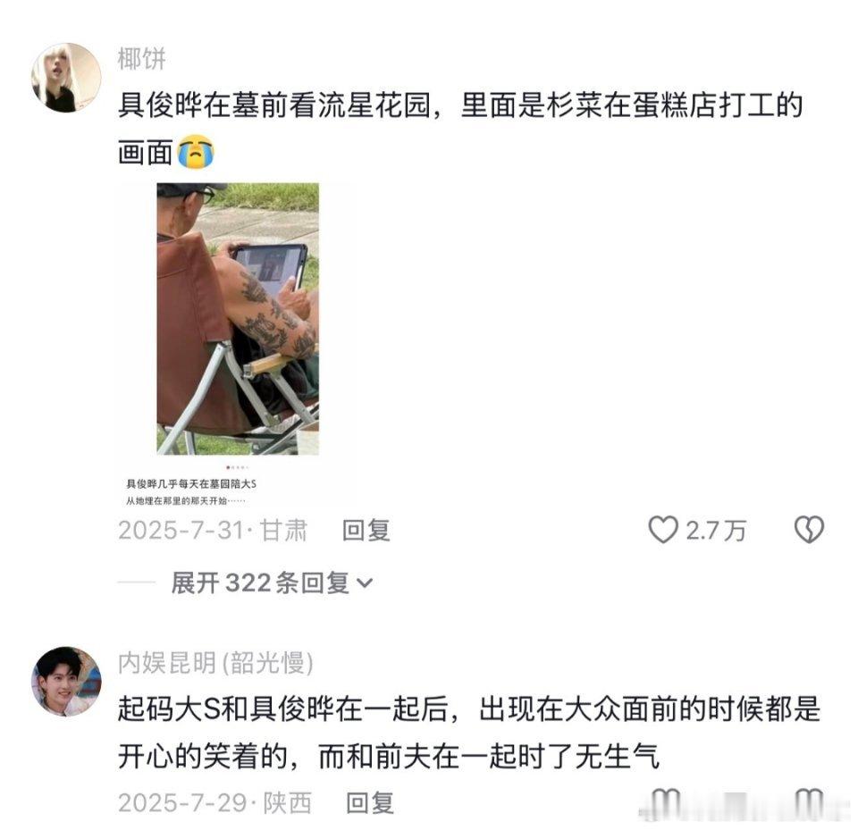 大S离世后,具俊晔推掉了诸多活动,常来墓地陪伴她。网友晒出大S墓碑上的文字:“REMEMBER TOGETHER FOREVER”和韩文的“永远爱你-俊俊”,是她与具俊晔婚后共同纹在颈部与锁骨处的情侣纹.身,如今被刻在了墓碑上。具俊晔几乎天天都会来墓园,附近居民也感叹称墓前草坪被他踩踏得已褪色。他还曾在墓前播放《流星花园》,精心为大S修.图,用熟悉的情节追忆往昔,这份深情,确实令人动容。具俊晔新年赴墓地陪伴大S