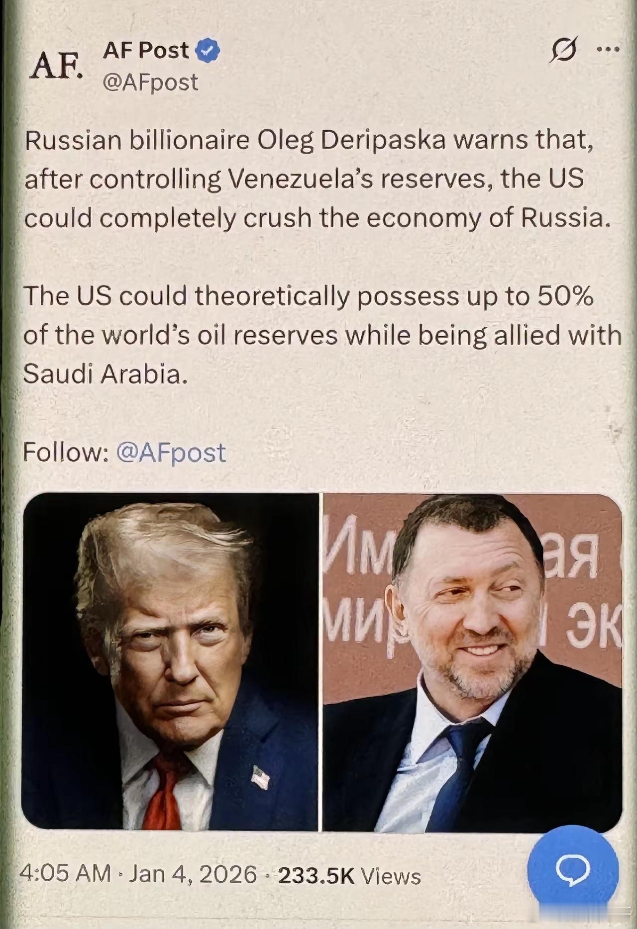 特朗普大棋局:俄罗斯亿万富翁奥列格·德里帕斯卡警告称,美国控制委内瑞拉的储备后,可能会彻底击垮俄罗斯经济。理论上,美国与沙特结盟后,有望掌握全球高达50%的石油储备。德里帕斯卡的警告,戳破了美对委行动的能源野心。美国一边抓捕马杜罗掌控委能源,一边绑定沙特,妄图垄断全球半数石油储备,本质是借能源霸权绞杀俄罗斯经济,这场石油博弈背后,满是美式霸权的掠夺算计。
