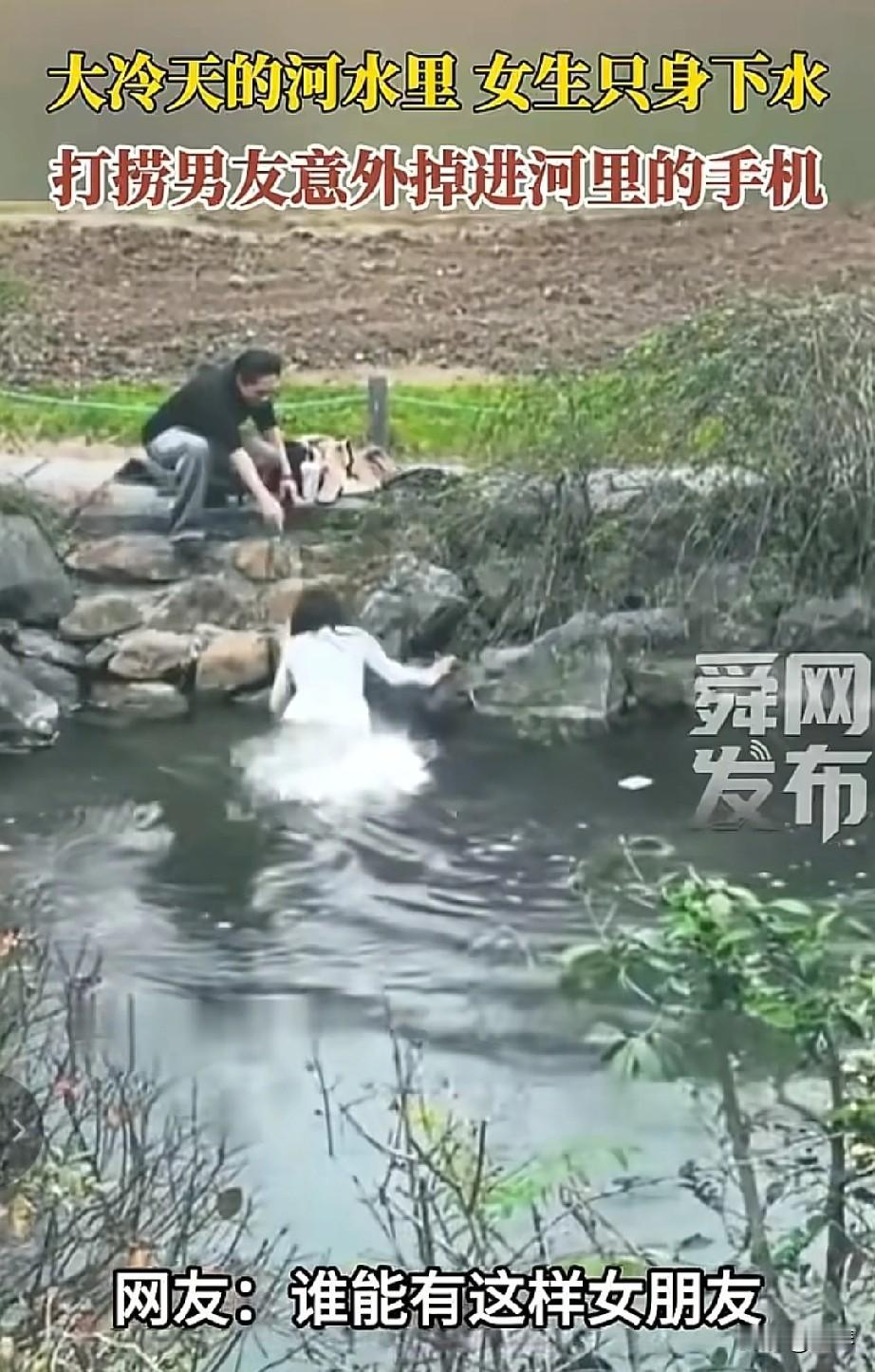 为捞手机寒冬下河,女孩的这份“深情”,真的值得吗? 大冷天的河水里,女生只身下水打捞男友掉落的手机,这一幕被镜头记录下来后,有人感慨“神仙女友”,也有人直言“恋爱脑上头”。 但在感动或吐槽的背后,更该看清的是:这份以安全为代价的“付出”,既不是爱情的浪漫,也暴露了双方对自身与彼此安全的漠视。 从女生的角度来看,她的行为里或许有对男友的在意,但这份在意显然越过了“自我保护”的底线。寒冬时节的河水,暗藏着失温、溺水、水下杂物划伤等多重风险,一部手机的价值,远不及自身的生命安全。真正的爱情从 不是“奋不顾身”的自我牺牲,而是懂得珍惜自己,才能更好地珍惜彼此。这种不计后果的举动,不是“深情”,而是对自己的不负责,也会让爱她的人陷入担忧。 再看男生的表现,镜头里他坐在岸边,看着女友下河却未及时阻拦,这一行为同样值得反思。爱情是相互的守护,而非单方面的付出。当女友要为自己掉落的手机以身涉险时,男生最该做的,是第一时间制止,而非默许这种危险行为发生。 一部手机丢了可以再买,可女友的安全一旦出问题,后果不堪设想。他的迟疑与不作为,恰恰反映出在这段关系里,对“安全”与“珍惜”的认知缺位。 其实,生活里的小事最能照见爱情的模样。真正的爱,是我愿意为你着想,但更会拦着你做傻事;是你会心疼我的付出,更会把我的安全放在首位。 而这对情侣的经历,更像是一面镜子,提醒我们,爱情里的“美好”,从来不是用自我伤害来证明,也不是用对方的牺牲来感动,而是彼此守护,把安全与责任放在第一位。 毕竟,没有什么比身边人的平安,更值得被珍惜。