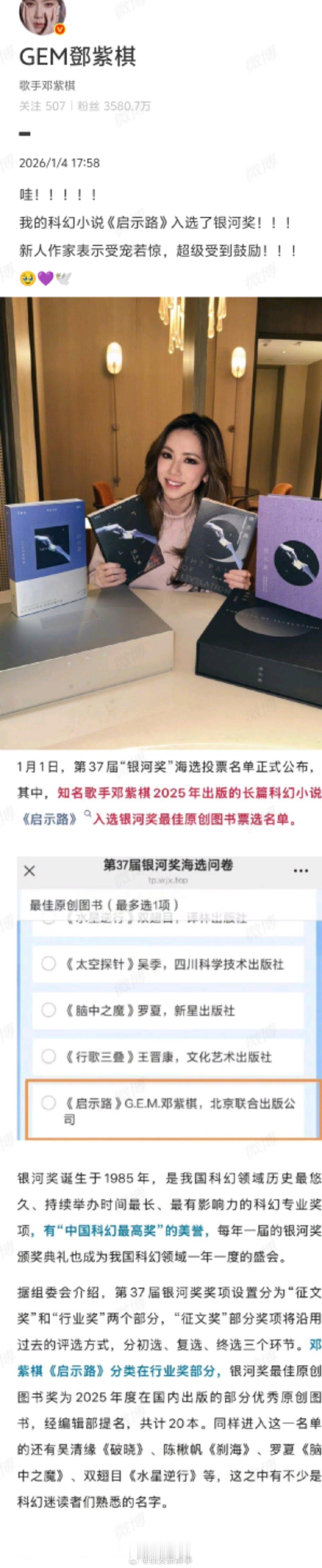 【邓紫棋回应所著科幻小说入围银河奖】邓紫棋说新人作家表示受宠若惊1月1日,第37届“银河奖”海选投票名单正式公布。其中,知名歌手2025年出版的长篇科幻小说《启示路》入选银河奖最佳原创图书票选名单。1月4日,发文:哇!!!!!我的科幻小说《启示路》入选了银河奖!!!新人作家表示受宠若惊,超级受到鼓励。
