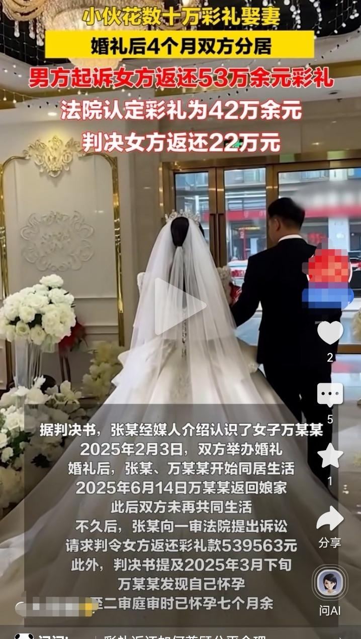 这种婚姻算是去父留子的一种方式嘛?小伙花数十万娶妻,婚后4个月分居,起诉女方返还53万彩礼,法院认定彩礼为42万元,判女方返还22万元,女方上诉。 这个事件还是很特别的,首先是介绍的婚姻,然后就是没有领结婚证。 2月结婚,3月女方发现怀孕,共同生活4个月女方就和男方分居再也不回去了,男方就起诉要求返还彩礼。 有种怪异的感觉,女方有点像去父留子一样,通过介绍人找了一段不需要登记的婚姻,孩子有了就离开不再和男方来往,顺便还得了份彩礼钱,最主要的是起诉期间也没有提孩子的扶养问题。 友友们怎么看,评论区讨论下呗。