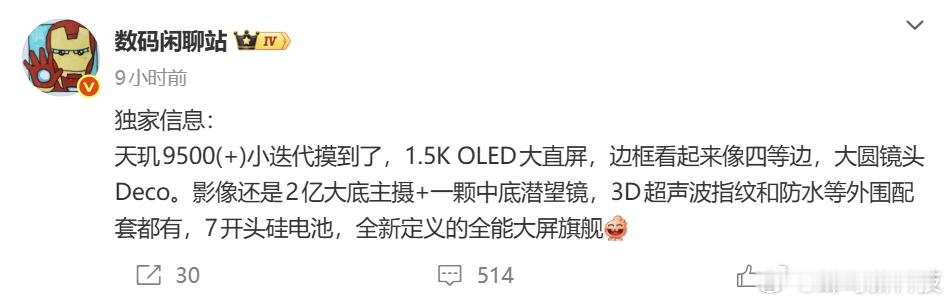 【vivo X300s配置曝光:搭载天玑9500+芯片与2亿像素主摄】据博主爆料,vivo即将推出搭载联发科天玑9500+芯片的新机X300s。该机采用6.78英寸1.5K OLED四等边直屏,后置2亿像素大底主摄+中底潜望长焦组合,支持3D超声波指纹与防水功能,并内置约7000mAh硅负极电池。