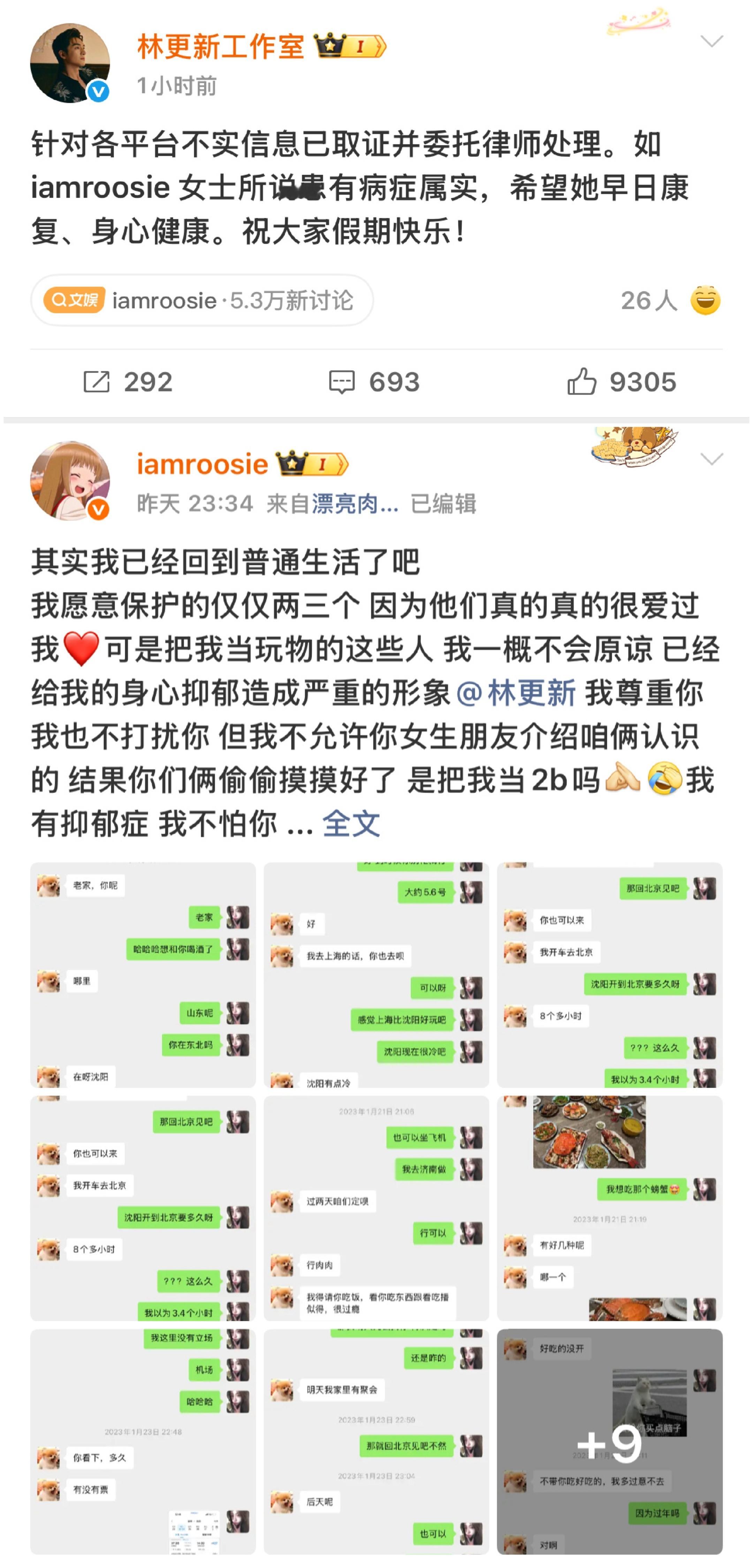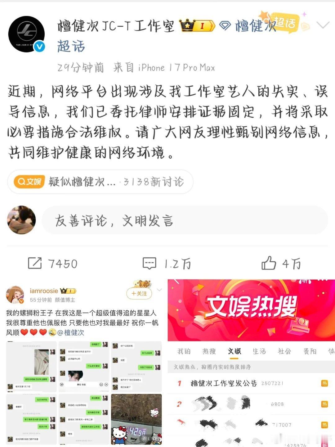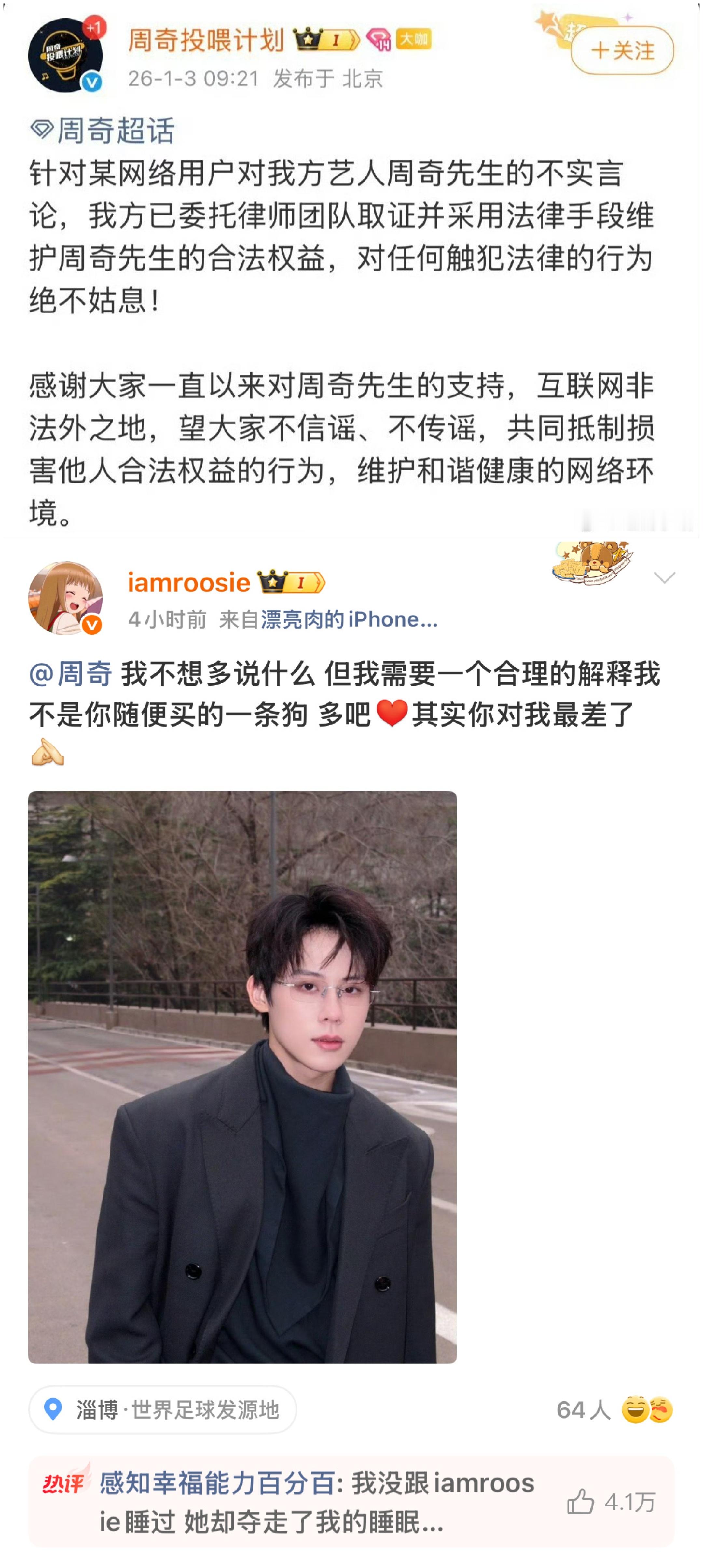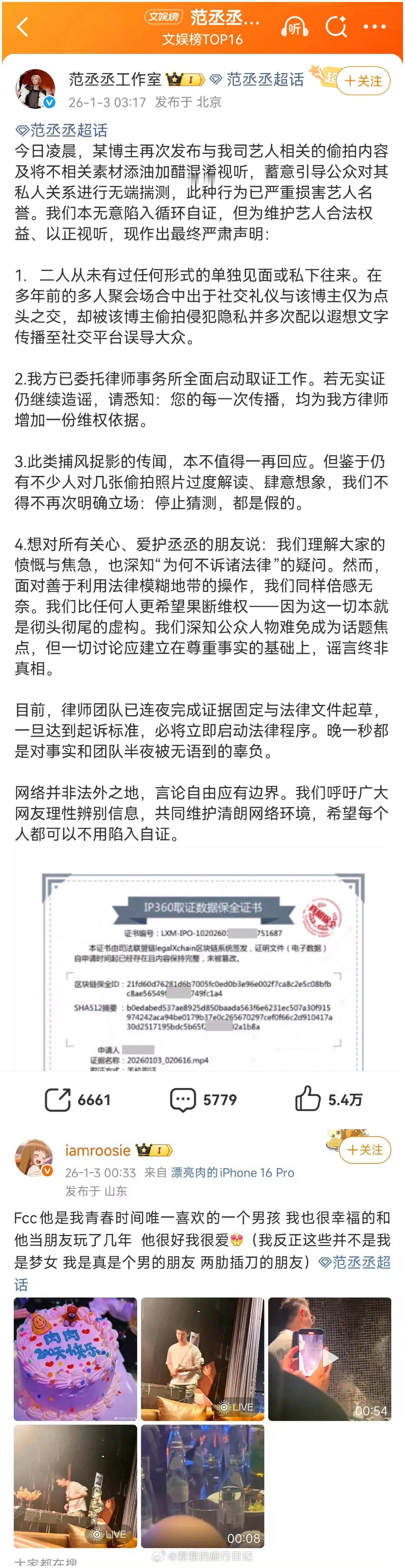 2026-01-04总结①黄杨钿甜成立工作室并更新了营业照,配文:瑞雪铺就全新起点。 图1②有八卦媒体曝周奇向涵之恋情,两人一起回家(1718号同居,19号跟司晓迪聊天说见面) 图2周奇站姐脱粉爆料:周奇用小号联系她透露行程及航班 图3周奇否认司晓迪的指责,没有劈腿乱搞否认曾用小号私联过粉丝撕❶司晓迪爆料多名男艺人与她有约鹿晗(晒聊天记录,衣服,纹身,大理石桌子,纸巾盒)图4檀健次(衣服,表情包)图5范丞丞(直接点名造谣,从未单独见面,多年前朋友聚会)图6蔡徐坤(删他是因为李汶翰要求)图7林更新(控诉其通过女性朋友介绍认识自己后,却与该女性“偷偷交往”,聊天记录为日常寒暄、相约吃饭等,维权,叫她看病)图8周奇(对她最差) 图9黄明昊 图10张一山(说每次都给她买零食) 图11屈楚萧(说他家暴闺蜜的闺蜜),屈楚萧晒出判决书,否认家暴 图12王安宇(说跟关晓彤在一起了,王安宇关晓彤均出声明否认) 图13❷会拍摄的百晓生爆:范丞丞、黄明昊、李汶翰喜欢聚会;黄明昊和鞠婧祎谈过恋爱,黄明昊还为鞠婧祎办过生日会。 图14黄明昊,鞠婧祎辟谣 图15❸许凯粉说别人爆料有图有真相,许丽莎再刚说劈腿 图16❹司晓迪事件,朱一龙粉丝要求《空枪》把檀健次换掉 图17❺南部档案,南部档案》,丁禹兮粉要求剧方把演员表改成首字母排序或轮流一番 ,超话管理争端 图182号网页链接