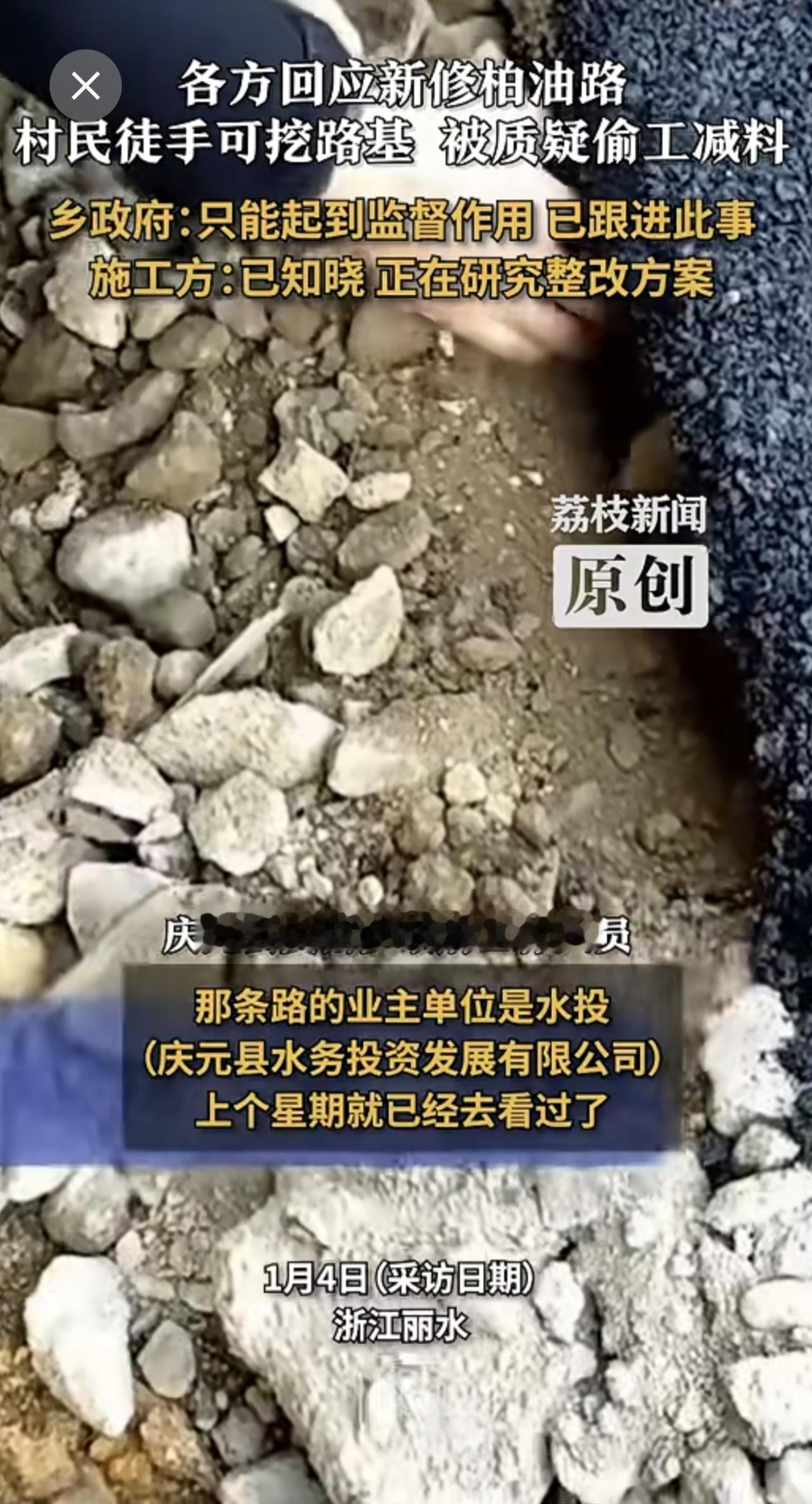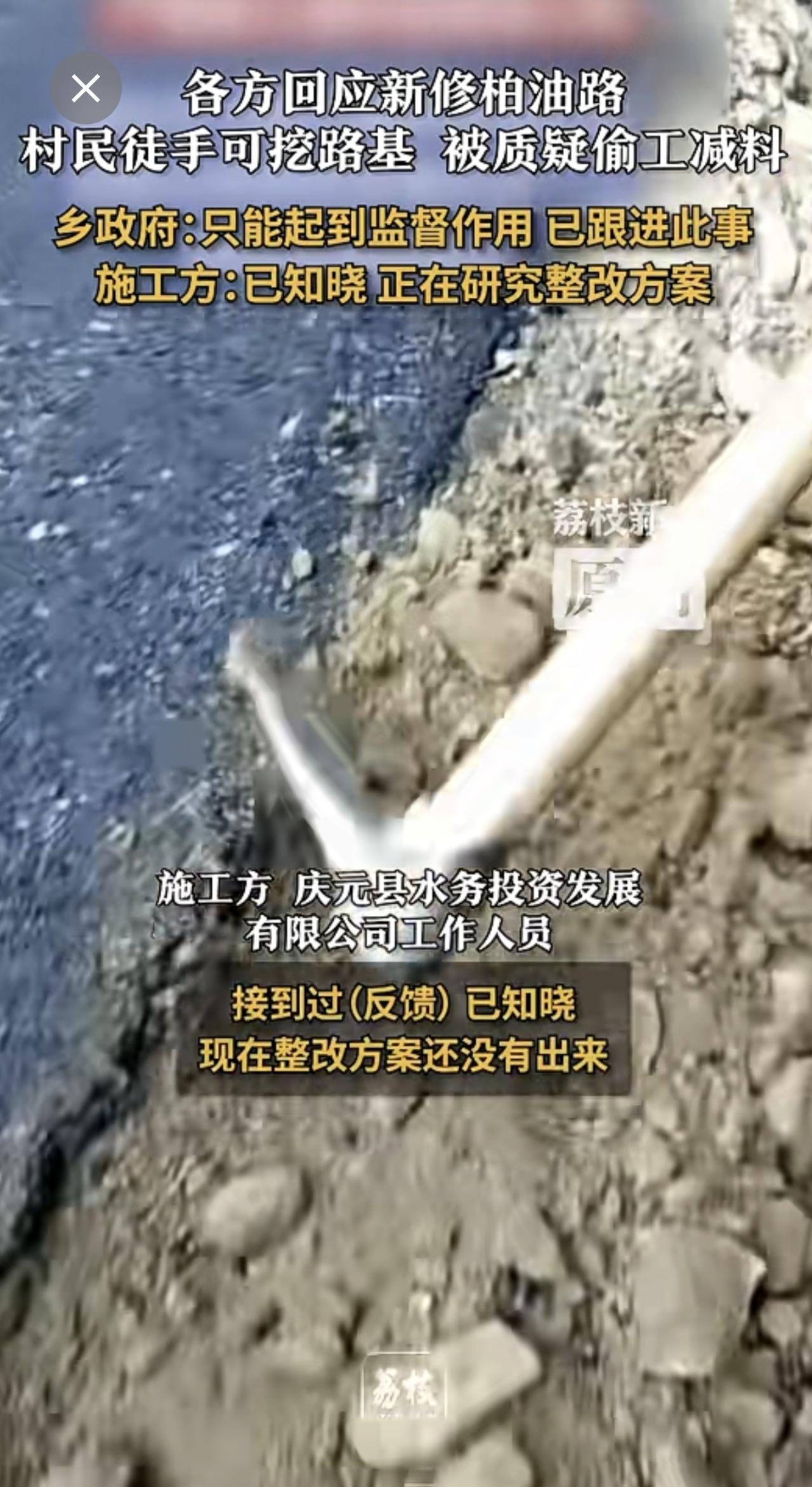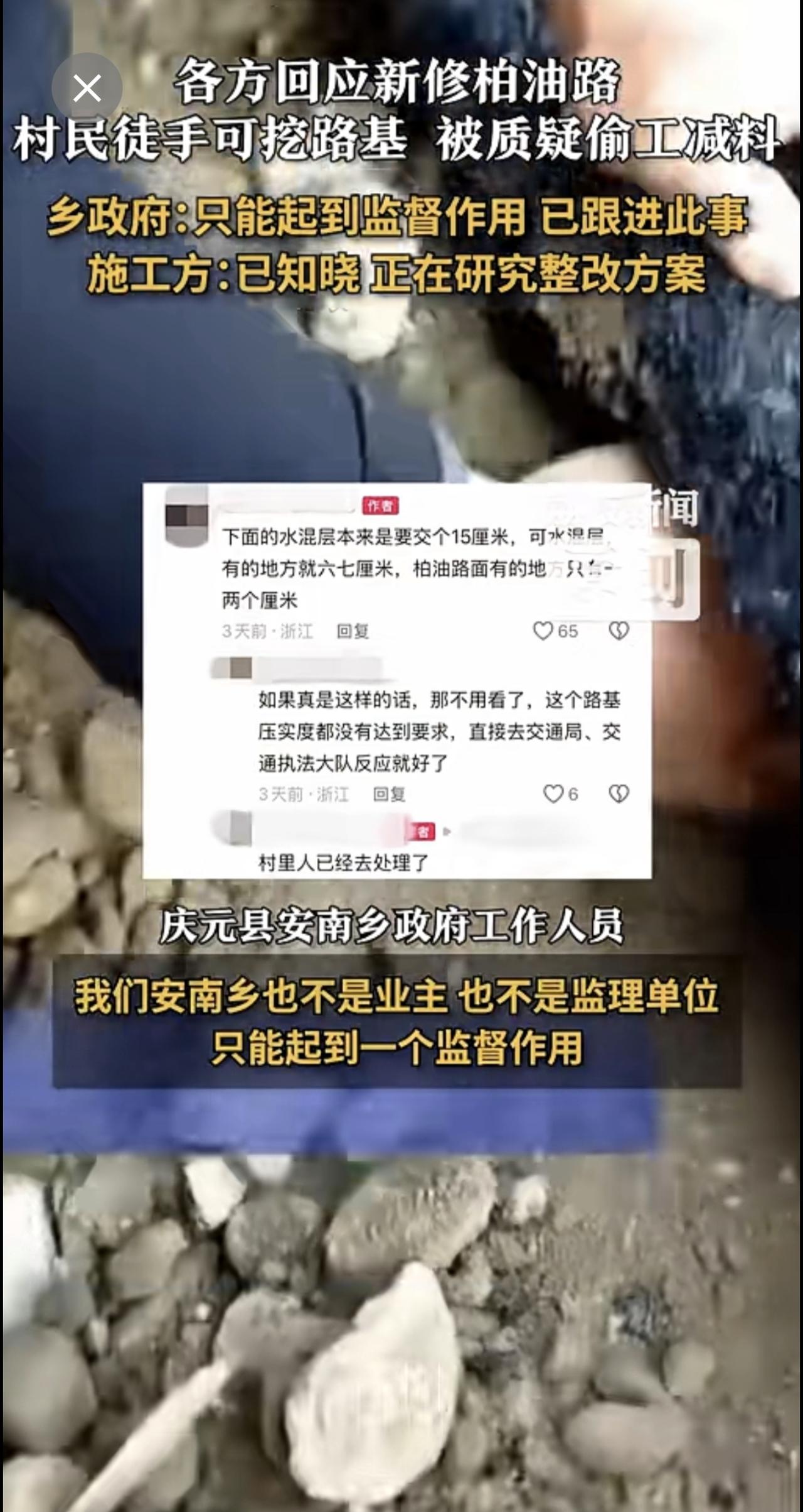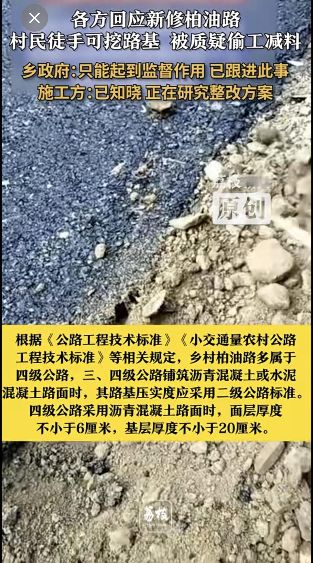 新柏油路地基徒手可挖疑偷工减料 ,多方回应新修柏油路疑偷工减料 乡政府:只能起到监督作用 已跟进此事 施工方:已知晓 正在研究整改方案