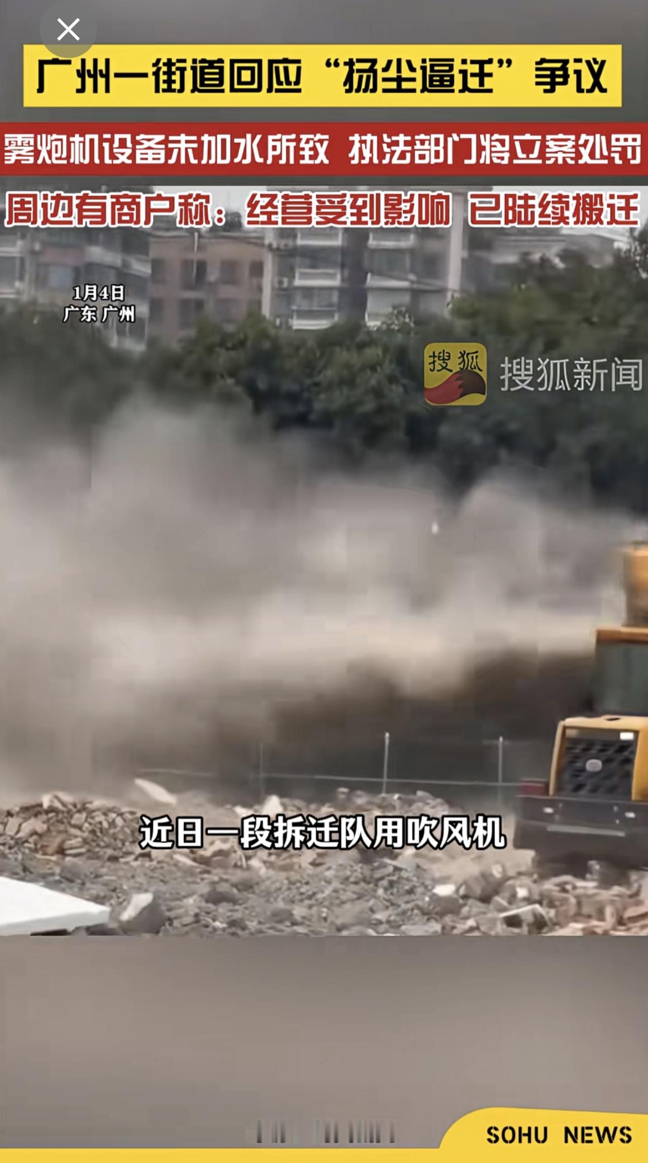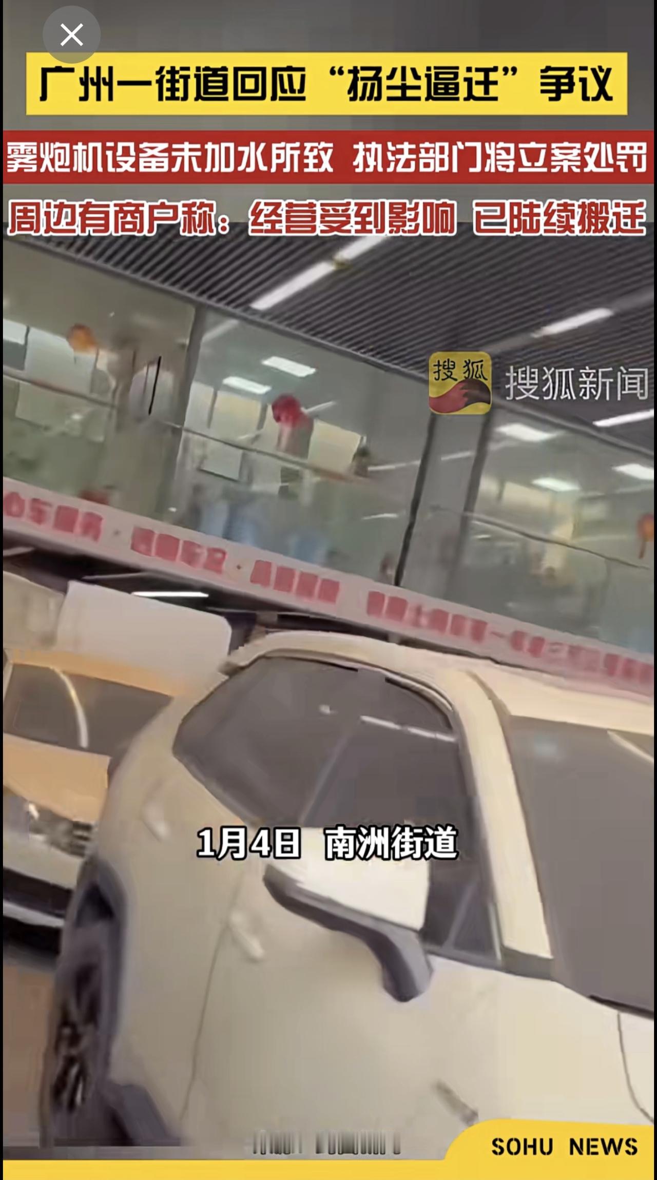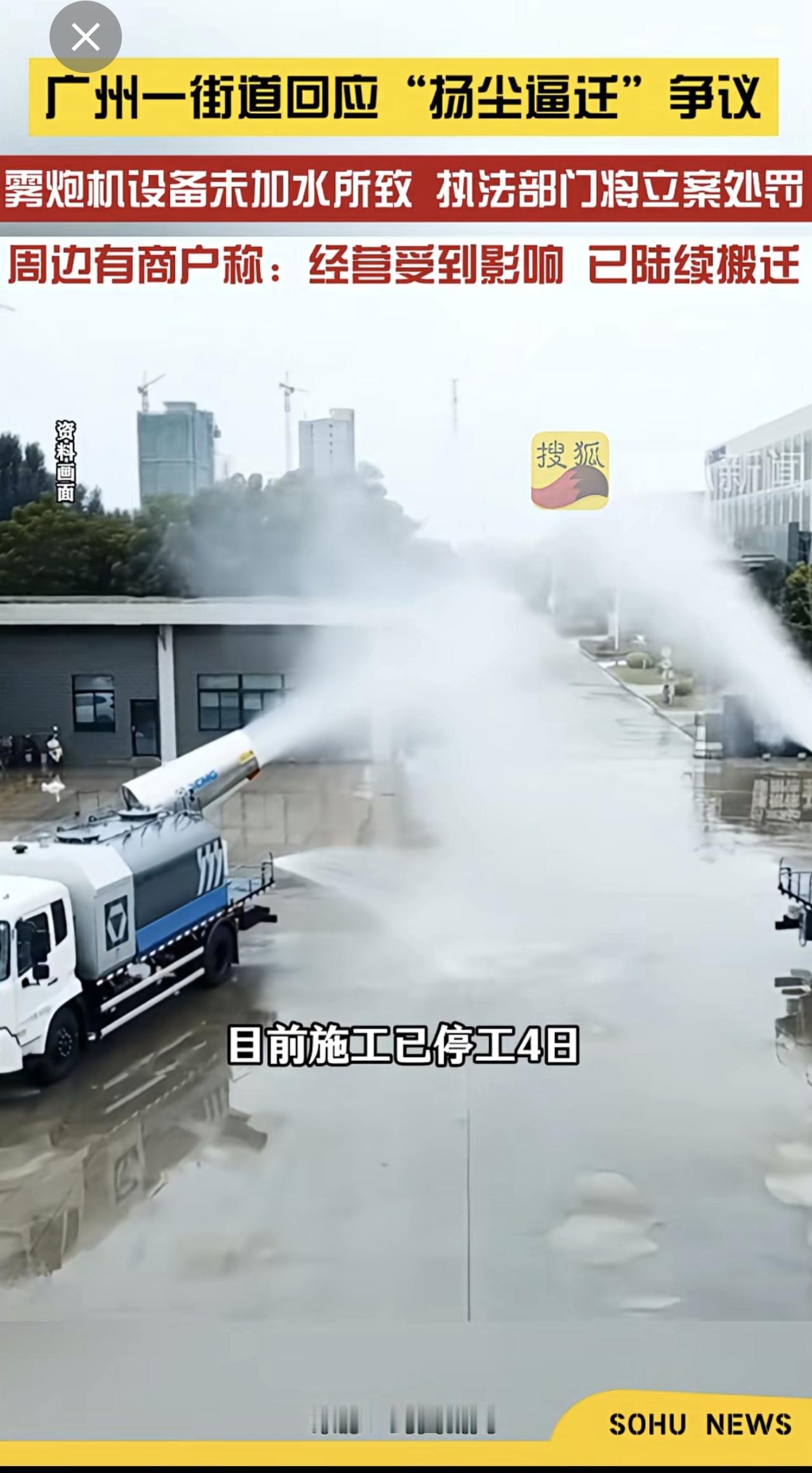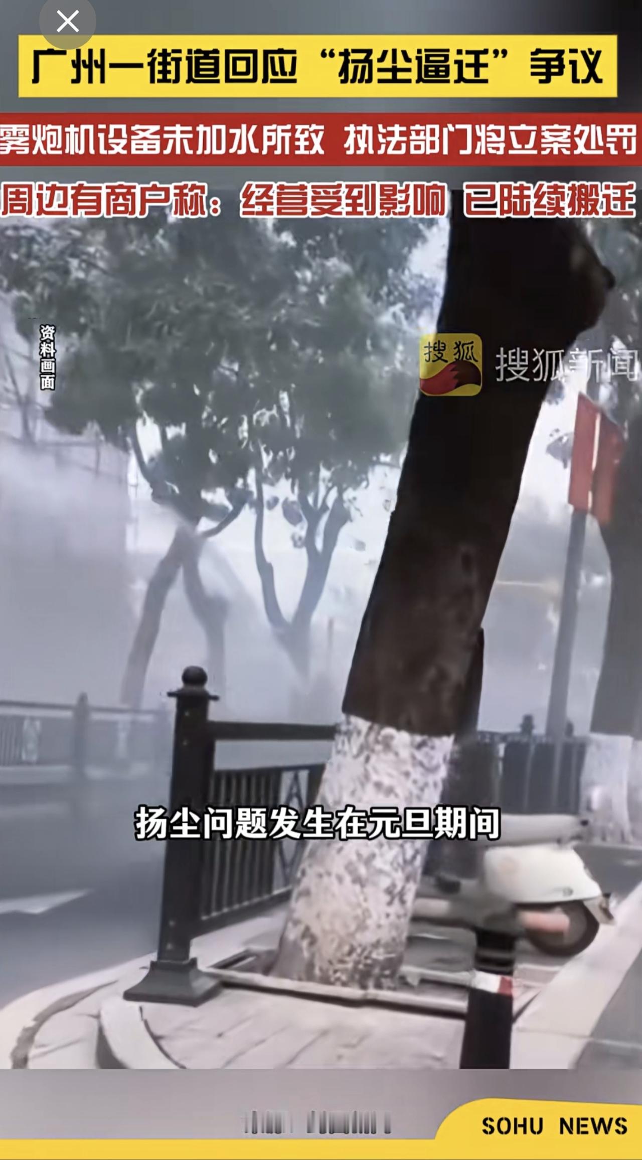 1月4日,广东广州。广州一街道回应“扬尘逼迁”争议,雾炮机设备未加水所致,执法部门将立案处罚。周边有商户称:经营受到影响,已陆续搬迁。