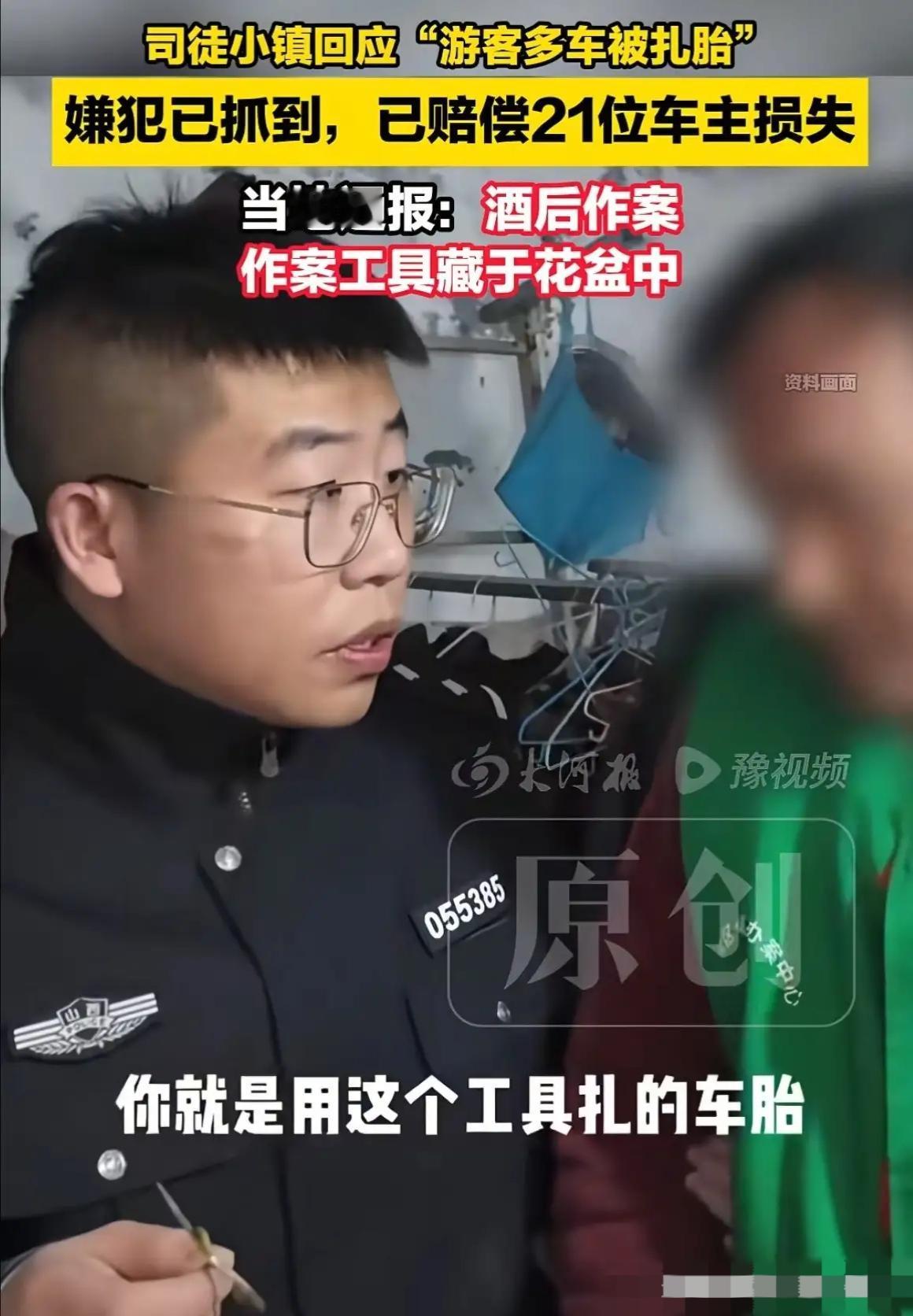 好消息!山西晋城,司徒小镇扎胎事件的罪魁祸首,已经被抓到了!虽然打了马赛克,但看得出来,是一位40岁左右的中年男子。而且这个男的还替自己辩解,说当时喝酒了,并不清楚到底扎了多少。 景区的话,目前已经赔偿了21位车主的修车损失,还额外加了1000块钱。 这个停车场可以停大概300辆车,当时处于元旦,基本上是停满的状态。估计被扎的可能还不止21辆车,需要继续问。 对于他说的自己喝酒了,大多数人都是不信的,应该就是故意这么干的,真的有点坏。 这下好了,就说这21辆车的损失,加上每人补偿的1000块钱,差不多也有30000块钱了。 偷鸡不成蚀把米,这男的可以说后悔莫及[捂脸][捂脸]