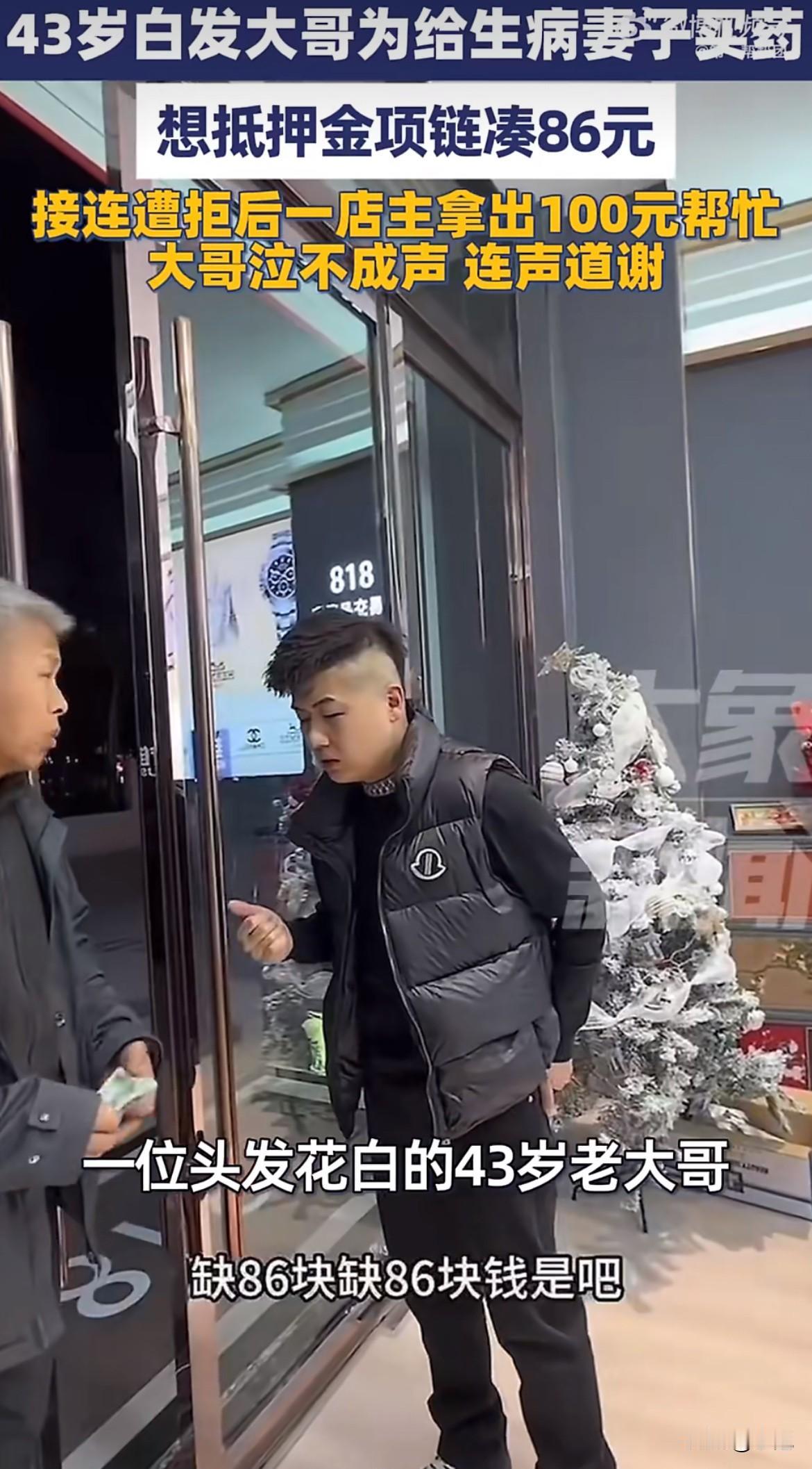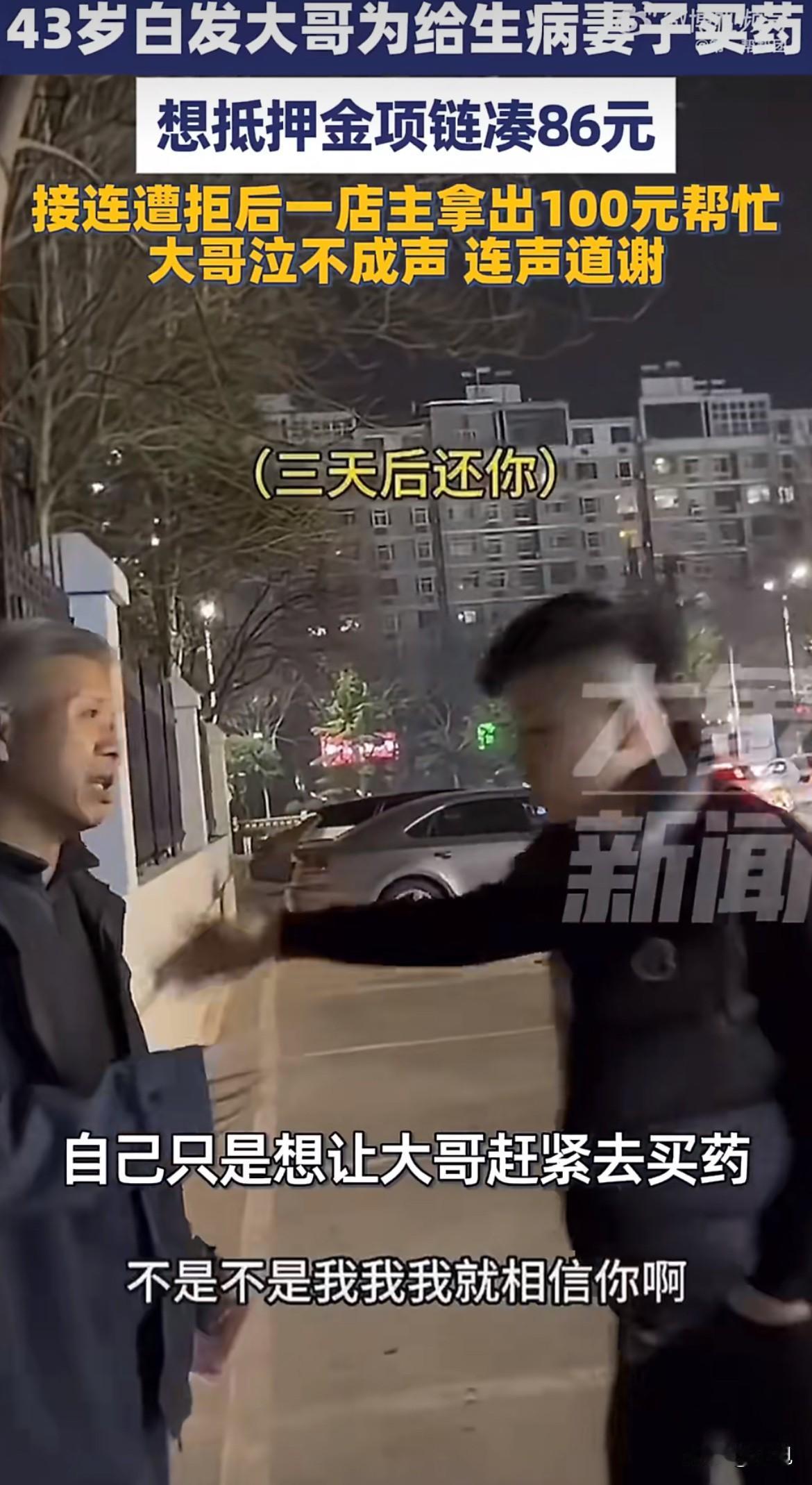 一个男人拿着金项链,挨家挨户地问,想抵押80块钱。 他头发全白了,看起来有六七十岁。可一问,是82年生的,今年才43。 在工地干活,妻子病了,愁白的头。 买药要107块,他翻遍全身,只有21块现金。就差这86块。 金项链递出去,又收回来。一家,两家,好几家店,没人接。最后他走进王先生的店,这是他又一次尝试。 说到妻子病情时,他撑不住了,眼泪直接掉下来。 店主王先生没接项链。他掏出一百块钱,直接塞过去。 男人像被烫到一样,猛地缩回手,拼命摇头。转身就走。 王先生追到街上,硬把钱塞给他。男人拗不过,攥着钱,嘴里反复说:“这算借的,三天后,我一定还。” 说完这句话,他整个人蹲下去,哭得缩成一团。 拍下这视频的王先生,最初只想帮忙,没想火。视频还是传开了。 现在当地政府部门也找来了,想通过王先生联系上这位大哥,说要提供帮扶。王先生自己也说,等大哥两三天后来还钱时,会继续帮他。 事情好像有了一个温暖的后续。 我在想,那86块钱,到底有多重。 能压垮一个男人,让他掏空口袋,捧出可能最后一点值钱的东西。 我在想,前面几家店的拒绝。也许怕麻烦,也许怕项链来路不明。这顾虑不陌生,新闻里确实有拿“金包银”假首饰骗钱的案子。 王先生的信任,没犹豫,挺珍贵。 我在想,那句“三天后一定还”。那不是客套,是一个被生活摁在地上摩擦的人,死死攥着的,最后的体面。 我还想,政府的介入和后续的帮扶。这很重要。一个人的善良是火花,系统的保障才能托住一个家往下掉的生计。 像有些地方,政府出钱给个体户买保险,施工影响生意都能赔点钱,这叫兜底。还有社区弄的“微光小店”,帮困难的人卖点手工艺品,自己挣点钱。 这些事不大,但实在。 一条金项链,86块钱。照出了窘迫,也照出了善意。照出了一个男人的尊严,也照见了我们也许能建得更密一点的那张网。 综合信源:点时新闻、红星新闻、钱江晚报、河南手机报等媒体报道。