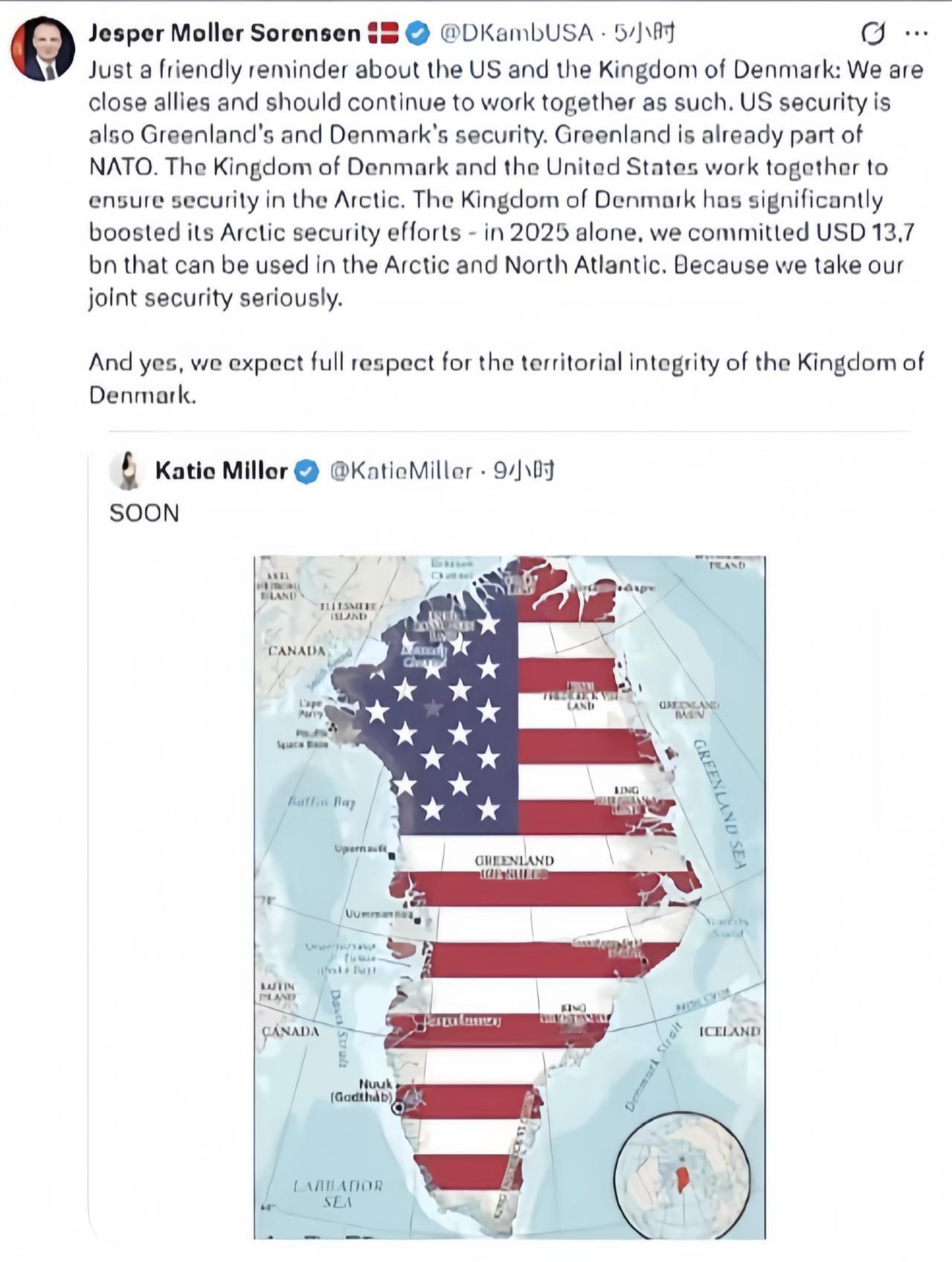 美军偷袭得手后,美国的MAGA们彻底沸腾了,他们飘飘欲仙,认为自己已经天下无敌了。 于是,有人在网上提议要再接再厉拿下格陵兰岛。前美国总统情报顾问委员会成员史蒂芬·米勒的老婆凯蒂·米勒,就公开发帖说格陵兰岛很快将会是下一个目标。 这下可把丹麦人吓坏了,丹麦驻美国大使赶紧套近乎,说我们是盟友啊,我们已经按照美国的要求提高了国防GDP了,你们不能这样做... 唉怎么说呢,感觉现在的老美已经彻底不要face了,像一只狂犬一样逮谁咬谁,真盼望能出现一位会打狗棒法的正义人士,好好教训一下它,最好把它的牙打掉,省的乱咬人。 【图片来源于网络】