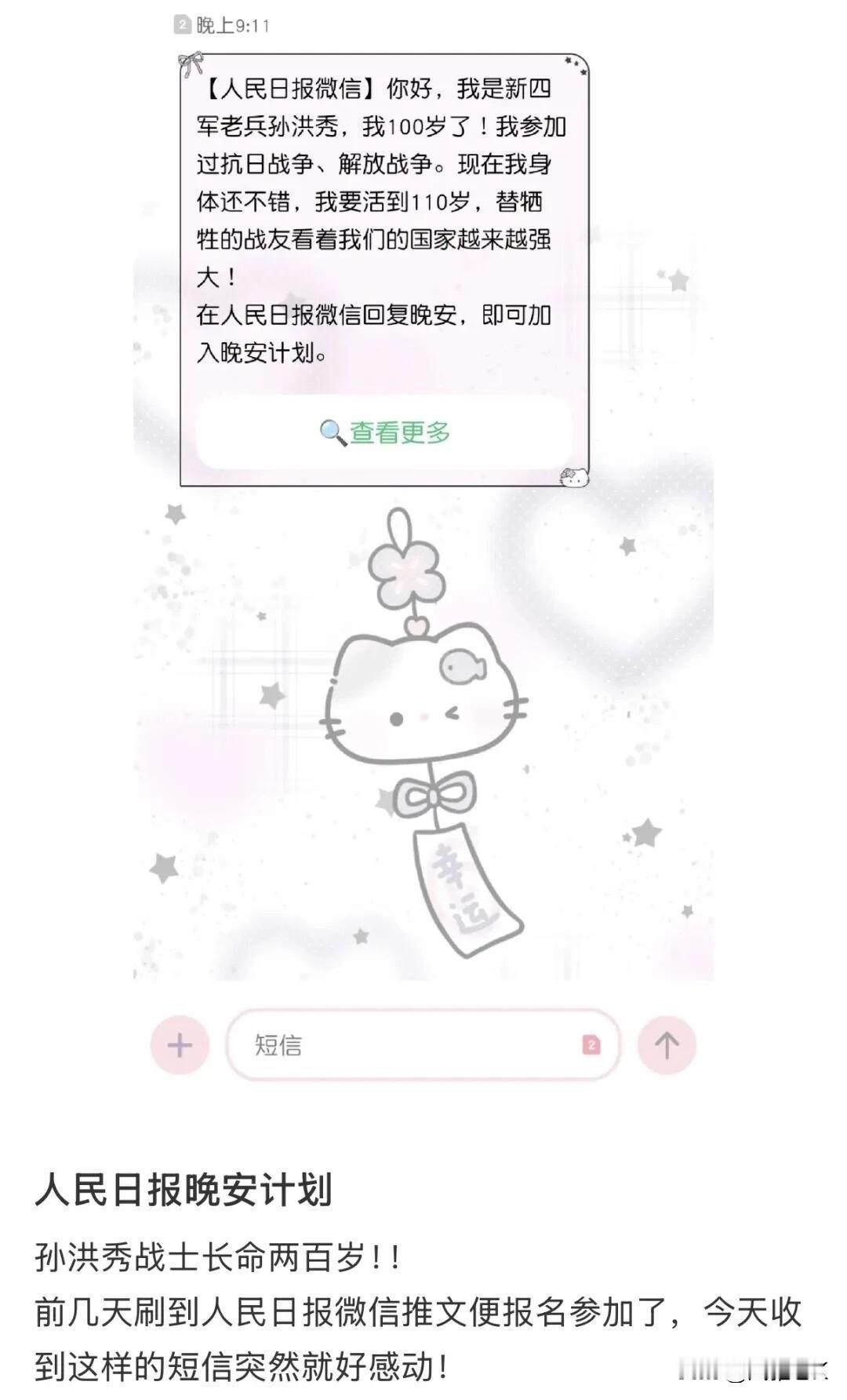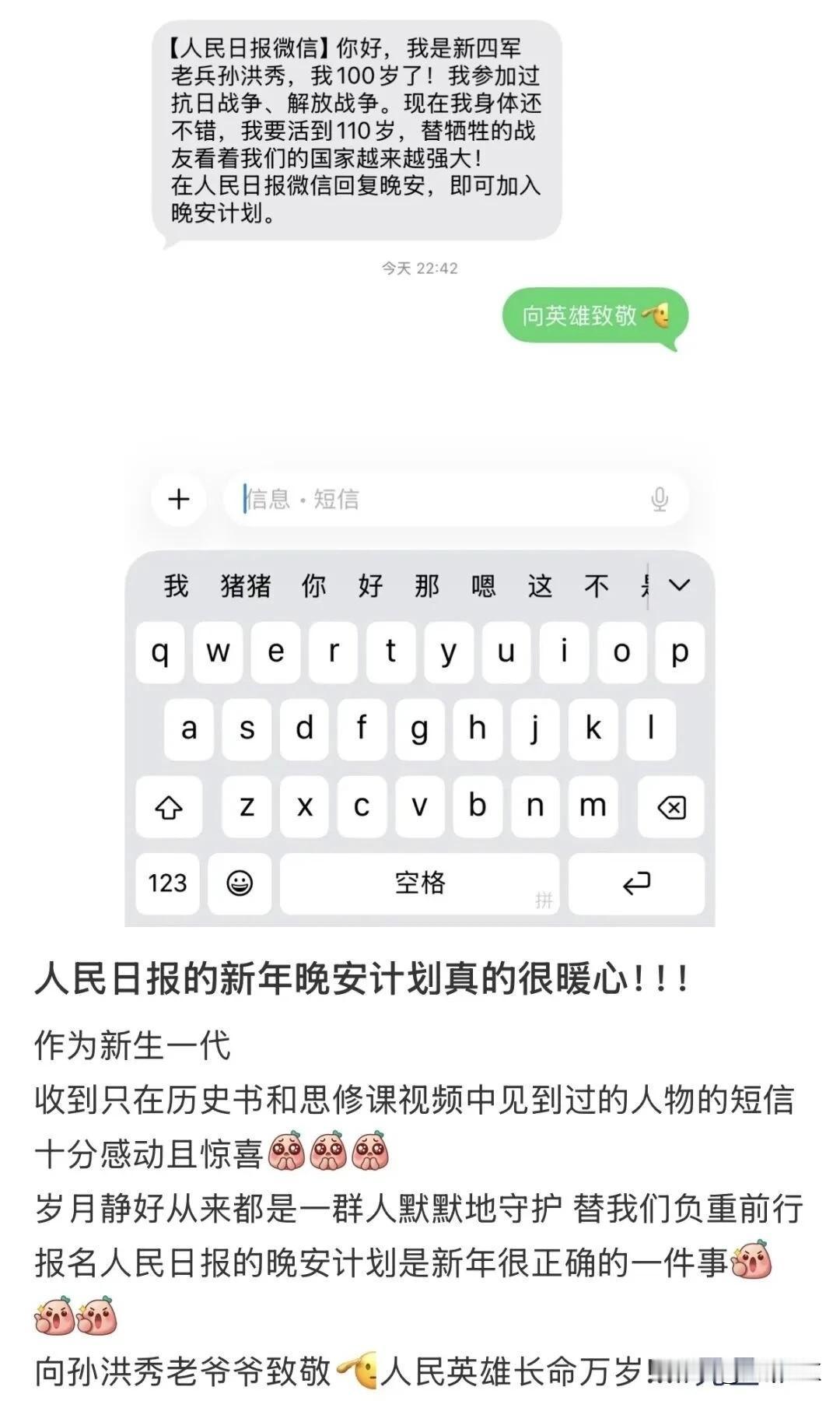 100岁抗战老英雄向网友发短信📨问候“晚安”,你有收到这样的短信吗? 开始以为是“垃圾”信息,了解了才知道这背后是一个百岁英雄的暖心故事! 📨短信内容: 【人民日报微信】你好,我是新四军老兵孙洪秀,我100岁了!我参加过抗日战争、解放战争。现在我身体还不错,我要活到110岁,替牺牲的战友看着我们的国家越来越强大! 主人公孙洪秀,100岁抗战老英雄,1943年加入新四军,在国家最危难的时候,投身战斗, 为抗战做贡献! 要收到这条短信,就需要在人民日报微信回复“晚安”二字,赶紧去动动手指,收下这条百岁英雄的短信吧! 致敬孙老英雄,也祝愿孙老老当益壮!🙁