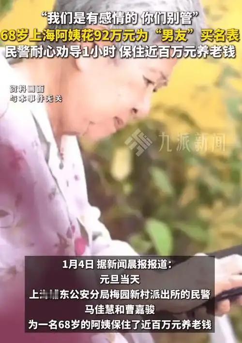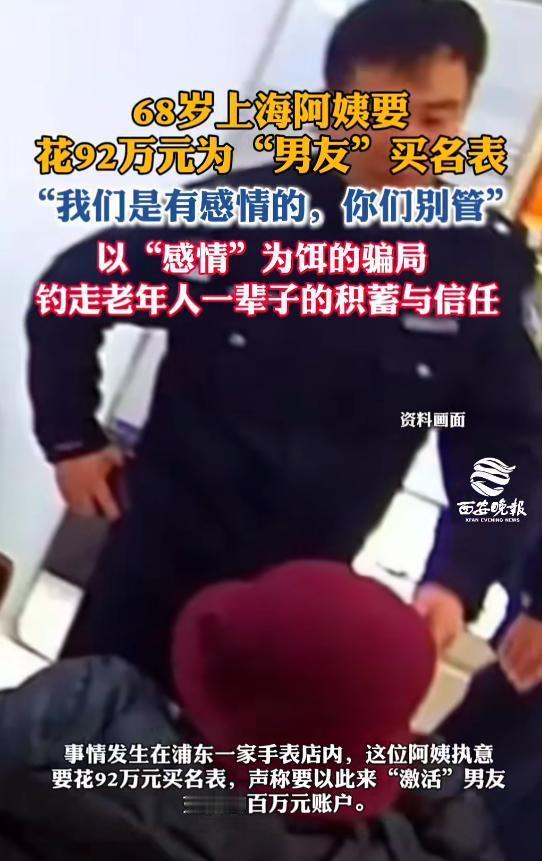 “我们是有感情的,你们别管。”近日,上海一68岁阿姨执意要花92万元买名表,并声称要以此来“激活”男友充值的百万元账户。店员察觉异常立即报警求助。后经民警一小时耐心劝阻,成功为其保住了养老钱。 这个故事充满了人性温暖与社会责任的交织,也让我们深刻体会到,关心与理智在关键时刻的重要性。上海一位68岁的阿姨,为了“激活”男友的账户,执意要花费92万元购买名表,声称这是为了“感情的激活”。而店员的敏锐察觉和民警的耐心劝阻,最终成功挽救了这笔宝贵的养老钱。 故事中的阿姨,或许出于对感情的执着和渴望,愿意用毕生积蓄去维系一段关系。她的“我们是有感情的,你们别管”,展现出一种真挚而执拗的情感表达。面对如此巨大的金额和复杂的情感纠葛,店员没有盲目迎合,而是选择报警求助,体现出专业的责任感。 民警的耐心劝导,更像是一股温暖的力量,为阿姨拨开迷雾,帮助她理清思路,避免了一场可能的财产损失。这不仅仅是一场简单的劝阻,更是一份关怀与责任的体现——提醒我们在面对亲情、爱情和财产的交织时,理性与冷静同样重要。 这个事件也引发我们对家庭、感情和财务安全的思考。长辈们在情感上可能会有执着,但我们也应关注他们的财产安全,避免被不良信息或情感冲动所左右。社会各界,特别是金融机构和服务人员,更应加强风险提示和保护措施,为老人们提供更多的理财和情感引导。 同时,这个故事也告诉我们:在面对亲情与财产的抉择时,理性与爱心并重才是最好的方式。关心家人、保护他们的财产安全,是每个人的责任。正如店员和民警所做的那样,用专业和耐心守护了老人们的晚年生活,也让我们看到,善意与责任可以共同构筑一个更温暖、更安全的社会。 让我们为那些在平凡岗位上默默付出、用心守护的工作人员点赞,也希望每个人都能在关爱亲人的同时,保持理性,共同营造一个充满温情与安全的社会环境。