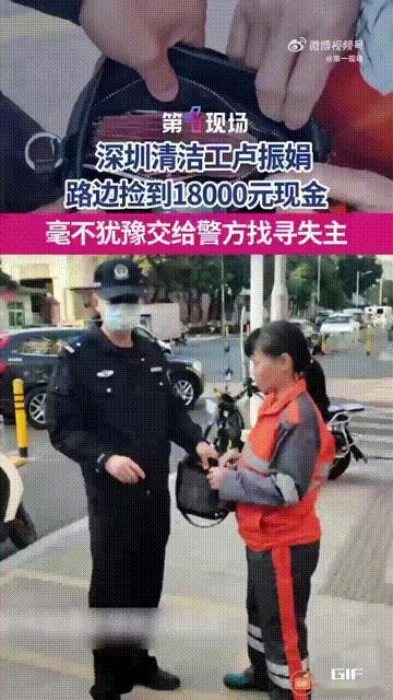最美清洁工!广东深圳一位清洁工阿姨在街边工作时,突然看见地上有一个黑色的挎包,打开一看,发现里面居然有18000元现金。 因为担心失主会着急,于是她当即上报给自己的领导,让领导帮忙报警寻找失主。 而失主得知这一切后,也是感动得泣不成声,直言“这个世界上的好人太多了。” 但对于清洁工阿姨来说,她表示自己的工资虽然不是很高,但也不能拿这种钱。 事后领导回应,表示阿姨做得很好,会对她进行奖励和表扬。 网友看完这段视频,都觉得这位清洁工阿姨的做法,实在是太让人感到暖心了。 都说“人穷志不穷”,相信这句话此刻也是具象化了,这位阿姨的工资虽然不高,平时工作也很辛苦,但她却非常地有原则,不会去贪图不属于自己的钱。 她有着拾金不昧的良好品德,这是非常好的品质,相信她的精神会感染更多人,让这个世界变得更加美好。 从失主那句“这个世界上还是好人多”就能看出,如今社会上的很多人都非常善良和热心,我们应该鼓励这种好的品质,这样社会才会变得更加美好。大家怎么看呢?