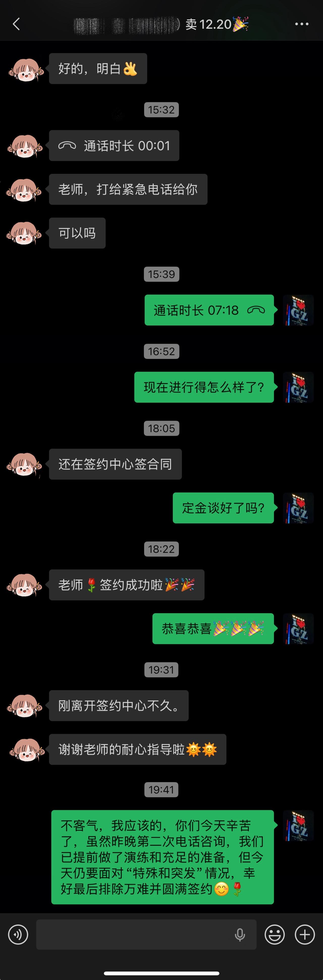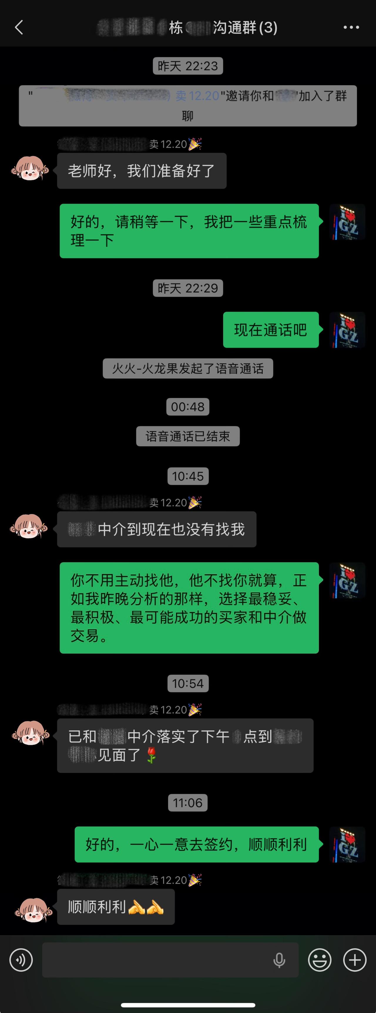 恭喜这位用户成功卖出房屋,12月20日做第一次电话咨询,昨天(1月3日)是元旦假期最后一天,中介(买家)再次报价。经过我详细分析和评估后,判断案子正式进入【卖房的第三阶段】,即签约前的谈判-博弈-拉扯。 由于时间紧迫,我不想用户错过卖出时机,建议用户和家人(三方一起)做第二通电话咨询。用户果断,晚上10点半,我在电话里头手把手指导用户怎么与中介博弈、拉扯直至深夜12点半。 之所以花这么多时间去指导用户,一方面,是中介(买家)那边实在太滑头,不好应付。临门一脚,一不小心就容易前功尽废。二方面是因为我的做事风格稳妥,必须要确保签约【万无一失】。 我做了三年的卖房咨询,撞过不少板,正因为经历了这些教训,所以我不希望再【重复犯错】。 可能有些网友看到别人成功卖出都归于【幸运】,但你不知道的是,要成功是需要耗费很多时间和精力,以及互信、合作。 虽然昨晚已经和中介确定好成交条件,但今天面谈时仍出现特殊和突发的事情。由于事态紧急,用户立刻打电话给我,我毫不犹豫就接听。指导用户,稳定ta们的情绪。幸好最后用户和家人临危不乱,最终成功签约。 整个卖房过程非常不容易,但关关难过、关关过。有机会再详细复盘。现在我先为用户及其家人送上真挚的祝福,接下来一帆风顺,心想事成,开开心心地等春节佳节了。[送心]