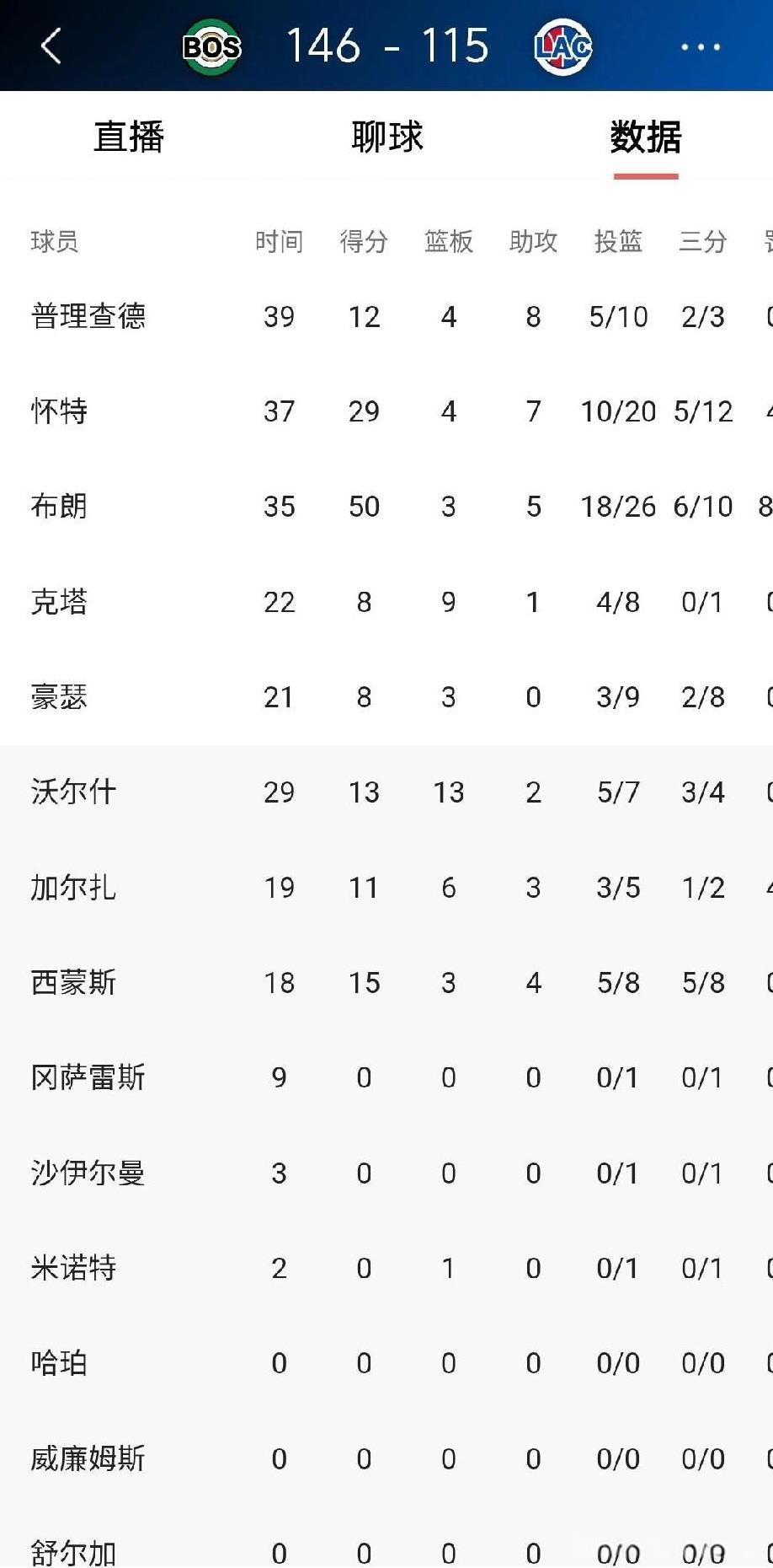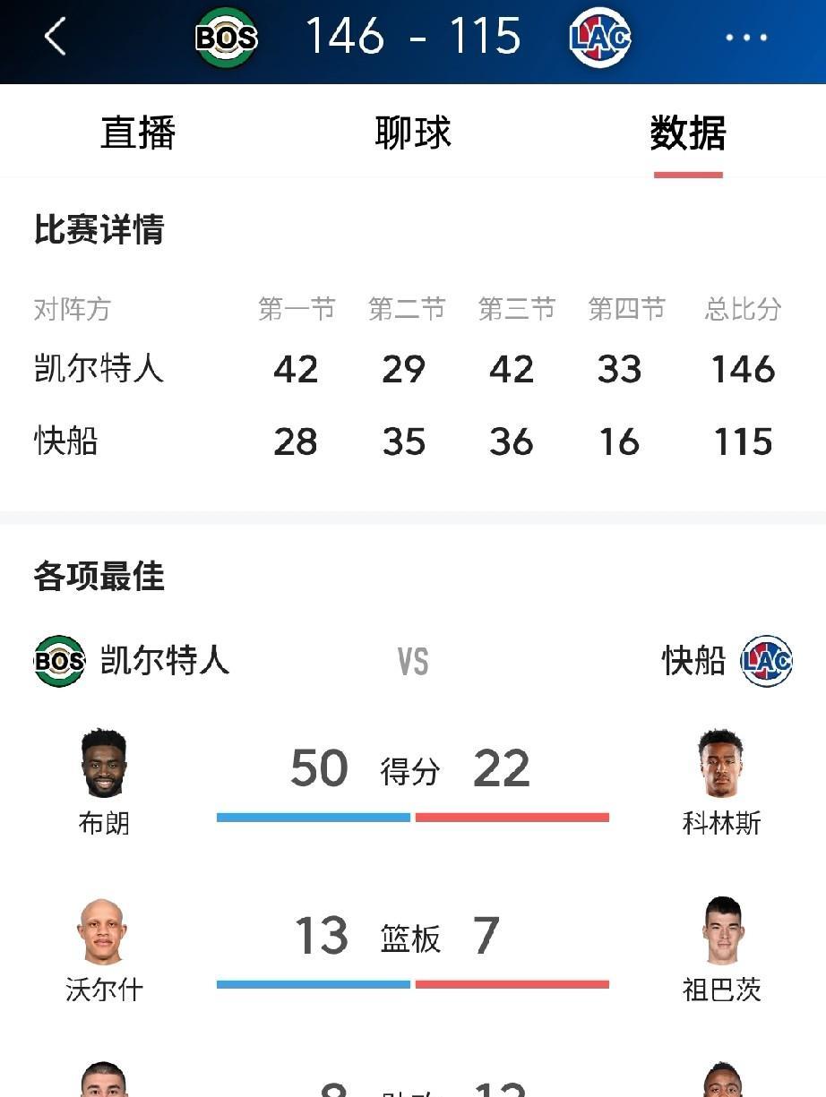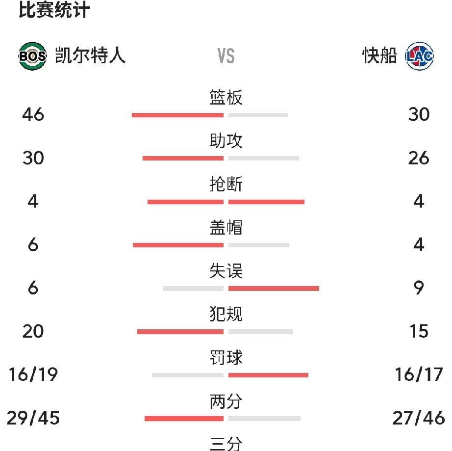 心机卡哑火,快船篮板被凯尔特人打爆,主场31分惨败,6连胜被终结。 快船失利还有一个原因是内线被凯尔特人控制。凯尔特人本场篮板球以46-30赢下16个。尤其是替补大前沃尔什一人抢下13个篮板,包含6个前场篮板。凯尔特人通过掌控篮板优势获得的二次得分高达21分,而快船只有9分。 快船本场惨败不由得让人怀疑此前的六连胜究竟是不是昙光一现,还是仅仅因为战术风格被凯尔特人克制才溃败。 获胜后的凯尔特人距离东部第二尼克斯仅半场差距,这成绩还是在缺大少球队老大塔图姆情况下取得的,太恐怖了!