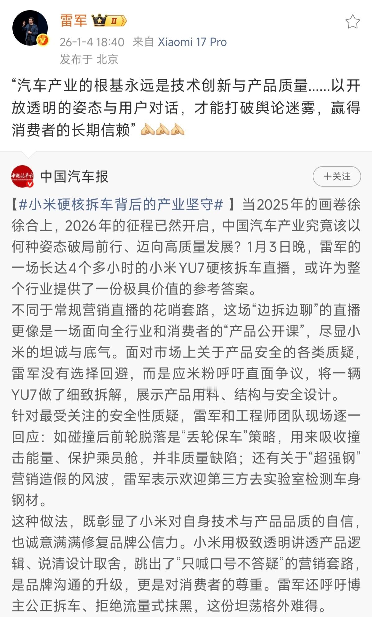 小米硬核拆车背后的产业坚守“直播拆车”这事,背后是小米足够扎实的底气和实力。小米汽车本就处于“放大镜挑刺”的舆论环境中,这次新年直播雷总亲自下场,以“放大镜”的直播视角带网友们亲眼见证小米汽车的内核,每一环都拆开拆碎讲清楚——以「真实」击碎一切虚无的质疑,这是对负面舆论最有效、最正面的回应。如此公开透明的直播形式的确在汽车行业难能可贵。用户能清晰地知晓产品的每一处细节,小米也能以事实回应网络舆论,这是小米对自家产品的高度自信,更是对用户、对车主负责尽责的体现。一个好的产品营销从不是空口说白话,而是要落到“事实”、落到“细节”,这是小米自始至终对“与用户交朋友”理念的坚守,更是值得全行业学习与跟进的路径。希望行业内这样的“拆车直播”应该会越来越多,毕竟“讲清事实、展示真本领”才是硬道理