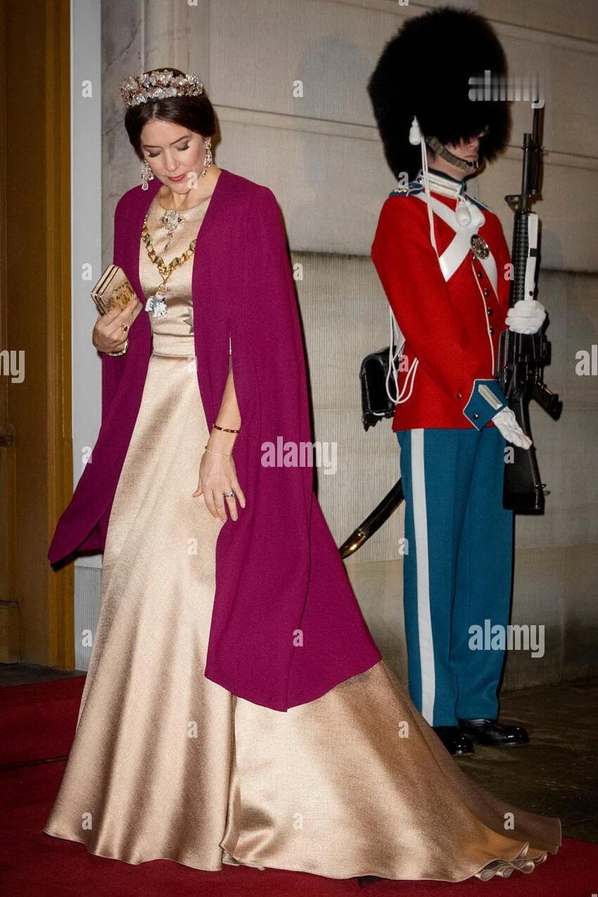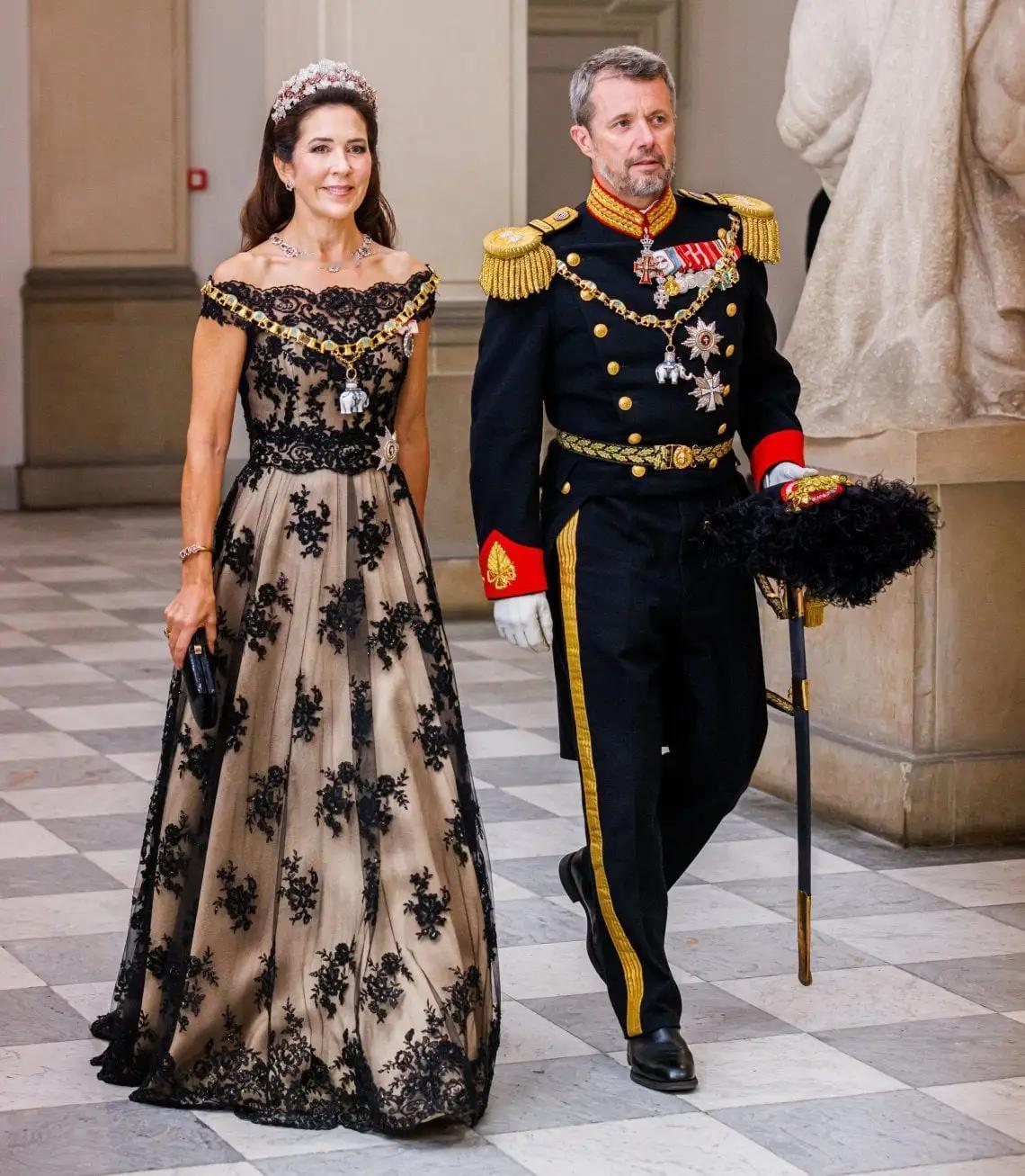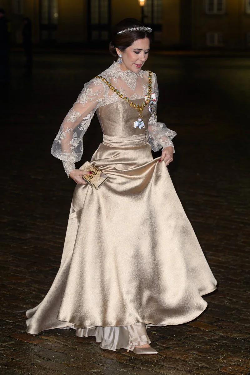 来聊聊丹麦王后玛丽在新年接待会上穿的金色缎面礼服 关注贵圈久了的童鞋对它肯定不陌生,它最早见于2017年,初始版本为短袖长礼服,来自本土设计师Jesper Høvring 图2其实也还是原版,外搭紫红色披肩挡风,有了颜色上的对比质感直线上升 第二版出现在2022年,改成一字肩+叠了黑蕾丝,据说歪果仁挺喜欢这版。就……审美差异吧= = 2024年访问瑞典时出现了第三个版本,只取下半身,搭配红色蕾丝上衣 前几天的属于第四版,礼服原版上半身在一字肩以后只能改成抹胸,然后加一件Lasse Spangenberg Copenhagen的米白色蕾丝上衣 本身金色缎面的质感实在没法说,肉眼可见的好。至于蕾丝适不适合50+的玛丽,就见仁见智了