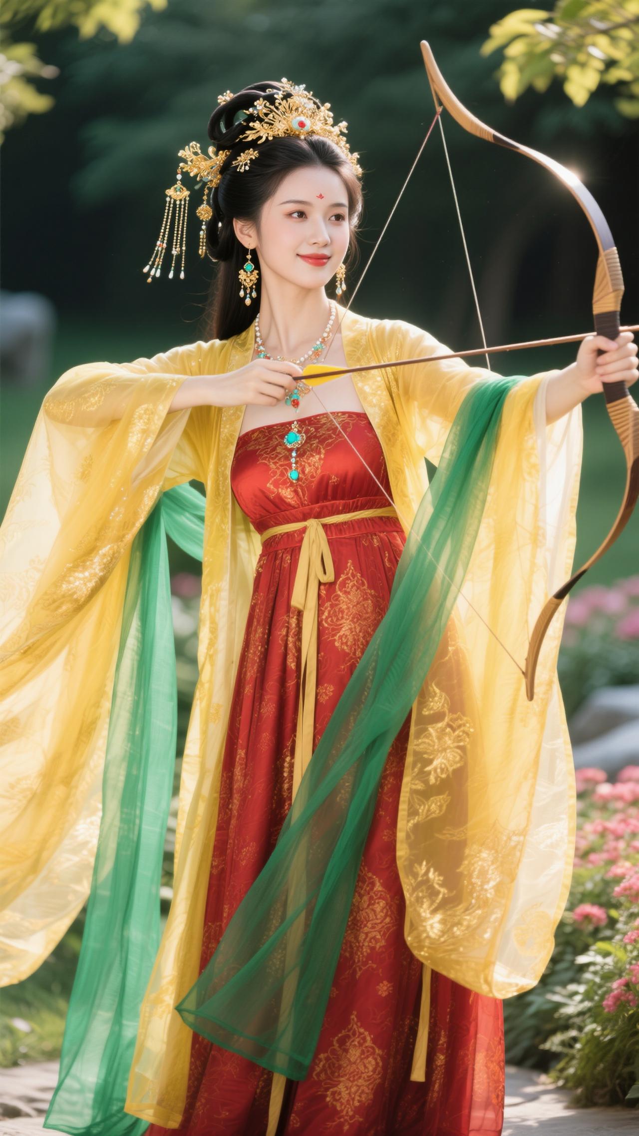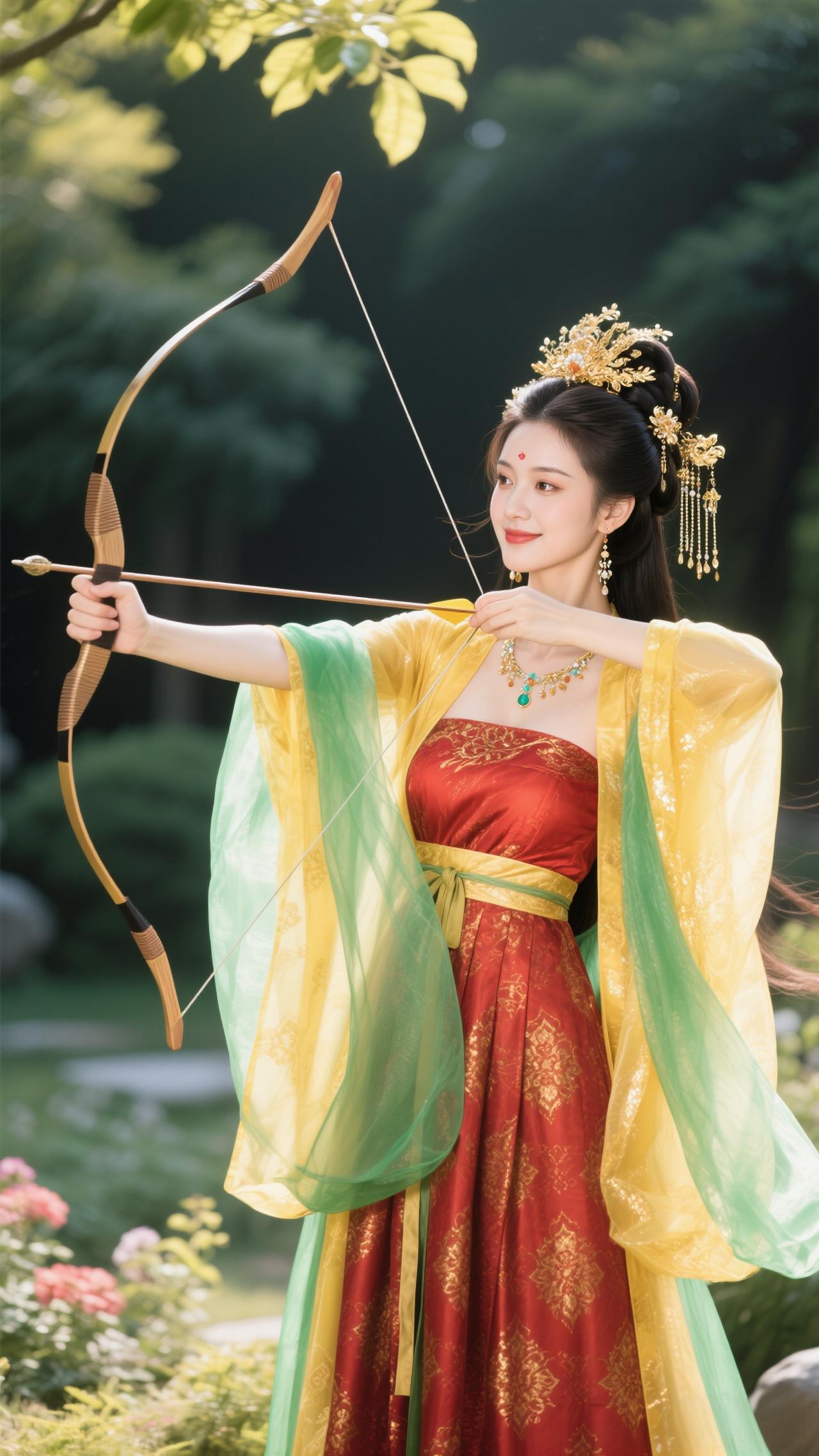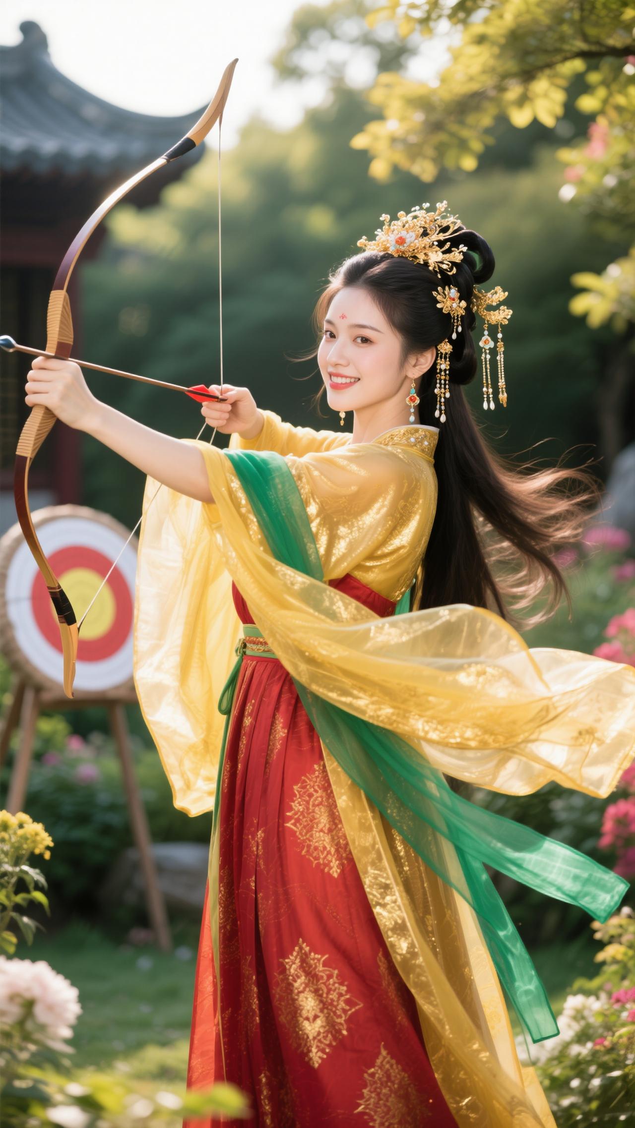《蝶恋花·金裳射情》 黄袂红裙凝晓色,青绦飘卷,笑把雕弓擘。 一箭流光如星落,似借丘比特情魄。 园里繁花风里绽,弦上飞镝,惹得春心颤。 不向云端寻鹊伴,只将情箭撩花岸。