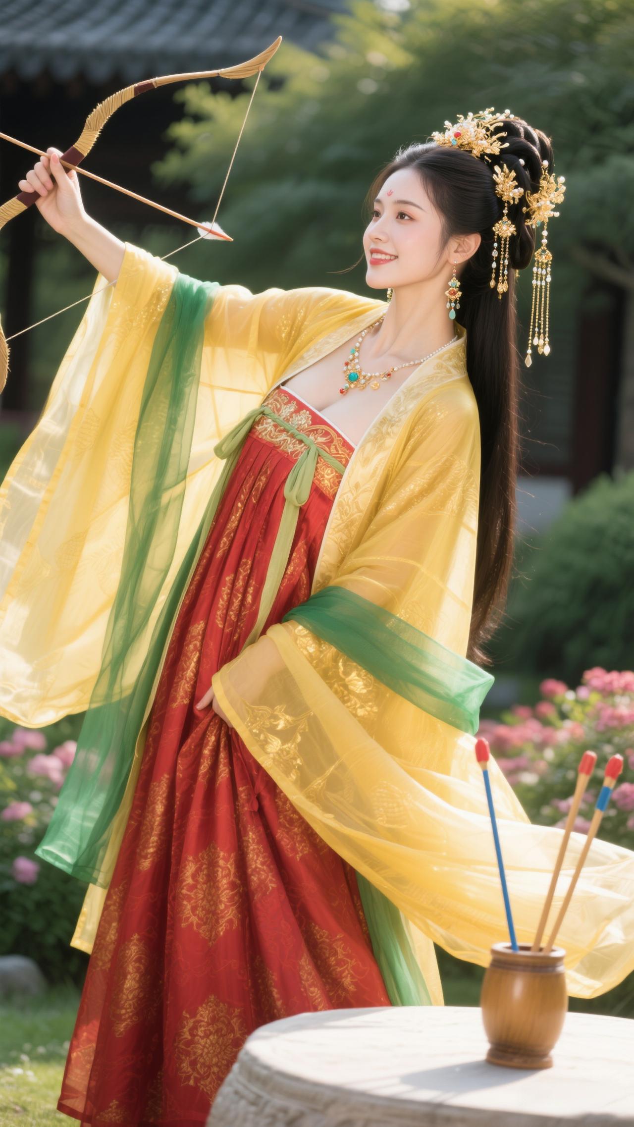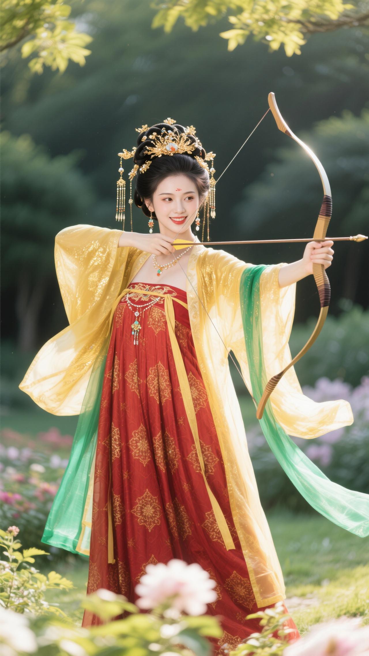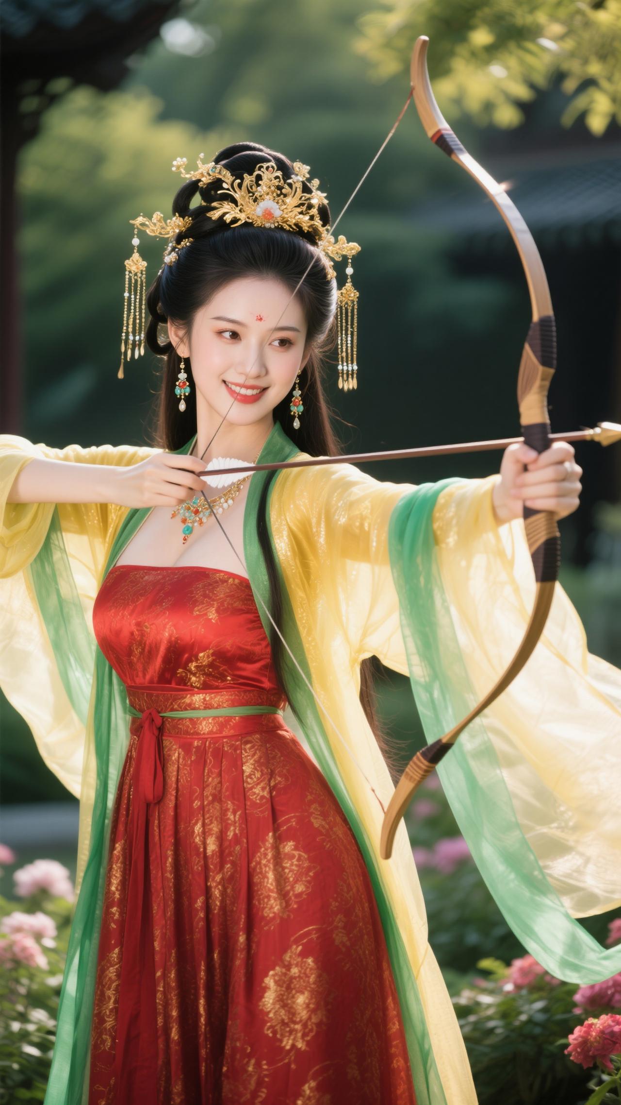 《蝶恋花·金裳射情》 黄袂红裙凝晓色,青绦飘卷,笑把雕弓擘。 一箭流光如星落,似借丘比特情魄。 园里繁花风里绽,弦上飞镝,惹得春心颤。 不向云端寻鹊伴,只将情箭撩花岸。