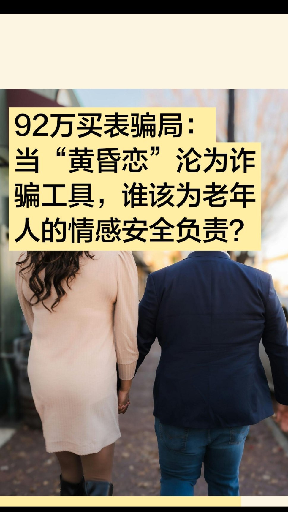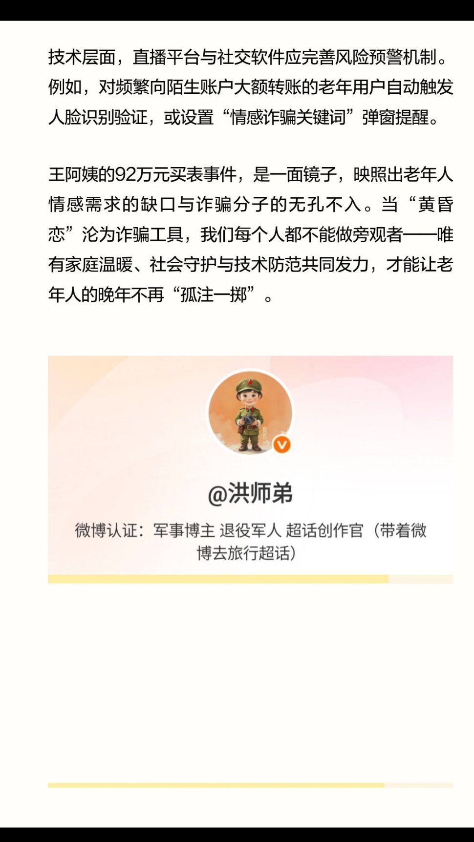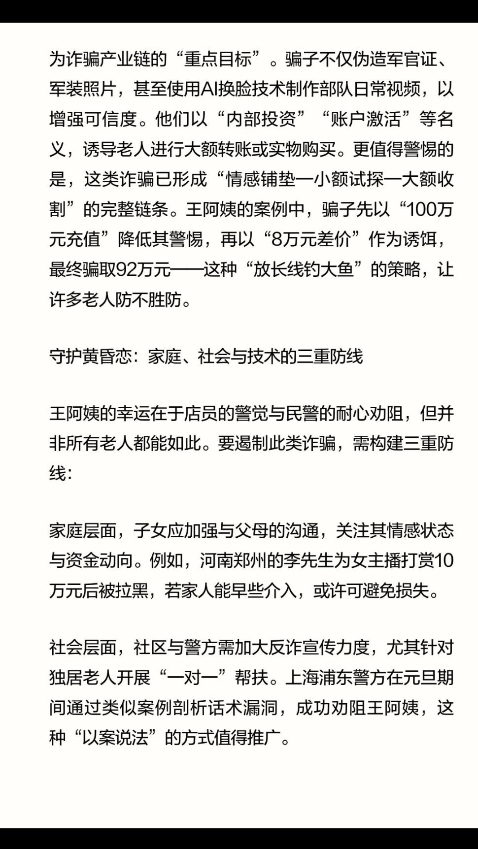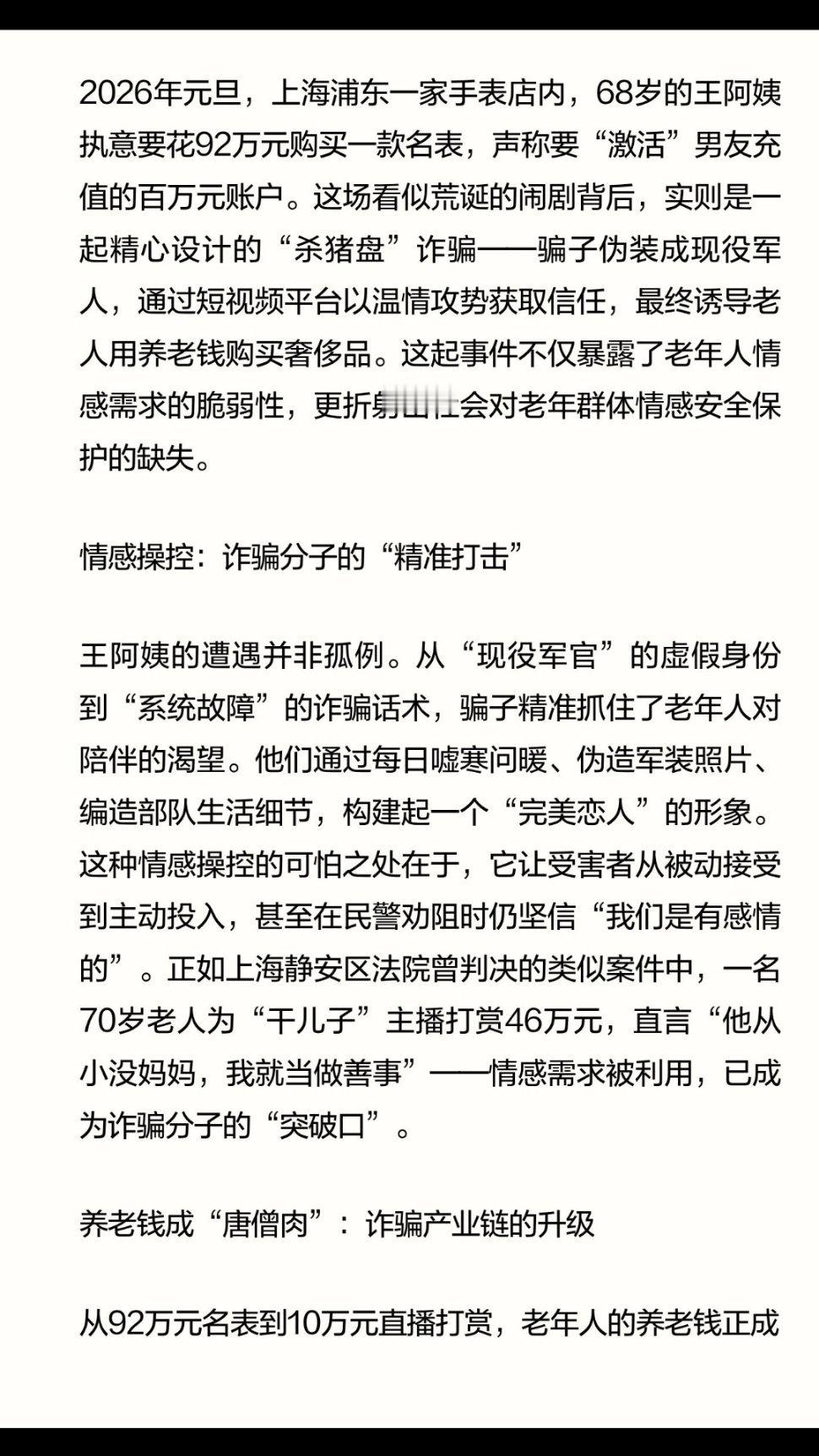 | 2026年元旦,上海浦东一家手表店内,68岁的王阿姨执意要花92万元购买一款名表,声称要“激活”男友充值的百万元账户。这场看似荒诞的闹剧背后,实则是一起精心设计的“杀猪盘”诈骗——骗子伪装成现役军人,通过短视频平台以温情攻势获取信任,最终诱导老人用养老钱购买奢侈品。从“现役军官”的虚假身份到“系统故障”的诈骗话术,骗子精准抓住了老年人对陪伴的渴望。他们通过每日嘘寒问暖、伪造军装照片、编造部队生活细节,构建起一个“完美恋人”的形象。这种情感操控的可怕之处在于,它让受害者从被动接受到主动投入,甚至在民警劝阻时仍坚信“我们是有感情的”。正如上海静安区法院曾判决的类似案件中,一名70岁老人为“干儿子”主播打赏46万元,直言“他从小没妈妈,我就当做善事”——情感需求被利用,已成为诈骗分子的“突破口”。从92万元名表到10万元直播打赏,老年人的养老钱正成为诈骗产业链的“重点目标”。骗子不仅伪造军官证、军装照片,甚至使用AI换脸技术制作部队日常视频,以增强可信度。他们以“内部投资”“账户激活”等名义,诱导老人进行大额转账或实物购买。更值得警惕的是,这类诈骗已形成“情感铺垫—小额试探—大额收割”的完整链条。王阿姨的案例中,骗子先以“100万元充值”降低其警惕,再以“8万元差价”作为诱饵,最终骗取92万元——这种“放长线钓大鱼”的策略,让许多老人防不胜防。王阿姨的幸运在于店员的警觉与民警的耐心劝阻,但并非所有老人都能如此。要遏制此类诈骗,需构建三重防线:家庭层面,子女应加强与父母的沟通,关注其情感状态与资金动向。例如,河南郑州的李先生为女主播打赏10万元后被拉黑,若家人能早些介入,或许可避免损失。社会层面,社区与警方需加大反诈宣传力度,尤其针对独居老人开展“一对一”帮扶。上海浦东警方在元旦期间通过类似案例剖析话术漏洞,成功劝阻王阿姨,这种“以案说法”的方式值得推广。技术层面,直播平台与社交软件应完善风险预警机制。例如,对频繁向陌生账户大额转账的老年用户自动触发人脸识别验证,或设置“情感诈骗关键词”弹窗提醒。王阿姨的92万元买表事件,是一面镜子,映照出老年人情感需求的缺口与诈骗分子的无孔不入。当“黄昏恋”沦为诈骗工具,我们每个人都不能做旁观者——唯有家庭温暖、社会守护与技术防范共同发力,才能让老年人的晚年不再“孤注一掷”。