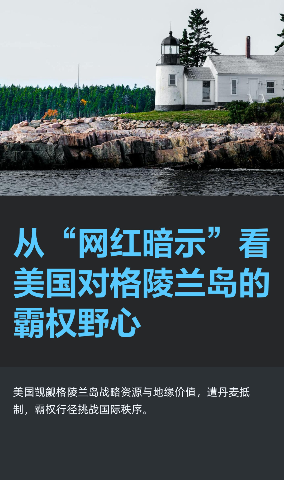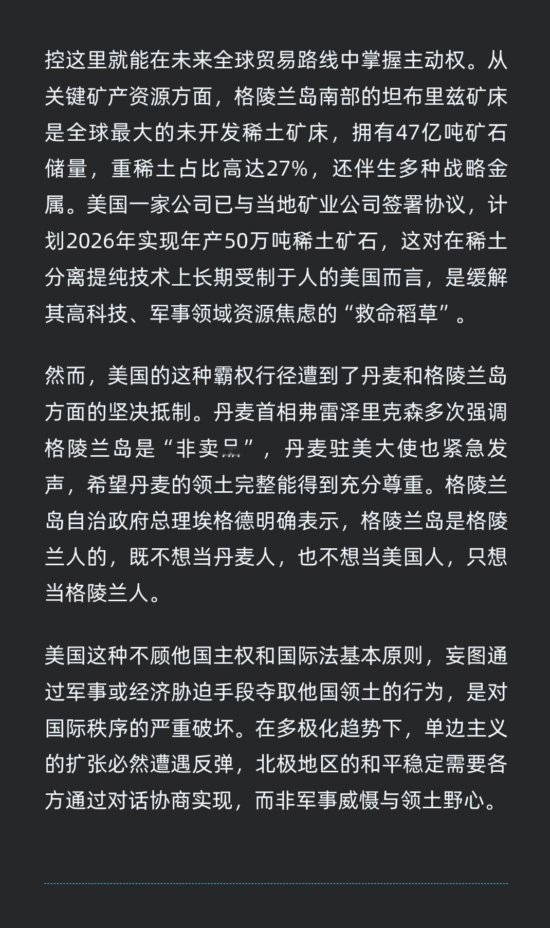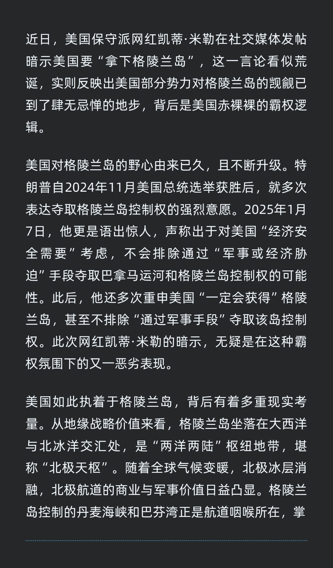 | 近日,美国保守派网红凯蒂·米勒在社交媒体发帖暗示美国要“拿下格陵兰岛”,这一言论看似荒诞,实则反映出美国部分势力对格陵兰岛的觊觎已到了肆无忌惮的地步,背后是美国赤裸裸的霸权逻辑。美国对格陵兰岛的野心由来已久,且不断升级。特朗普自2024年11月美国总统选举获胜后,就多次表达夺取格陵兰岛控制权的强烈意愿。2025年1月7日,他更是语出惊人,声称出于对美国“经济安全需要”考虑,不会排除通过“军事或经济胁迫”手段夺取巴拿马运河和格陵兰岛控制权的可能性。此后,他还多次重申美国“一定会获得”格陵兰岛,甚至不排除“通过军事手段”夺取该岛控制权。此次网红凯蒂·米勒的暗示,无疑是在这种霸权氛围下的又一恶劣表现。美国如此执着于格陵兰岛,背后有着多重现实考量。从地缘战略价值来看,格陵兰岛坐落在大西洋与北冰洋交汇处,是“两洋两陆”枢纽地带,堪称“北极天枢”。随着全球气候变暖,北极冰层消融,北极航道的商业与军事价值日益凸显。格陵兰岛控制的丹麦海峡和巴芬湾正是航道咽喉所在,掌控这里就能在未来全球贸易路线中掌握主动权。从关键矿产资源方面,格陵兰岛南部的坦布里兹矿床是全球最大的未开发稀土矿床,拥有47亿吨矿石储量,重稀土占比高达27%,还伴生多种战略金属。美国一家公司已与当地矿业公司签署协议,计划2026年实现年产50万吨稀土矿石,这对在稀土分离提纯技术上长期受制于人的美国而言,是缓解其高科技、军事领域资源焦虑的“救命稻草”。然而,美国的这种霸权行径遭到了丹麦和格陵兰岛方面的坚决抵制。丹麦首相弗雷泽里克森多次强调格陵兰岛是“非卖品”,丹麦驻美大使也紧急发声,希望丹麦的领土完整能得到充分尊重。格陵兰岛自治政府总理埃格德明确表示,格陵兰岛是格陵兰人的,既不想当丹麦人,也不想当美国人,只想当格陵兰人。美国这种不顾他国主权和国际法基本原则,妄图通过军事或经济胁迫手段夺取他国领土的行为,是对国际秩序的严重破坏。在多极化趋势下,单边主义的扩张必然遭遇反弹,北极地区的和平稳定需要各方通过对话协商实现,而非军事威慑与领土野心。