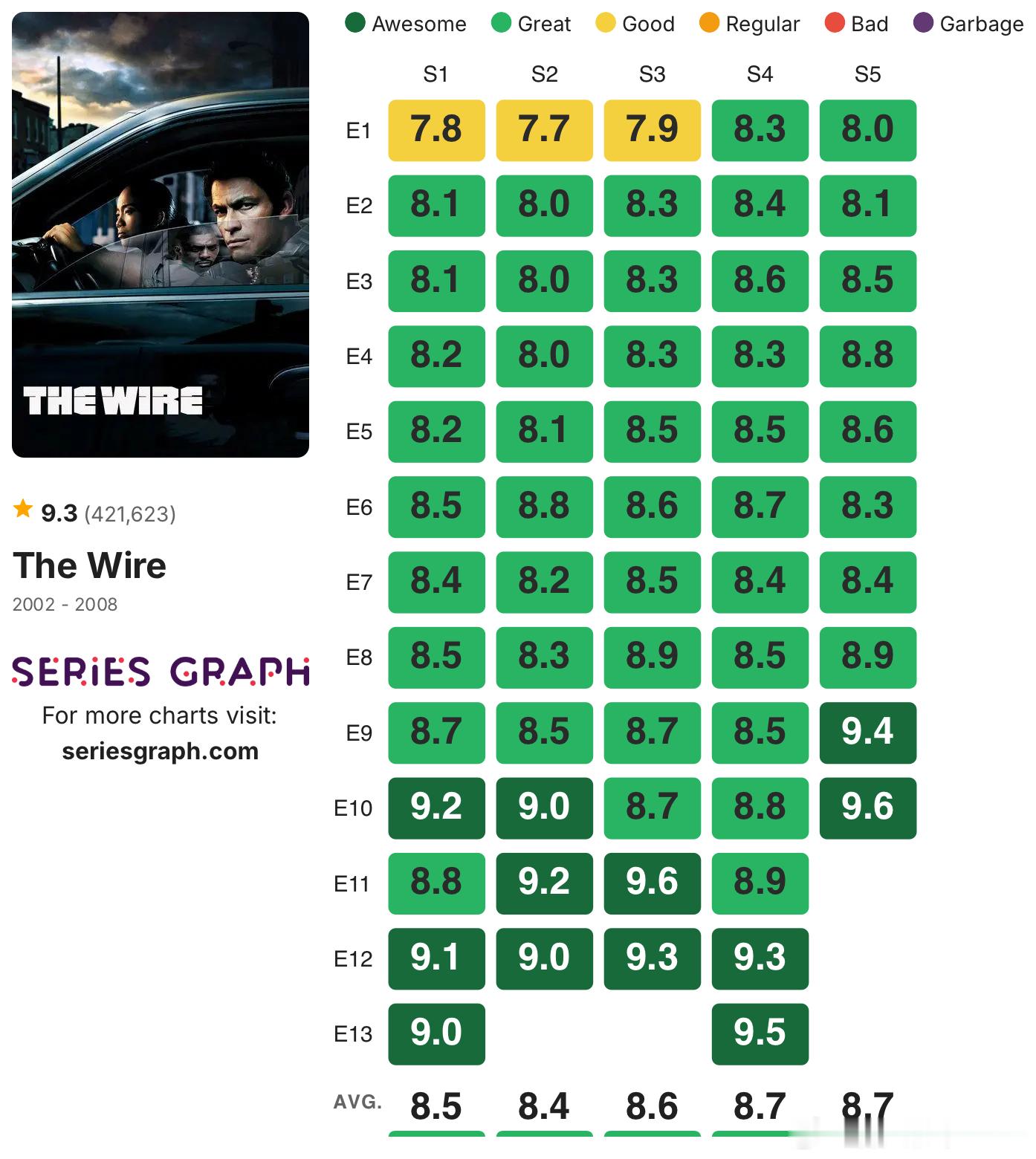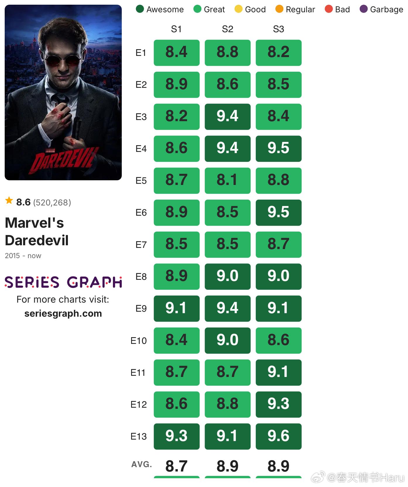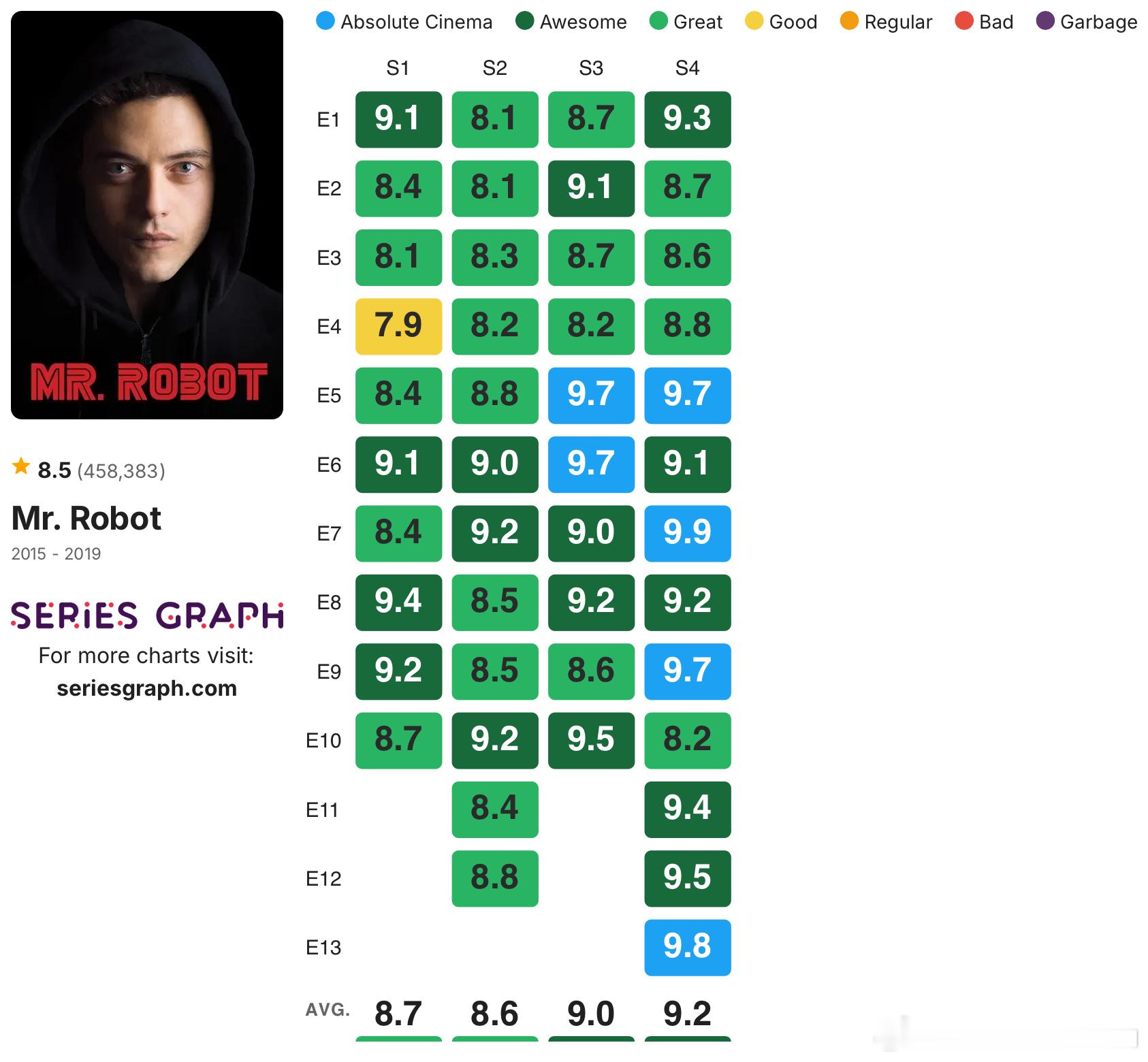 发一些没烂尾的高分剧集的IMDb单集评分:《绝命毒师》《风骚律师》《黑道家族》《火线》《暗黑》《夜魔侠》《黑客军团》《神探夏洛克》《继承之战》《毒枭》《浴血黑帮》《我们这一天》