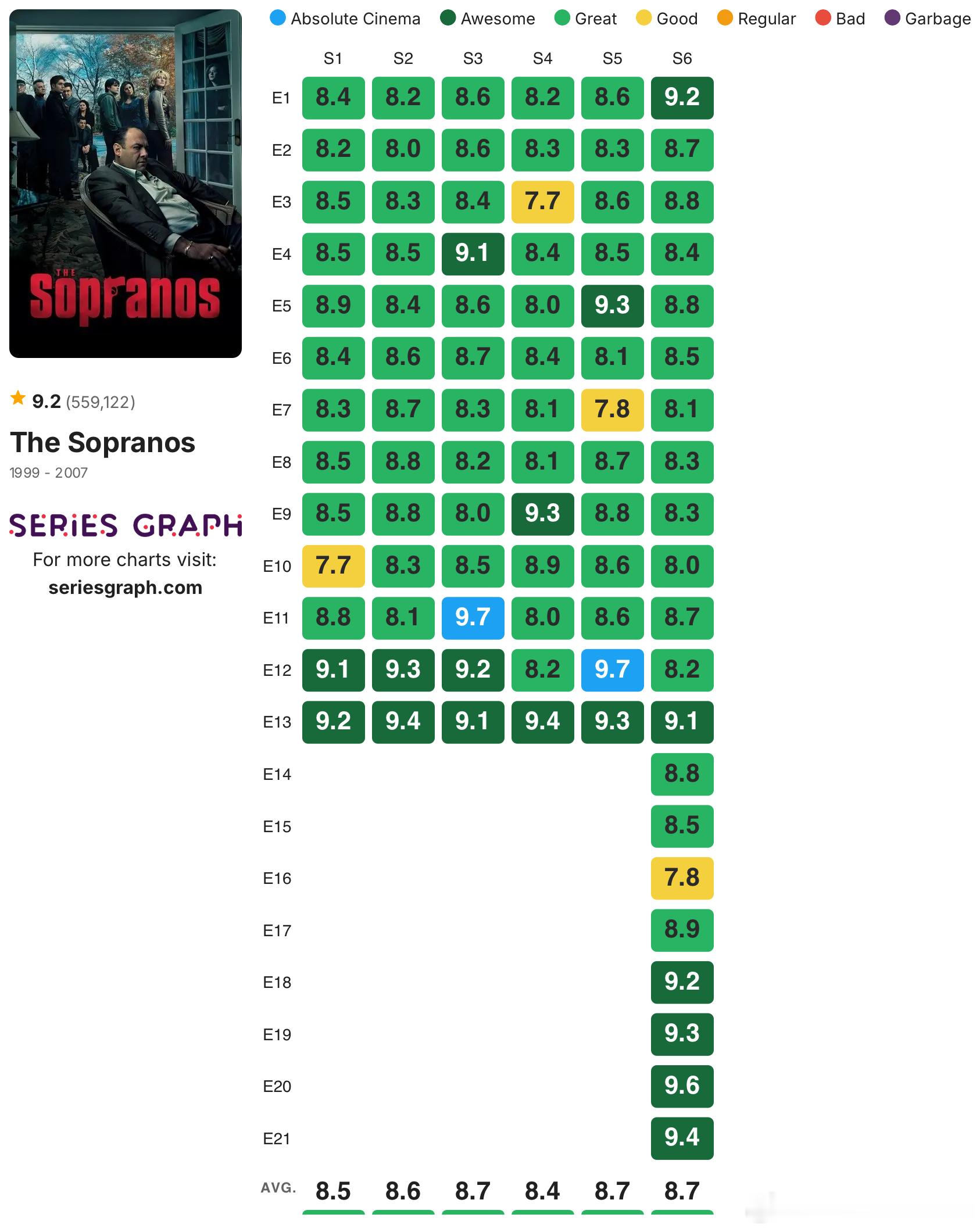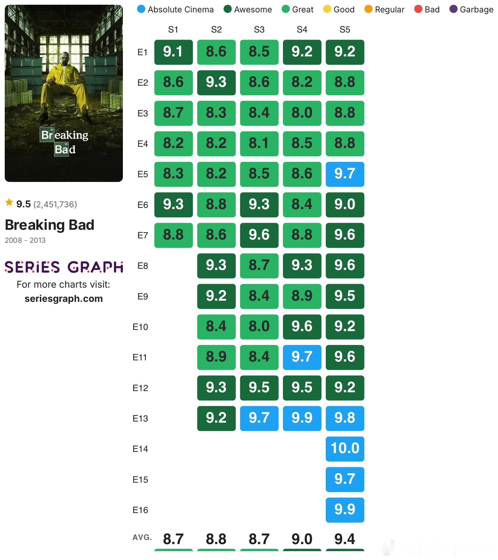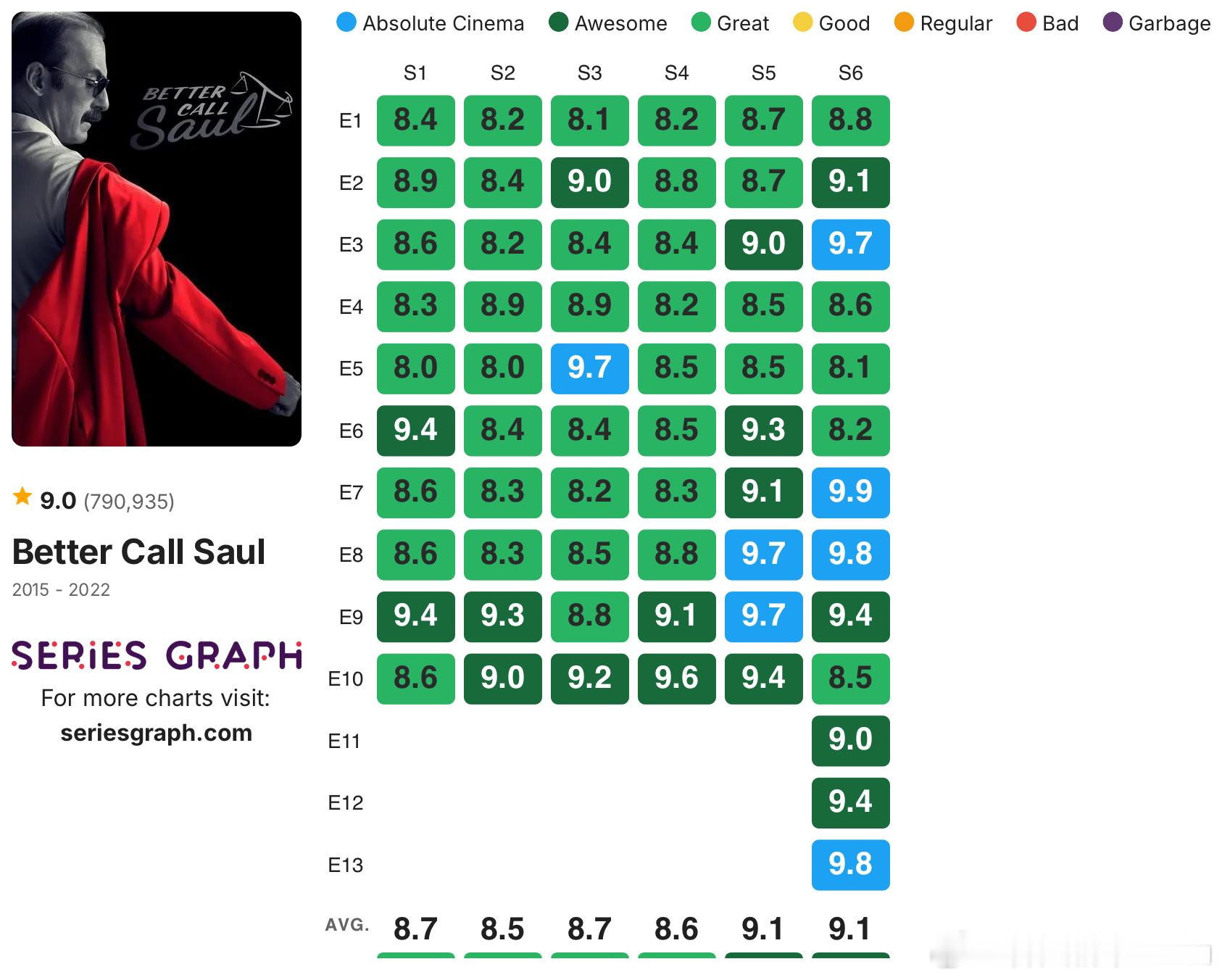 发一些没烂尾的高分剧集的IMDb单集评分:《绝命毒师》《风骚律师》《黑道家族》《
