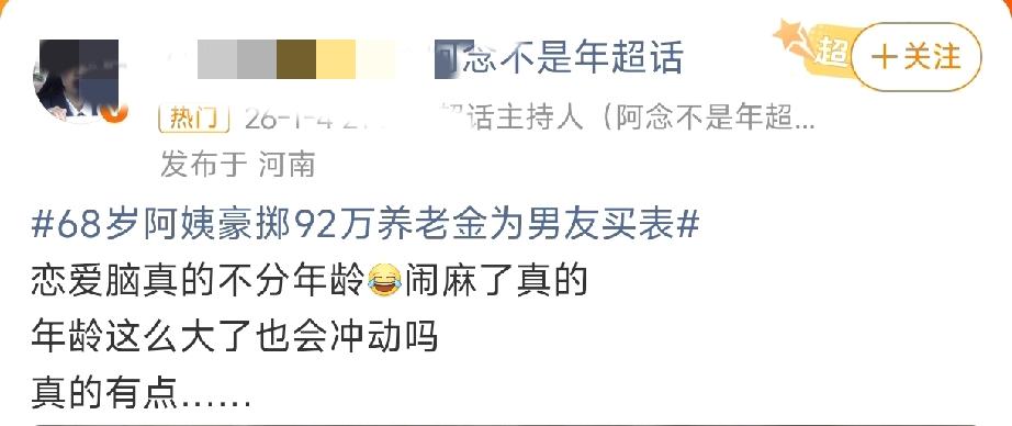 “警察同志,我们是有感情的,你们别管!”——元旦那天,上海浦东一家手表店里,68岁的谢阿姨差点把92万养老金全砸进去。 事情是这样的。谢阿姨在短视频平台刷到了个“现役军人”,一来二去,聊出了感情。对方说给她在珠宝APP里充了100万,可系统出问题了,钱取不出来。 解决办法呢?买块92万的名表寄过去,就能“激活”账户,还能白赚8万块差价。这话说得天花乱坠,阿姨信了,带着银行卡直奔店里。 店员一听要买这么贵的表送人,立马觉得不对劲,偷偷报了警。浦东梅园新村派出所的民警马佳慧和曹嘉骏赶过来,阿姨情绪挺激动,死活不听劝。 两位民警没硬来,搬了个凳子坐下,一点点拆穿骗子的套路。什么“军人身份”是假的,“充值截图”是P的,“激活账户”更是扯淡。 整整一个小时,从固执到沉默,从沉默到恍然大悟。阿姨最后拍着胸口后怕:“那是我的养老钱啊,谢谢你们!”92万,就这么守住了。 这事儿让人心里不是滋味。骗子盯上的是钱,可打中的却是老年人那颗孤单的心。跳广场舞、刷短视频,表面上热热闹闹,可心里头的空虚,谁来填?一个素未谋面的“男友”,几句甜言蜜语,就能让阿姨掏出全部身家。 她抵触民警时那句“我们是有感情的”,听着真叫人心酸。 反诈年年讲,可骗局年年新。这回多亏了警觉的店员和耐心的民警,但更重要的是,家里人多陪陪老人,社区多组织点活动,让骗子那句“我们是有感情的”,没那么容易钻空子。 养老钱保住了,可心里的空缺,还得靠温暖来填。