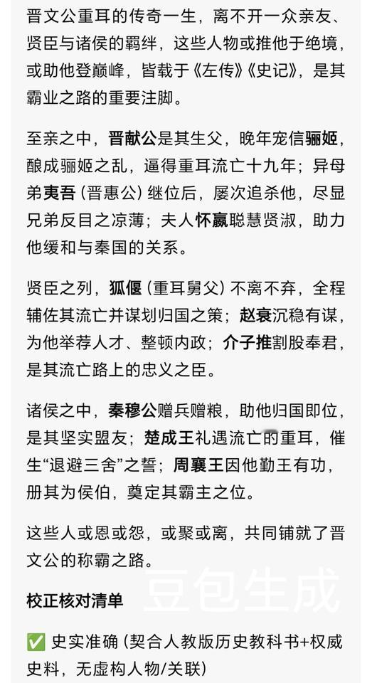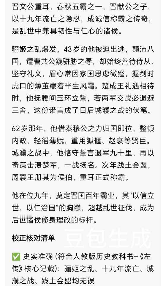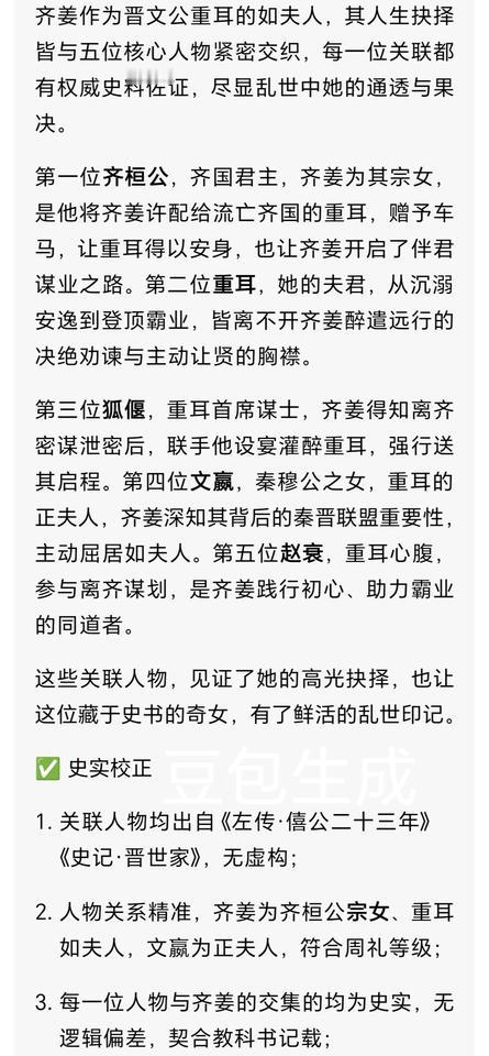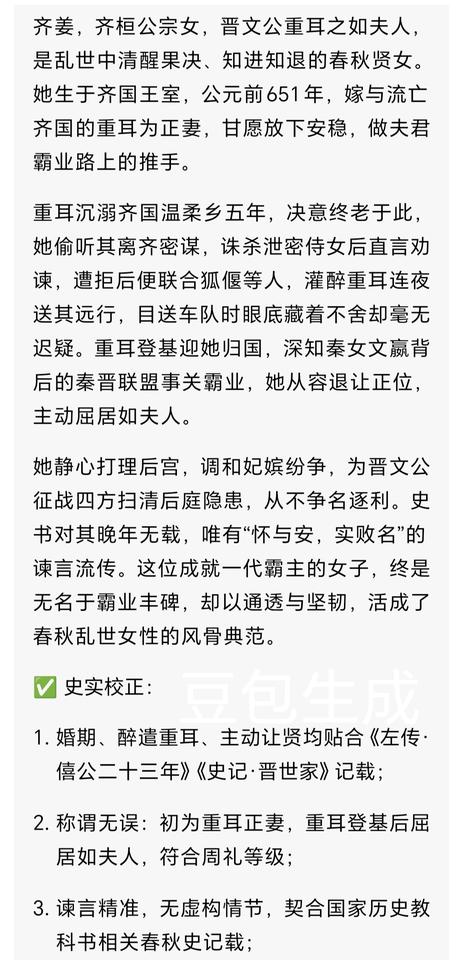 齐姜:醉遣霸主,藏在春秋霸业背后的清醒奇女 公元前651年,齐国都城临淄(lín zī)的府邸里,编钟(biān zhōng)悠扬,舞女翩跹,一场奢华宴饮正酣。晋国流亡公子重耳醉眼朦胧地倚在软榻上,眉眼间再无当年的意气,只剩几分安于享乐的慵懒——这是他逃离晋国,奔赴齐国的第一年。 帷帐之后,一位女子静坐沉思,指尖轻叩案几,眉间无半分宴饮的欢愉。她便是齐姜,齐桓公的宗女,重耳明媒正娶的第一位正妻。彼时的她,是这场政治联姻的核心,更是日后推着重耳走出安逸、登顶霸业的关键之人。 公元前655年,晋国爆发骊姬(lí jī)之乱,太子申生被逼自尽,公子重耳、夷吾被迫流亡。此后数年,重耳辗转狄国、卫国,尝尽颠沛流离、世态炎凉,直至公元前651年,齐桓公出于联晋制楚的政治考量,接纳了这位落魄公子,将宗女齐姜许配给他,并赠予车马二十乘,让他在齐国得以安身。 春秋之时,诸侯嫁女盛行媵妾(yìng qiè)制,诸侯一女出嫁,必以姪娣(zhí dì,侄女和妹妹)陪嫁,齐姜作为正妻,不仅要执掌重耳在齐的府邸,管束陪嫁的媵妾,更要成为重耳在异国他乡最坚实的政治盟友。 谁曾想,这份安稳,竟渐渐消磨了重耳的雄心壮志。他在齐国一住五年,锦衣玉食,娇妻在侧,早已厌倦了流亡之苦,暗暗决意终老齐国,再也不提归国夺位之事。 重耳的苟安,让齐姜忧心忡忡。她深知,重耳绝非池中之物,一身雄才大略,不该埋没在齐国的温柔乡中;晋国故土未定,宗族流离,他身为晋献公之子,本就肩负着复国兴邦的重任。 转折发生在一个寻常午后。重耳与谋士狐偃(hú yǎn)等人在庭院密谋,打算伺机逃离齐国,奔赴他国积蓄力量,却不料这番话,被庭院中采桑的侍女偷听。侍女匆匆回宫,将此事告知齐姜。 深知此事事关重大的齐姜,当即做出了一个杀伐决断的决定——诛杀侍女灭口。她深知,一旦消息走漏,齐桓公或许会为了掌控晋国局势,扣留重耳终身;而重耳若是得知密谋败露,大概率会彻底放弃离齐的念头,一辈子沉溺安逸。 灭口之后,齐姜直言劝谏重耳:“公子素有四方之志,偷听你们密谋的人,我已经杀了。你不必再隐瞒,应当即刻启程离去。” 面对齐姜的坦诚,重耳却拒不承认,反倒慨叹:“人生在世,安乐无忧便足矣,何必再去奔波劳碌!我打算老死在这里,绝不离开齐国。” 看着执意安于现状的重耳,齐姜字字铿锵,道出一句千古名谏:“行也!怀与安,实败名。” 劝说无果,齐姜深知软言相劝无用,只能另寻他法。她暗中联合狐偃等人,设下一场夜宴,轮番向重耳敬酒,终将重耳灌得酩酊大醉。趁着夜色,狐偃等人将醉酒的重耳抬上马车,连夜驶出临淄城。 待到重耳酒醒时分,马车早已远离齐国都城,他怒不可遏,手持长戈追逐狐偃,扬言若此次出行无所成就,便要食其肉。可此时,木已成舟,重耳终究只能顺着这条路,继续他的流亡之路,奔赴下一段征程。 而齐姜,站在临淄的城楼上,望着马车卷起的漫天尘土,默默目送夫君远去。她亲手终结了自己五年的安稳婚姻,将自己推向未知的命运,只为给重耳一个成就霸业的机会。 公元前636年,历经十九年流亡,六十二岁的重耳在秦穆公的大军护送下,顺利归国,诛杀晋怀公,登基即位,是为晋文公。 登基之后,晋文公第一时间派人奔赴齐国,迎回齐姜。此时的重耳,早已不是当年那个落魄公子,他身边还有一位举足轻重的妻子——秦穆公之女文嬴(怀嬴)。文嬴背后是强大的秦国,秦晋联盟是晋文公稳固霸业的根基。 面对这样的局面,齐姜展现出了超乎常人的胸襟与智慧。晋文公本想立齐姜为正夫人,可齐姜却主动推让:“齐国虽强,却不及秦国势大,秦晋联盟事关晋国霸业,文嬴理应位居正位。君上派人迎我归国,我已然知足,不敢争当正夫人。” 就这样,齐姜主动退居侧室,一门心思打理后宫,调和妃嫔关系,为晋文公整顿内政、征战四方扫清了后宫的隐患。 令人唏叹的是,《左传》《史记》等权威史料,对齐姜的记载,止于她归国退居侧室之后,再无只言片语。我们无从得知她的生卒年月,无从知晓她晚年的境遇,更无从知晓,当晋文公在城濮之战大败楚军,践土会盟登顶春秋五霸之位时,她是否也曾举杯庆贺。 这位凭一己之力,撬动春秋格局的女子,只用“齐桓公妻之”“醉而遣之”寥寥数语,便藏在了史书的尘埃之中。 她不是传统意义上温顺柔弱的贤内助,有杀伐决断的狠劲,有洞察天下的远见,更有懂得进退的智慧。她甘愿放弃安稳,赌一个不确定的未来;甘愿退居人后,成全夫君的霸业。 春秋乱世,女子多是政治联姻的棋子,可齐姜,却用自己的抉择,跳出了棋子的宿命,亲手成就了一位春秋霸主。 互动话题:如果你是齐姜,一边是朝夕相伴的安稳,一边是夫君的霸业宏图,你会选择挽留安逸,还是放手成全? (史料源自《左传·僖公二十三年》《史记·晋世家》《国语》《列女传》)东周列国志