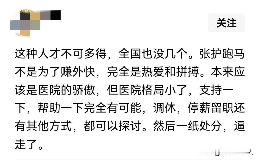 一个爱跑马的护士辞职了,引来一帮杠精。头条真是人才济济啊!杠精多的是,真是搞笑至极。这些人真的觉得这世上“众人皆醉我独醒”? 一个爱跑马的护士,因为不能兼顾工作和爱好而选择主动辞职,这本来是一个双向选择、双向奔赴,有些人真是脑洞大开硬是自以为是的觉得“阴谋论”、“谋杀论”。 有人硬是把这个锅扣到医院头上去,觉得是“医院逼走了张水华”。简直是可笑至极。 比如这个网友发文:这种人才不可多得,全国也没几个。张护跑马不是为了赚外快,完全是热爱拼搏。本来应该是医院的骄傲,但医院格局小了,支持一下,帮助一下完全有可能,调休,停薪留职还有其他方式,都可以探讨。然后一纸处分,逼走了。 这调调让我想起了某个大主播的“丈母娘粉丝”们,也让我想起了所谓的白老师那番“医院领导应该有格局,应该把张水华护士调到工会,让她发挥所长,带动医院乃至福建省的全民健身运动”。 首先,医院是治病救人的地方,不是慈善休闲单位,设这个岗位就是需要有人要干这个岗位的活,占个岗位不好好干活就该被淘汰,不是你干这个不行非得把你调到那个岗位。要知道那个岗位也有那个岗位的职业分工,你调了新岗位不干那个岗位的活,人家单位白养你啊! 第二,动不动说医院格局小了,应该无条件帮她调休,让她好好跑比赛得奖金。这站位,绝了。人家那种级别的医院,靠的是技术实际生存,而不是这些和治病救人无关的虚头巴脑的个别人的不务正业。医生有多少人才大佬恐怕这些人一无所知吧。 自己网上搜一下,上海有一家医院的知名主任,业务玩音乐,人家还是国内某个很出名的知名乐队的骨干成员,照这么说,医院是不是要成立一个乐队,让这个主任专职干乐队?你愿意人家医院和那个主任不一定愿意啊,你的见识还比别人高明? 这件事上指责人家医院的,都是一群一无所知、自以为是的杠精吧,认知水平就那样,还觉得自己天下第一清醒。人家的高度永远是你达不到的高度,醒醒吧,自以为是的杠精们!人家主动选择了,还轮不到一帮吃饱了撑着的杠精说三道四吧!