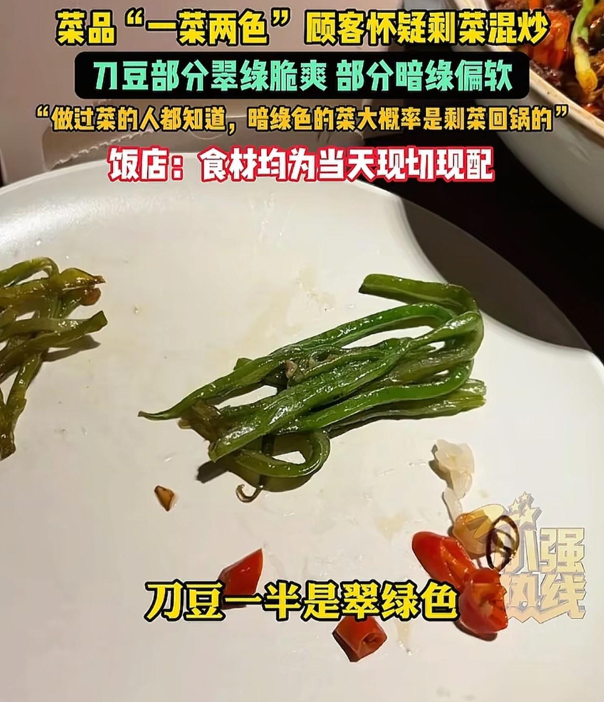 上海一妹纸在巡湘记点菜,回来发现刀豆颜色不一样了。 一半翠绿脆生生的,另一半暗绿软趴趴,还特别油。她当场就怀疑了,觉得是店家把隔顿剩菜混炒了端上来。 找店家理论后,那道菜给免单了。店员说锅底有酒精块一直烧着,妹子上厕所那会儿没人翻动,底下部分烧久了自然变色变软。他们强调食材都当天新鲜准备,剩菜一律员工吃掉,不可能卖给客人。 有人信这解释,说做厨师的都知道受热不均很常见。也有人觉得光嘴上说没用,最好能调监控或者现场还原一下。 这事闹上网了,不少网友跟着讨论。不管咋说,吃出差别确实容易让人多想。