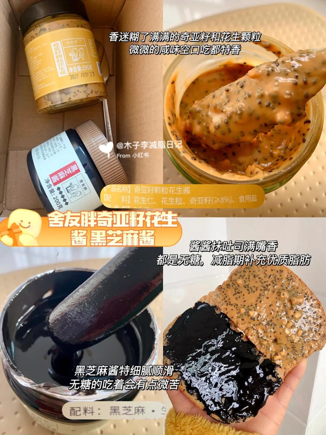 减脂期怎么能少的了优质脂肪呢,奇亚籽花生酱➕黑芝麻酱,配料干净无糖!香味hin浓郁,抹吐司双拼满嘴香,花生酱微咸口还有奇亚籽咯吱咯吱的简直了~黑芝麻就是一个字香还能养头发!养生又美味!
