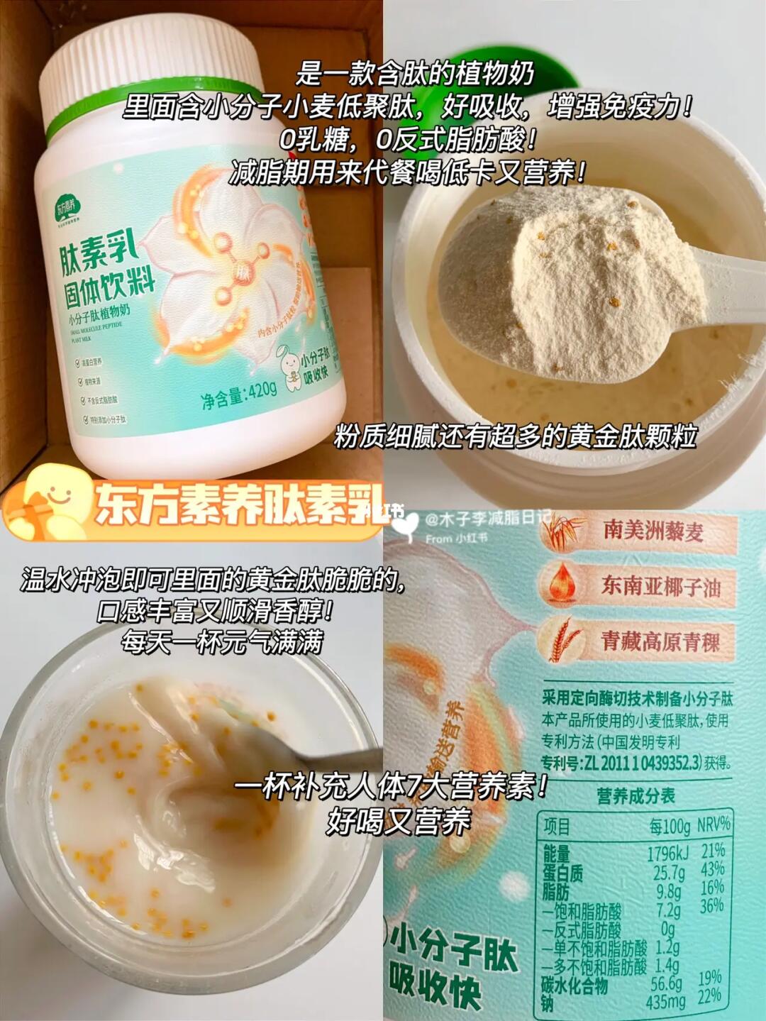 植物小分子肽 吸收快,营养全面,0乳糖,0反式脂肪,减脂期和乳糖不耐受也能喝,里面的黄金肽颗粒脆脆的口感丰富又香醇顺滑~熬夜党,学生党来不及吃早餐冲一杯营养补充让你元气满满!