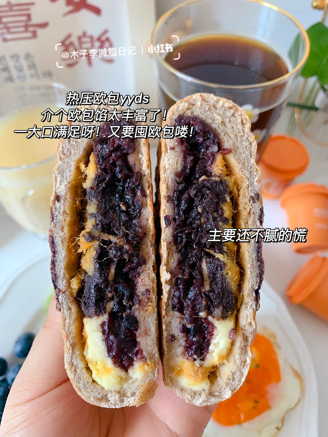 🍳早餐:每日一杯自律豆浆粉➕美式黑咖啡➕紫米肉松欧包➕猕猴桃➕煎蛋➕蓝莓