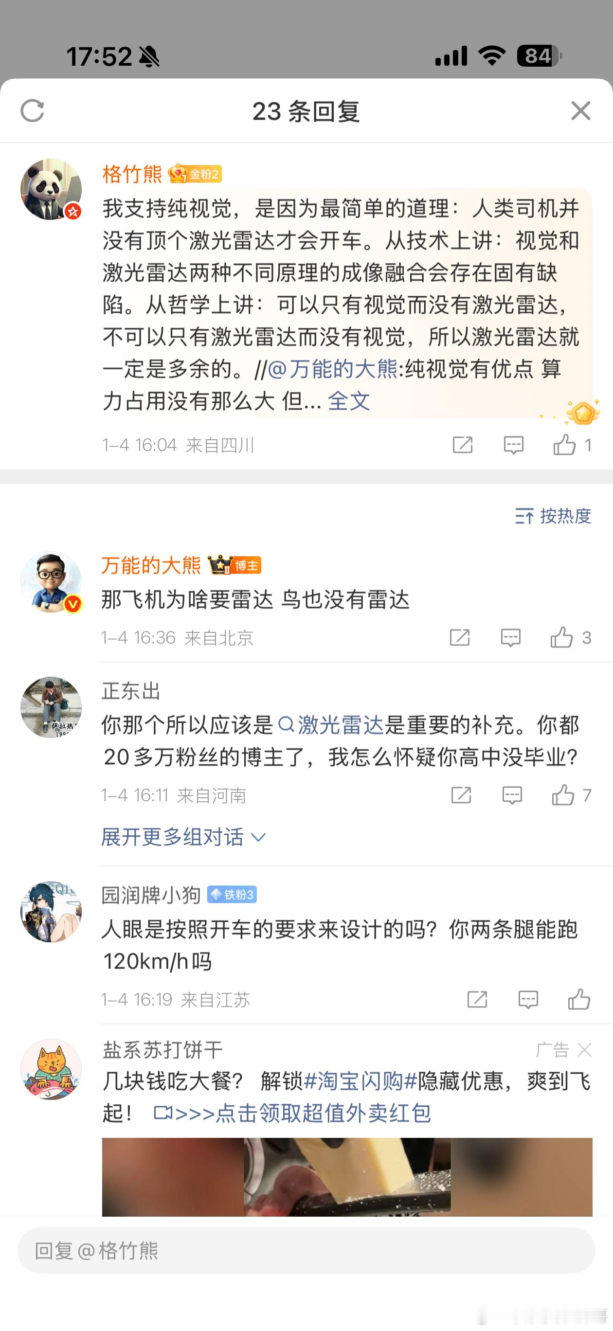 大熊老师又出来秀了就雷达那信息密度和摄像头都不在一个量级,怎么可能雷达要求的算力比视觉高呢?即使现阶段也是视觉为主雷达为辅,用来测距的啊至于为什么飞机用雷达,鸟不用,因为飞机飞的更快啊,飞的快,路况简单,雷达是最合适的方案啊。只需要测距就够了啊,雷达检测范围大。他不需要知道那里是个什么东西。但是车不同,车的速度没有那么快,也不需要精确的距离。但是需要精确的分辨道路信息啊,比如人站在那里,我需要知道这是一个人还是一棵树啊。我要对他的行为做出预判。我要看前车打没打灯,要不要转向,红绿灯是什么颜色,我前面悬空障碍物是什么,到底是塑料袋,还是一个挂车车尾。为什么说不需要精确的车距,我跟车的时候只要保持在 100 米就够了,至于是 110 还是 90 米有区别吗?我刹车距离在 40 米,那我留了 60 米冗余就够了啊,我为什么要精确到 40 米刹停呢?就像停车的时候,我只需要保证我不撞墙就行,我需要把车位停的紧挨着墙吗?过马路的时候,我只要看一眼就知道车速快不快,我需要精确的计算距离和我的速度能不能过去吗?我直接停下去等他先走不就好了?当你留有足够冗余的时候,雷达的优势到底发挥了什么作用?你需要把距离控制到极限吗?那是不是用起来太激进,太危险了呢?万一有个变量不就导致事故了?既然不需要极限,那雷达的用处是什么?你要知道,车子本身还是受限于物理限制的。至于说视觉不能雨天雾天开车就更搞笑了,雷达是依靠反射的,颗粒物会导致反射异常。视觉不行,雷达也不行。雨天纯视觉不行,不是因为下雨,是因为雨刮器刮太快了不信的话把雨刮器停了,看看能不能正常使用。而且我也不明白,为什么视线范围这么差还要开车或者开快车,你能保证自己看到别人,你能保证别人看到你吗?这不是跟上车睡觉一个道理吗,为什么要宣传危险驾驶?