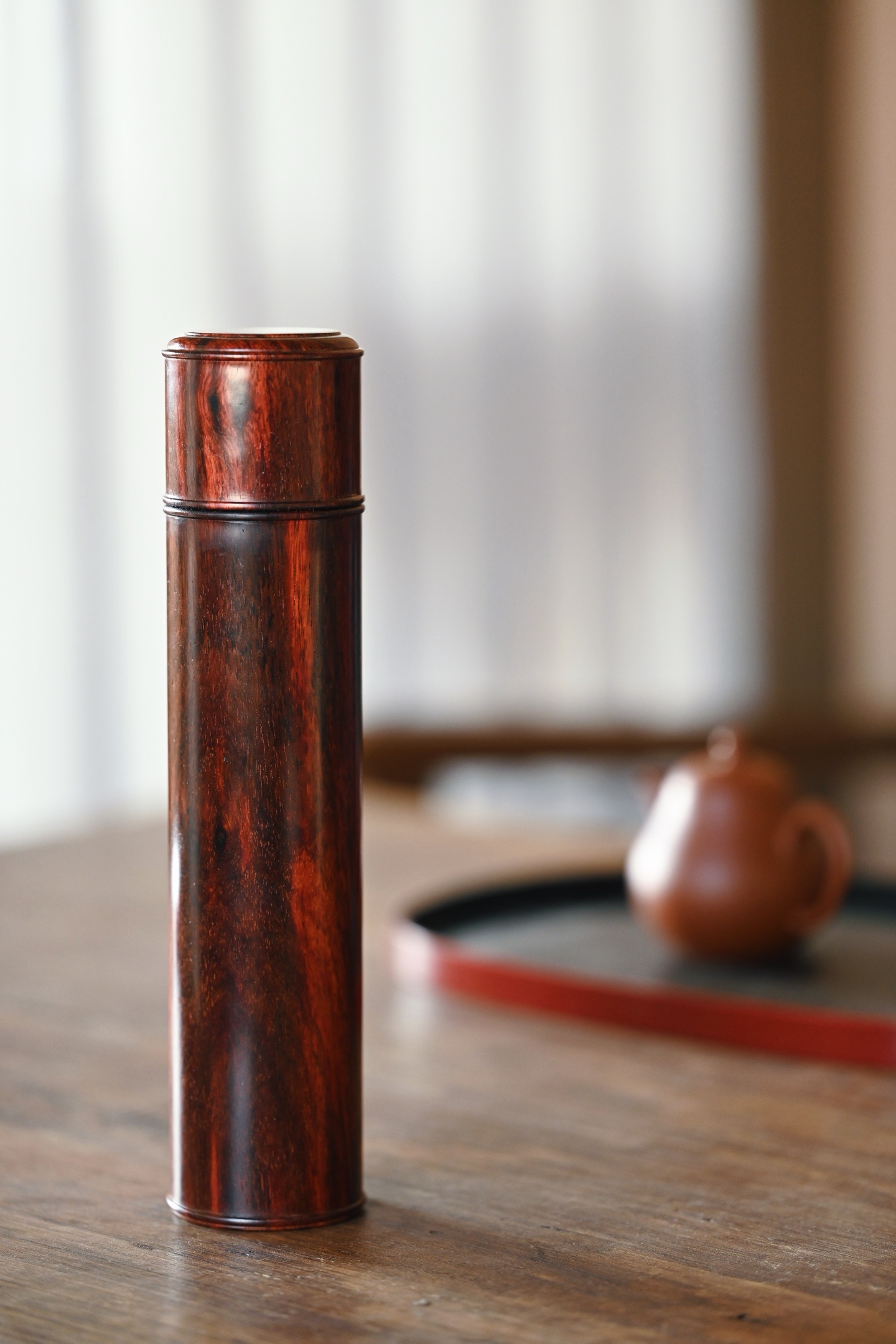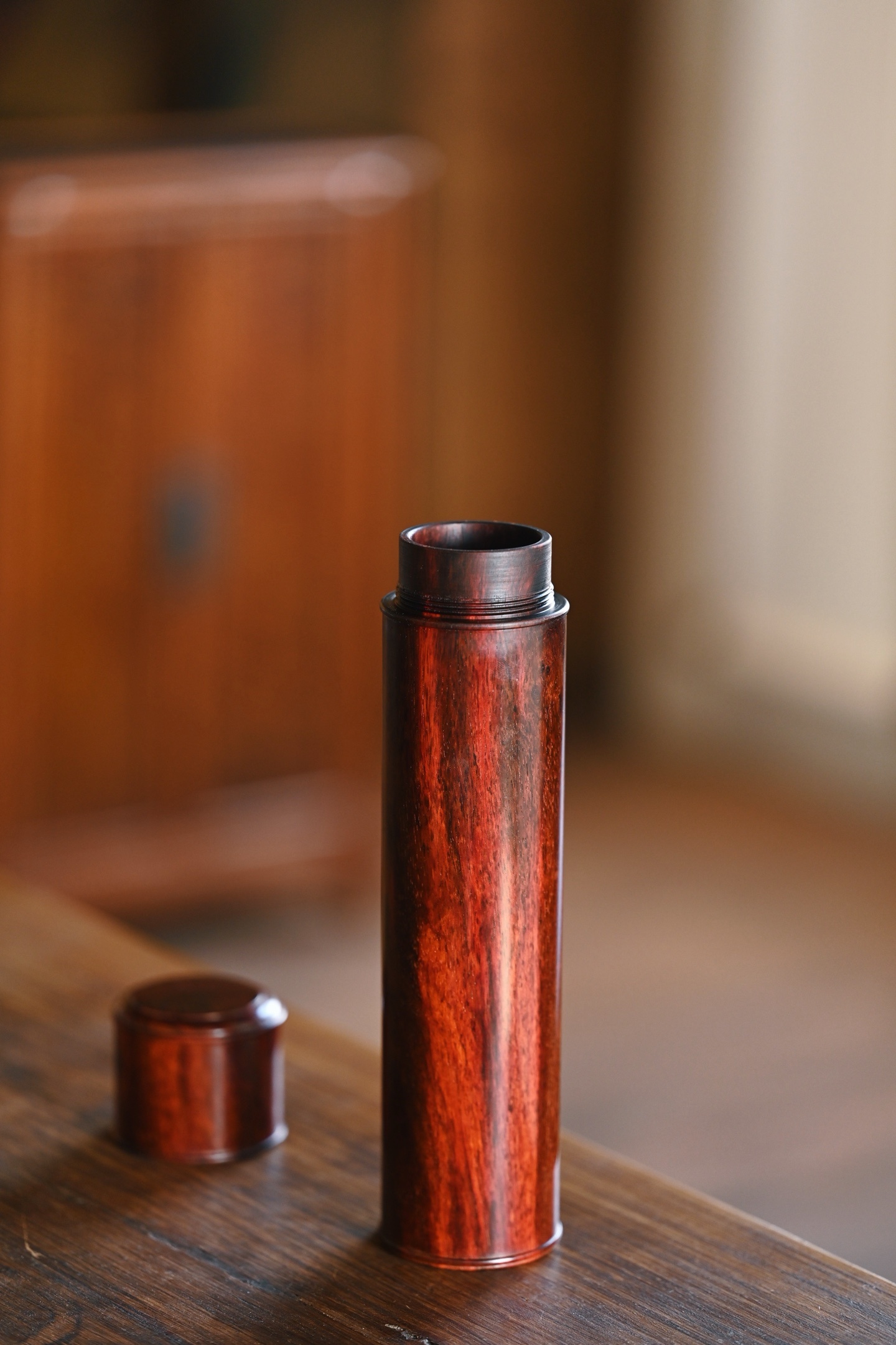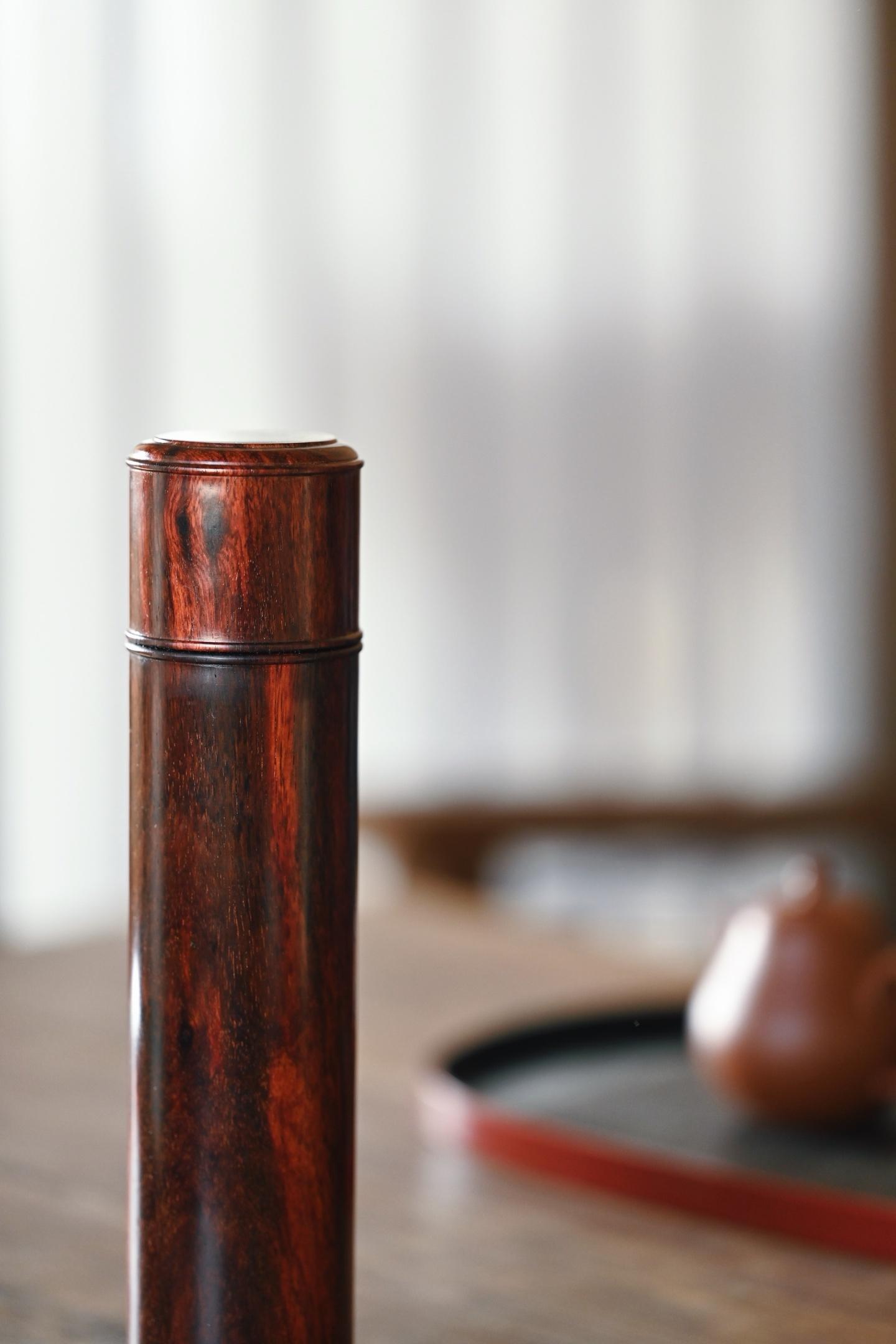 小叶紫檀 | 存香筒 紫檀老料制作,形式古朴,光素无雕,尽品木纹本色,螺旋式结构,可装线香便于取用。5.2*5.2*23cm 233g