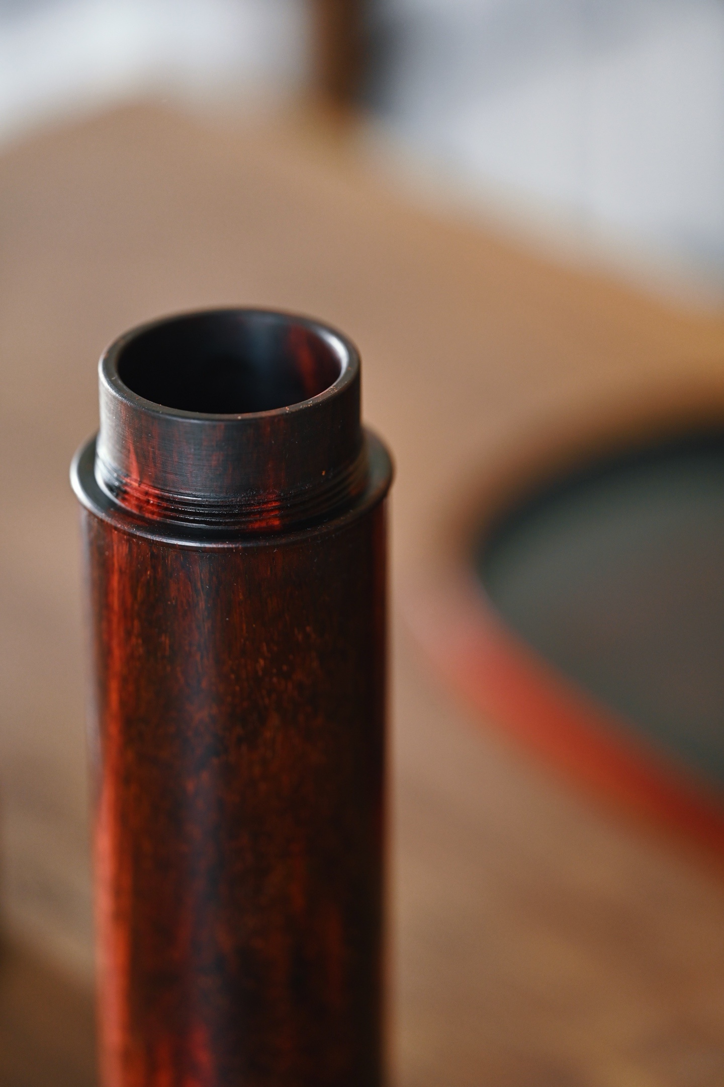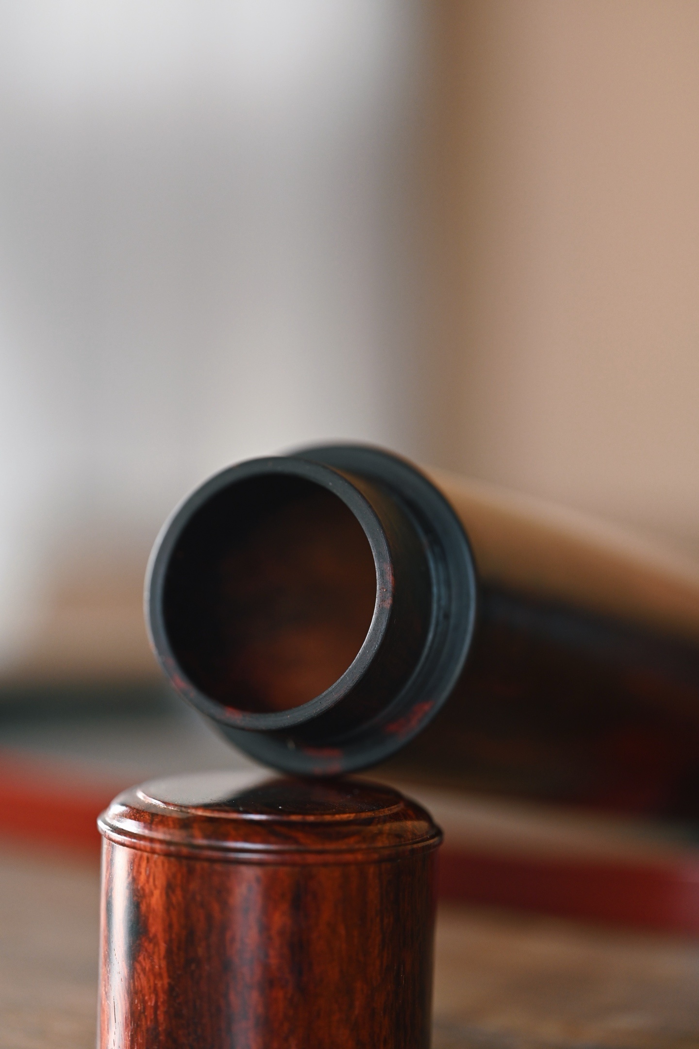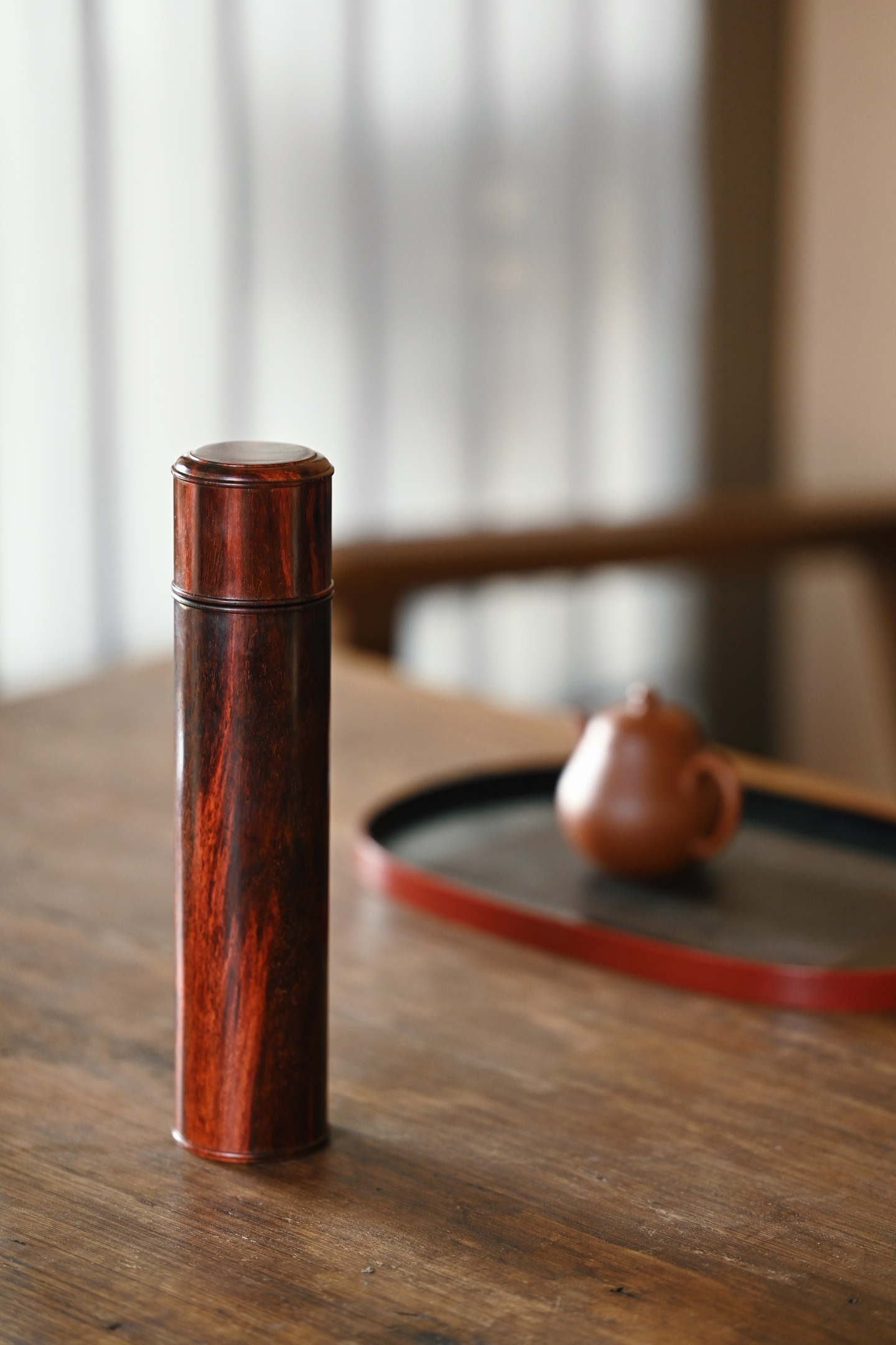 小叶紫檀 | 存香筒 紫檀老料制作,形式古朴,光素无雕,尽品木纹本色,螺旋式结构,可装线香便于取用。5.2*5.2*23cm 233g